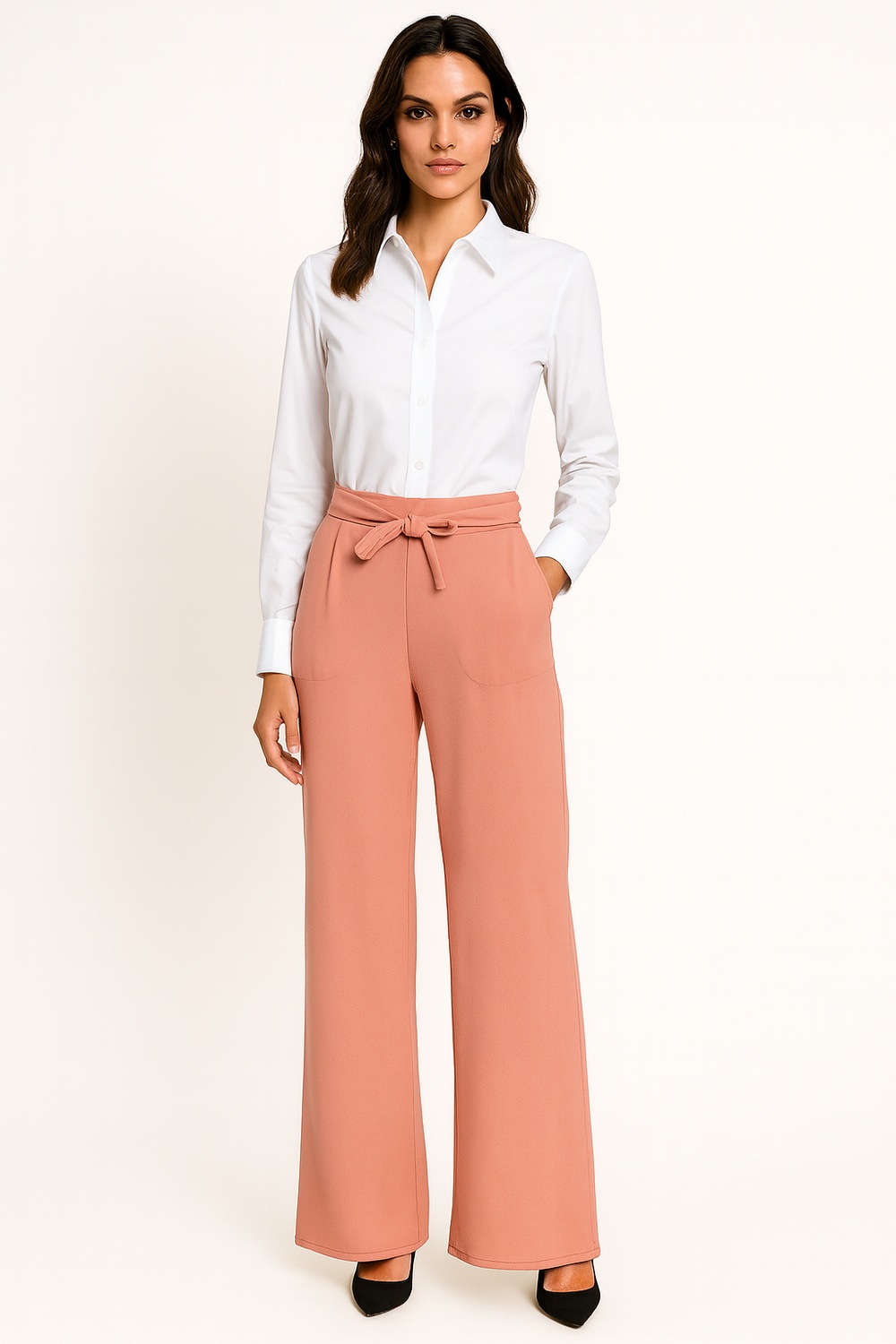 Pantalón de tiro alto con pierna amplia que ofrece movimiento y comodidad, pretina con lazo integrado para ajuste personalizado, bolsillos laterales funcionales que aportan practicidad, largo a tobillo que estiliza la silueta, confección en tejido suave con estructura ligera que mantiene la forma durante el uso