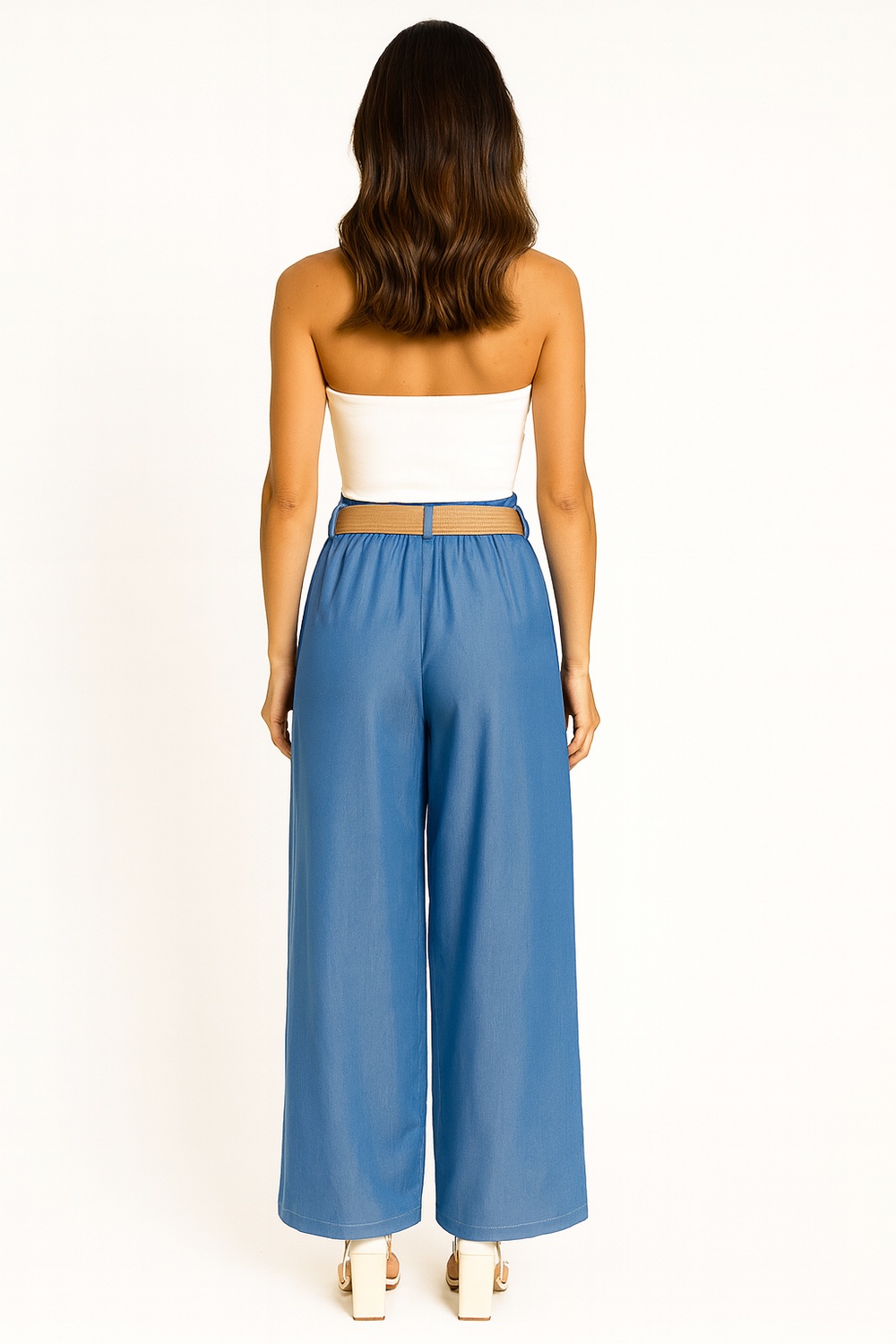 Pantalón de tiro alto con pretina ancha y lazo integrado que aporta ajuste cómodo, corte amplio que brinda movilidad y caída ligera, pinzas al frente que estructuran la silueta, confección en tejido suave de sensación fresca, terminado limpio en bastilla para un look pulido