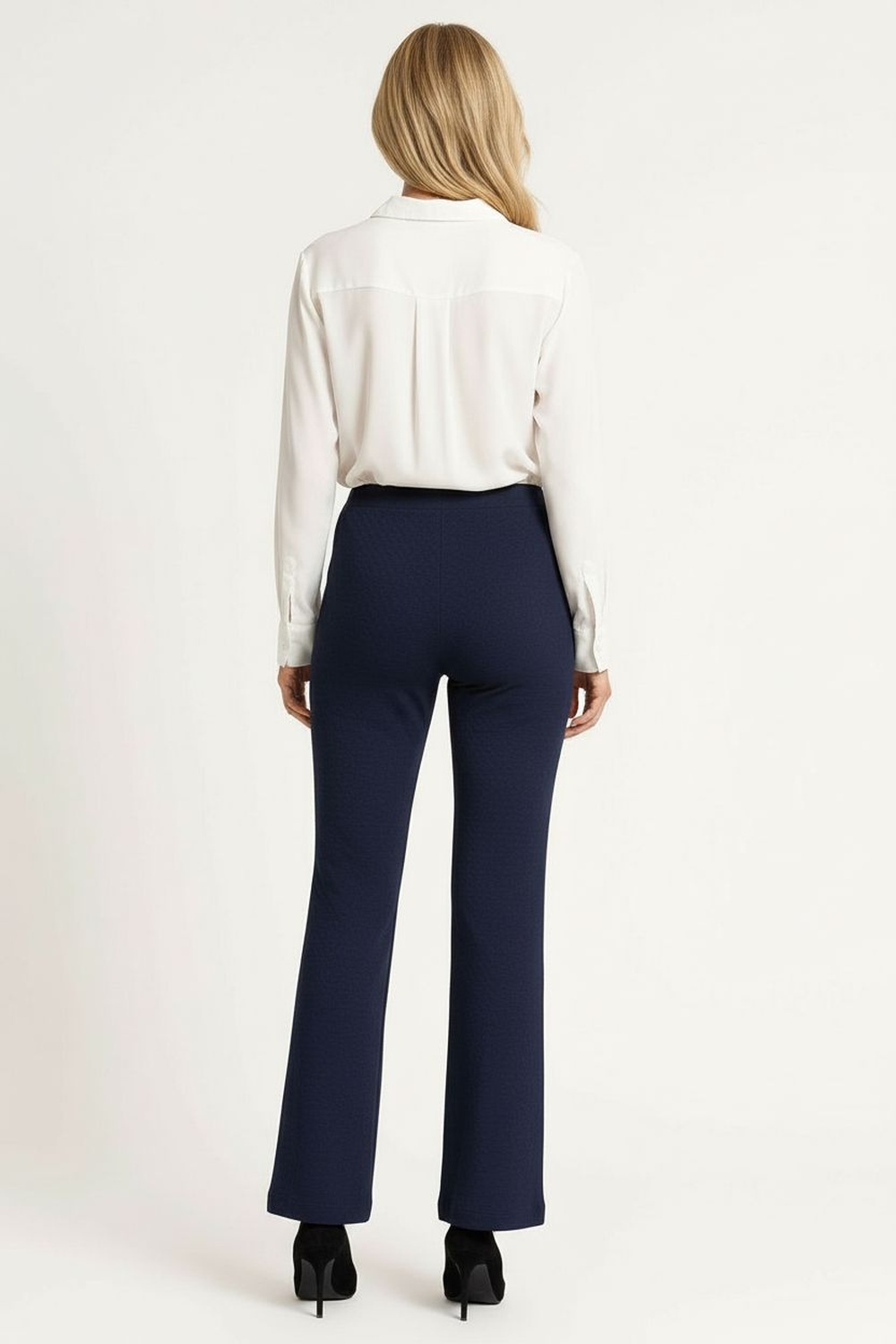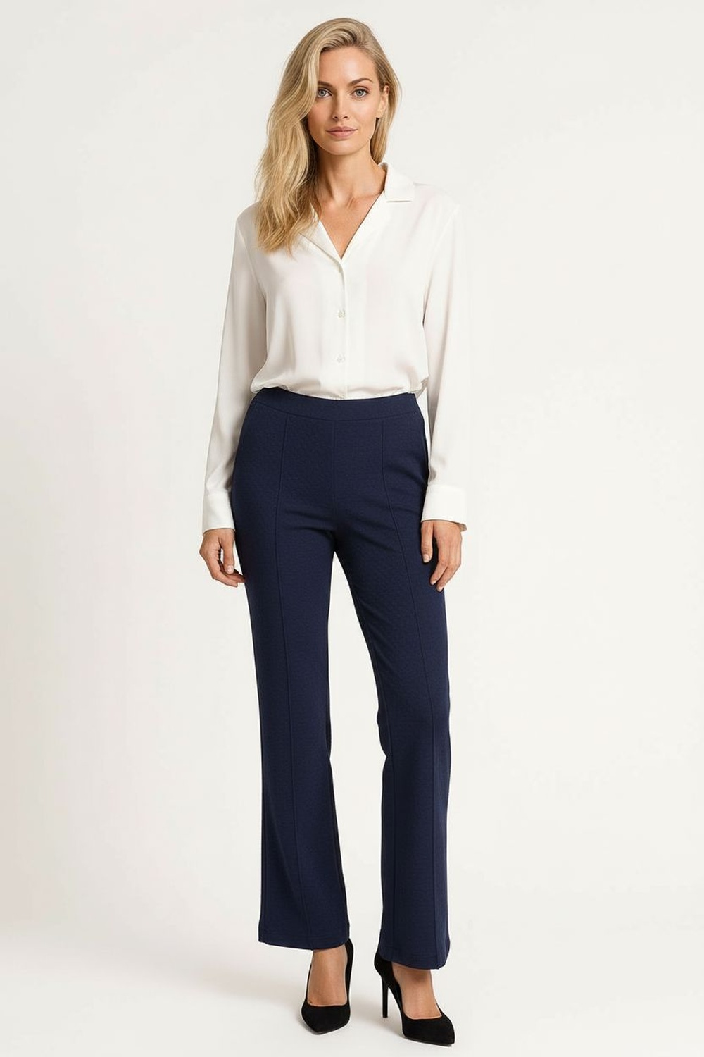 Pantalón de tiro medio con pretina lisa que ofrece ajuste cómodo, corte recto con amplitud en pierna, bolsillos laterales funcionales, largo completo con caída continua, confección en tejido estructurado que mantiene la forma