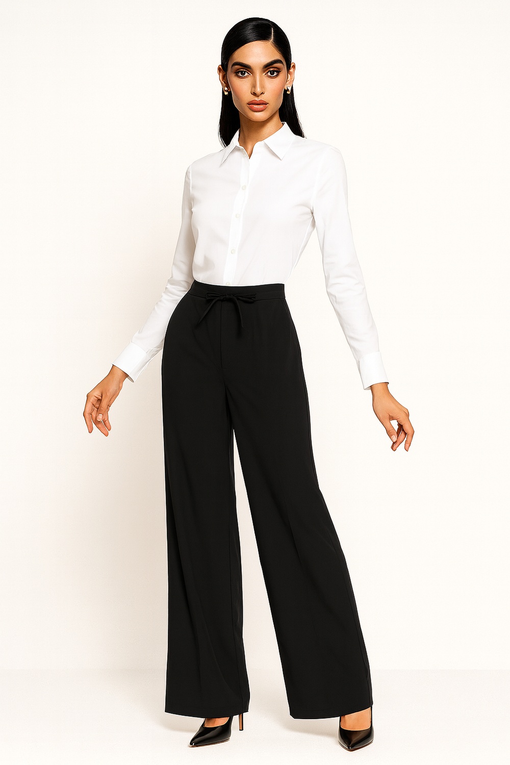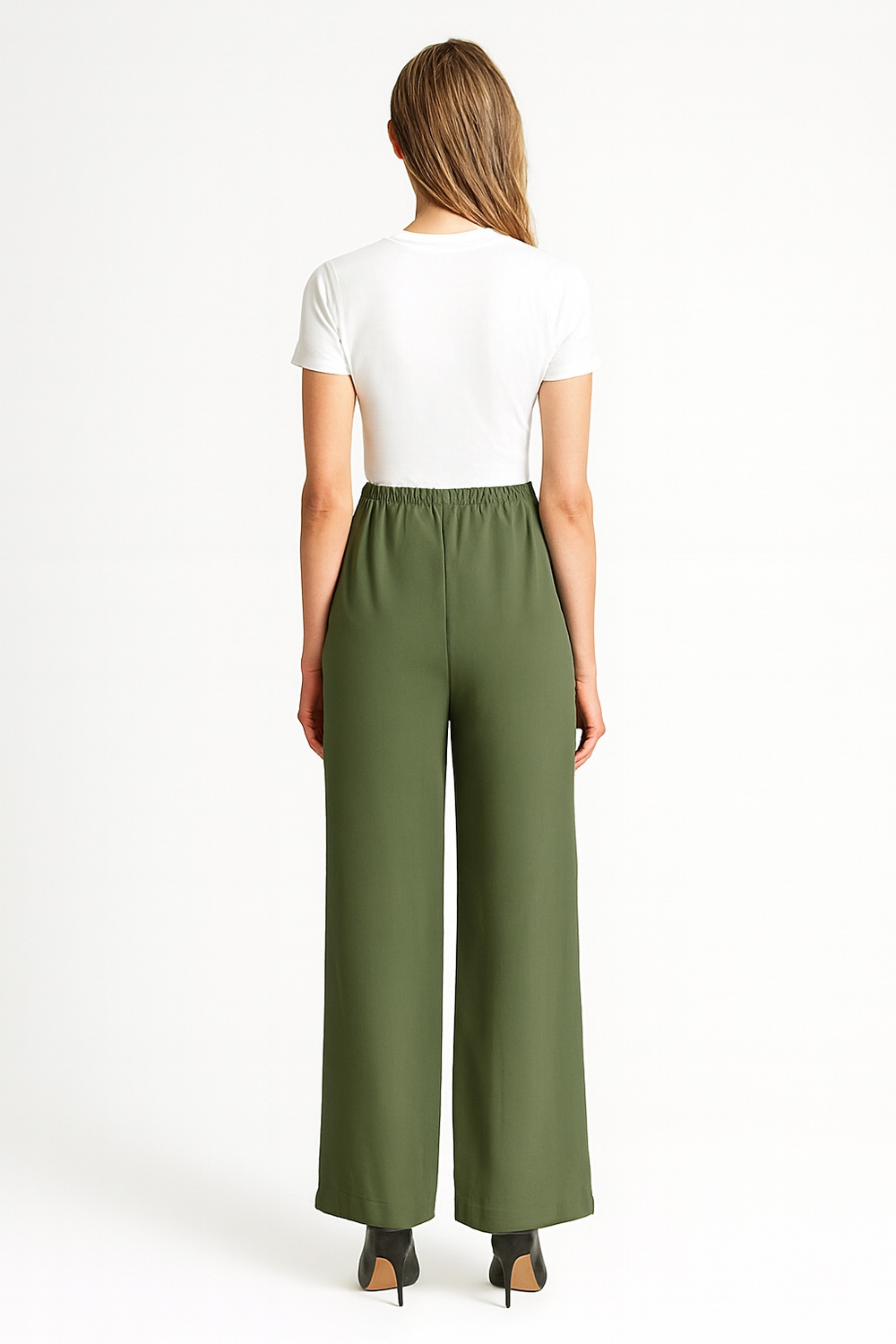 Pantalón de tiro medio con pretina elástica y jareta ajustable, pinzas frontales que aportan estructura, caída fluida con corte recto que ofrece comodidad y movimiento, bolsillos laterales funcionales y acabado suave al tacto