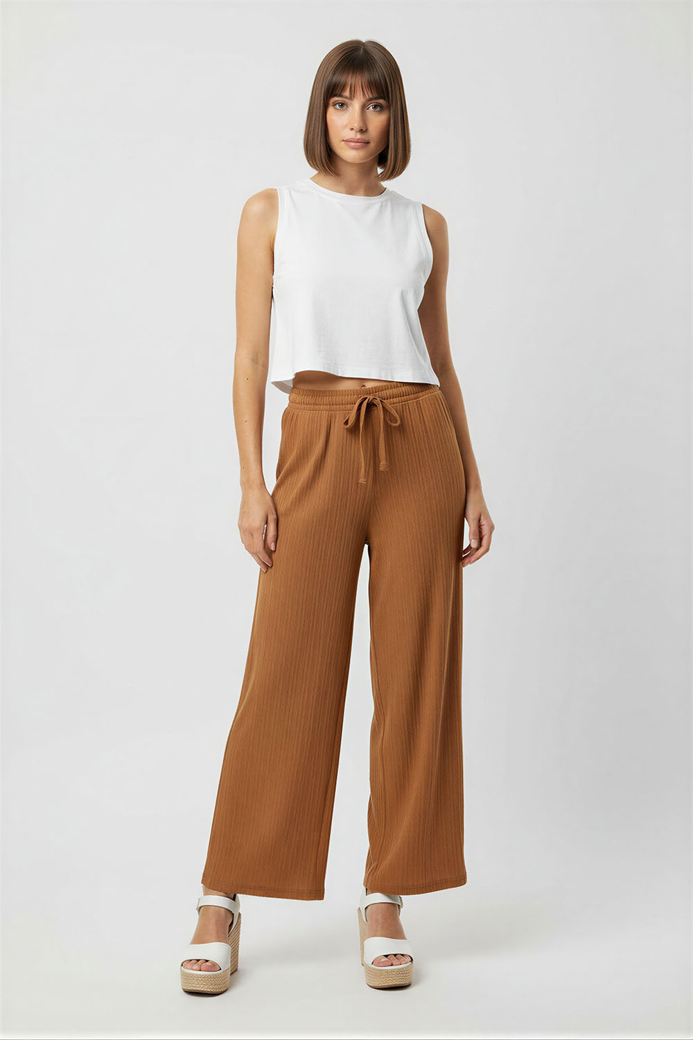 Pantalón de tiro medio con pretina elástica y jareta funcional que permite ajuste personalizado, corte amplio que brinda comodidad y fluidez al caminar, diseño con caída recta que aporta equilibrio en la silueta, confección en tejido ligero que favorece frescura