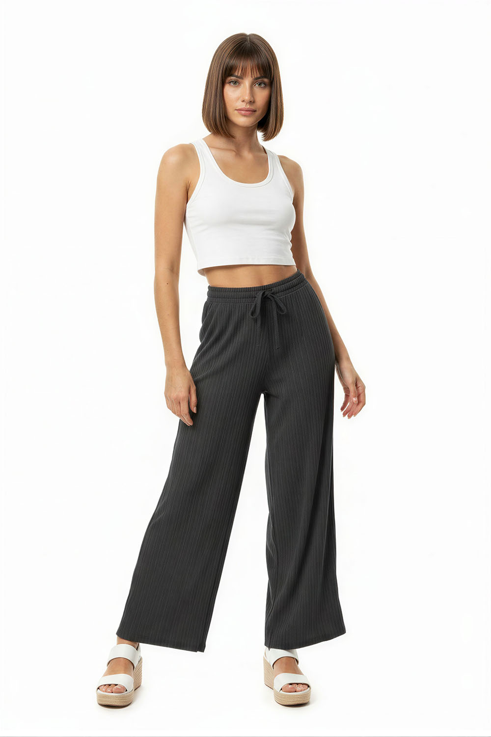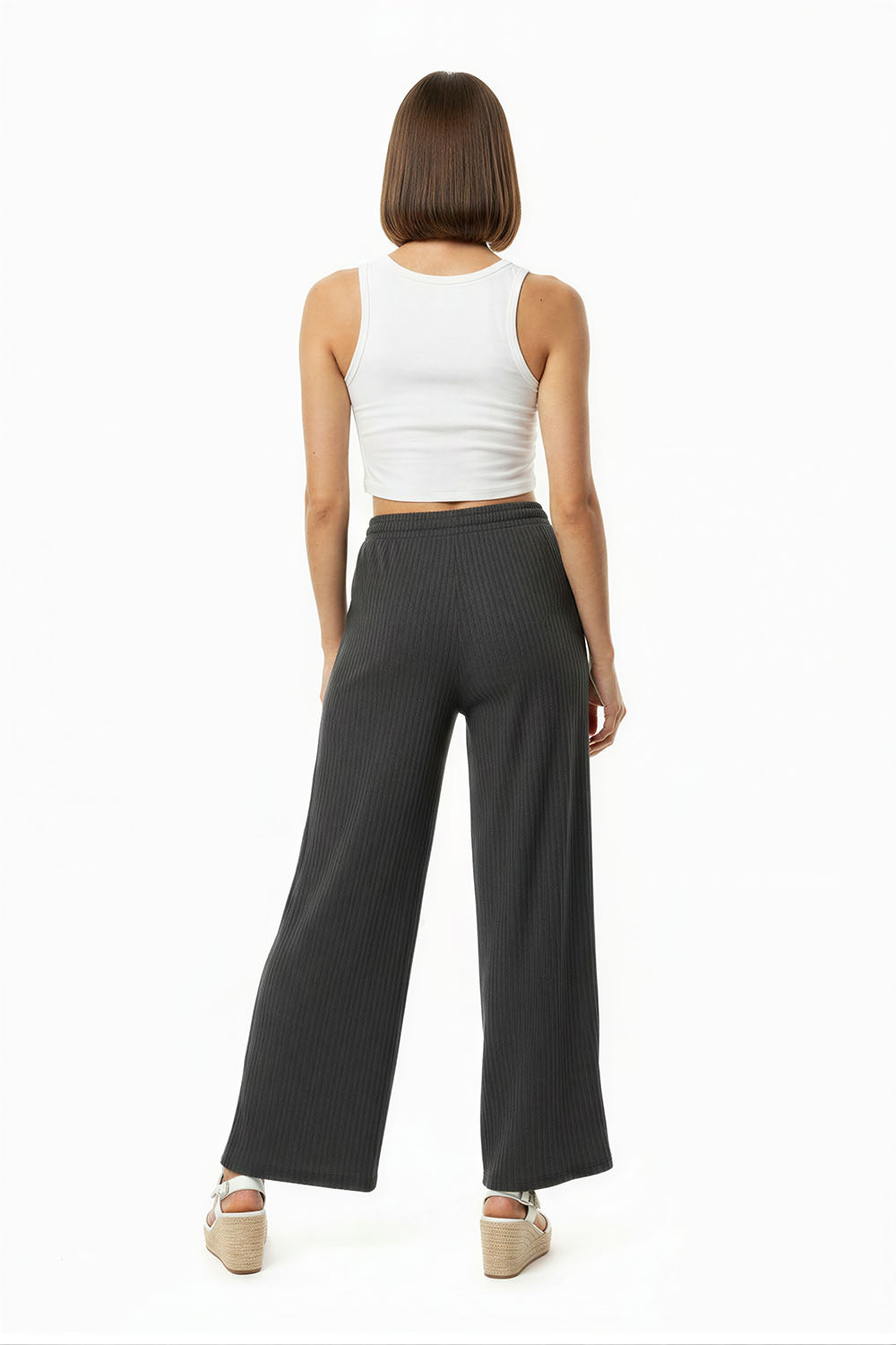 Pantalón con pretina elástica y jareta ajustable al frente, corte entallado en cadera con apertura gradual en bajo tipo campana, largo completo que estiliza la pierna, confección suave con caída fluida y terminación limpia