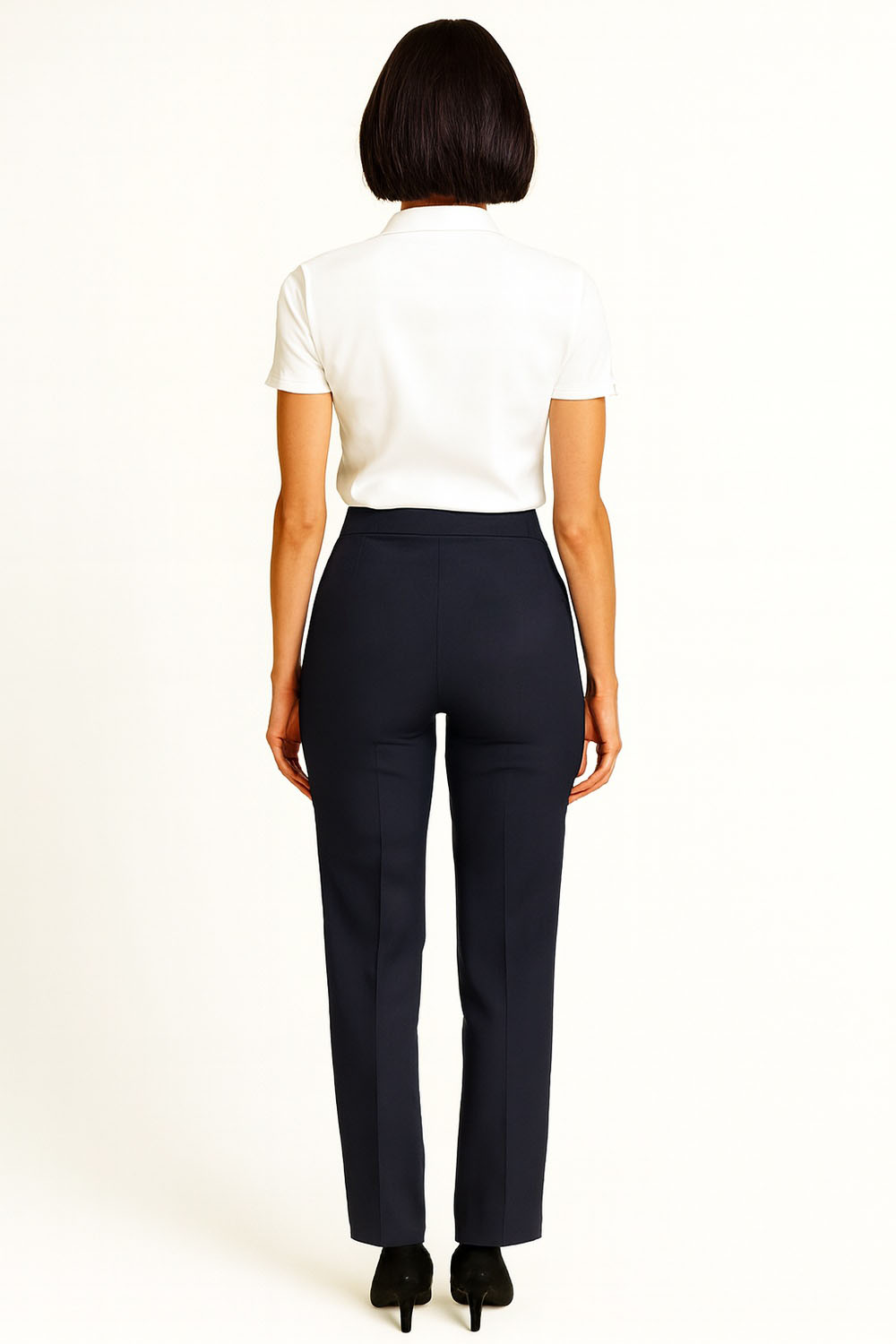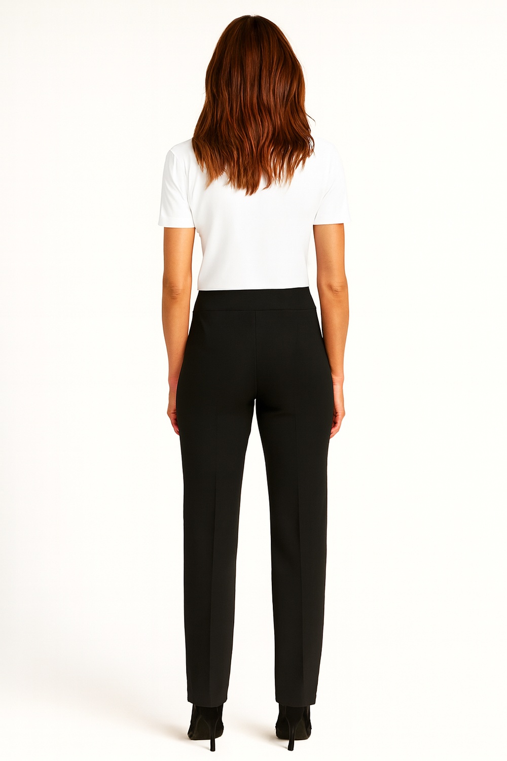 Pantalón de tiro alto con pretina ancha y detalle de tres botones al frente que estiliza la cintura, pinzas delanteras que mejoran la caída y aportan estructura, corte recto que alarga visualmente la figura, bolsillos laterales discretos que brindan funcionalidad, confeccionado en tejido suave con elasticidad moderada que ofrece confort y libertad de movimiento, acabado limpio que conserva su forma tras cada uso