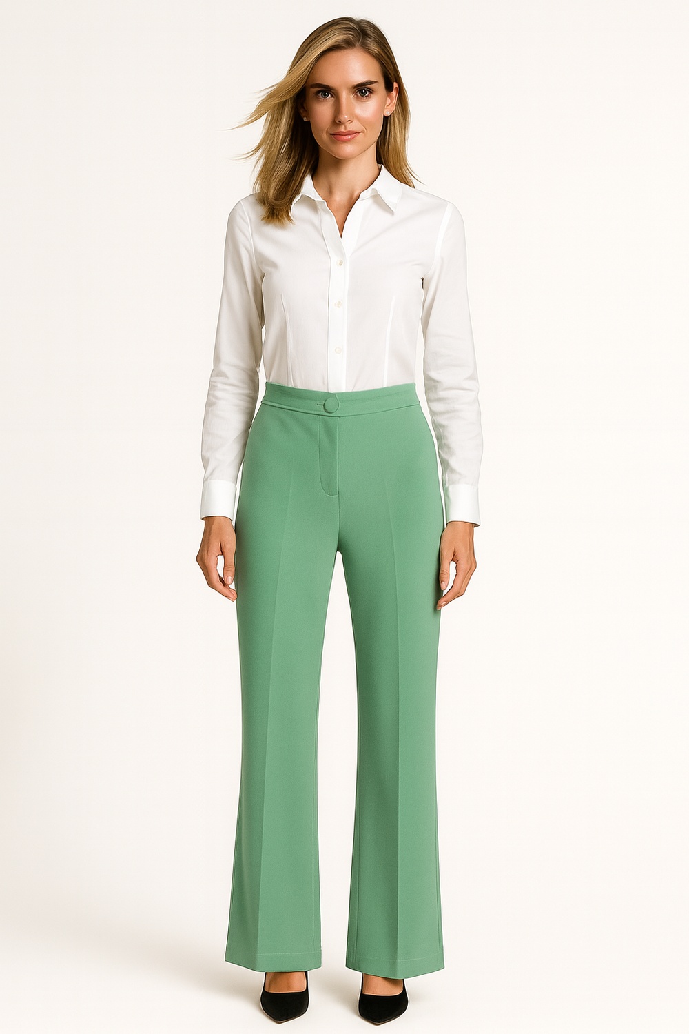 Pantalón de tiro medio con corte recto que mantiene una línea limpia y equilibrada, bolsillos laterales discretos que aportan funcionalidad, cierre frontal con botón y cremallera para ajuste seguro, largo completo que estiliza visualmente, confección en tejido estructurado de tacto suave que brinda comodidad prolongada