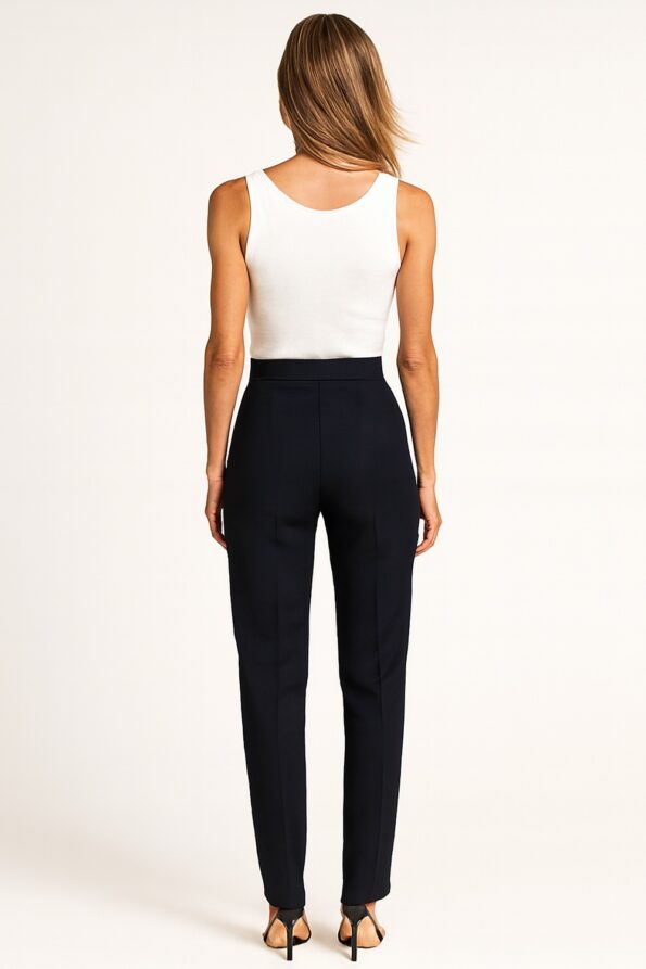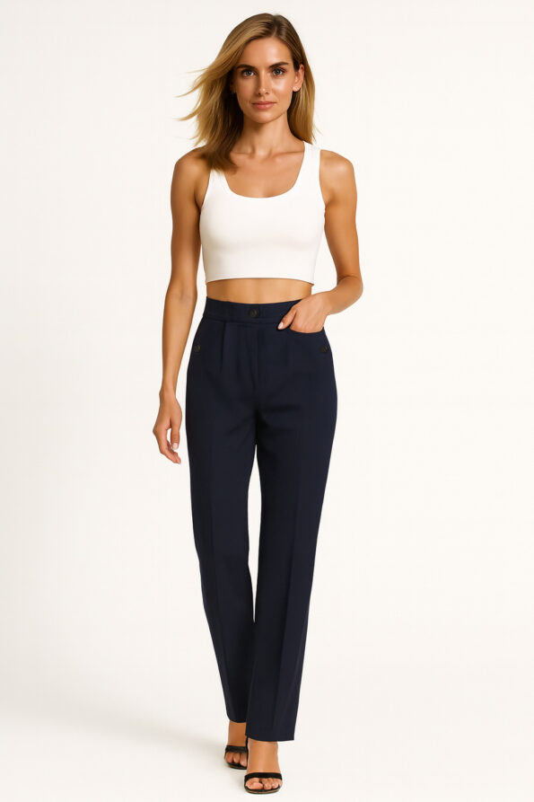 Pantalón de corte recto con pretina al contraste que aporta un detalle distintivo, tiro medio que asegura ajuste favorecedor, bolsillos laterales funcionales que brindan practicidad, confección en tejido suave con caída ligera que ofrece comodidad y movilidad, costuras reforzadas que garantizan durabilidad