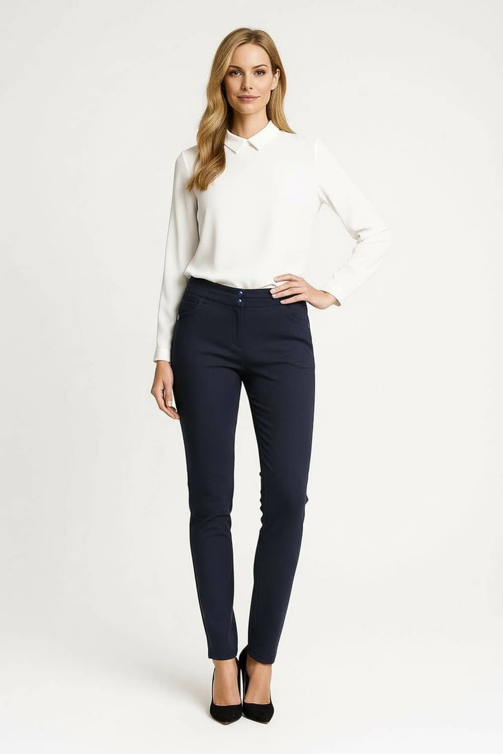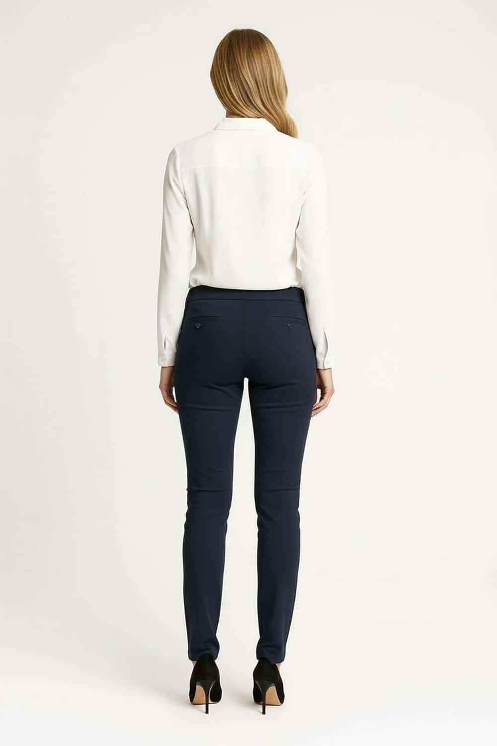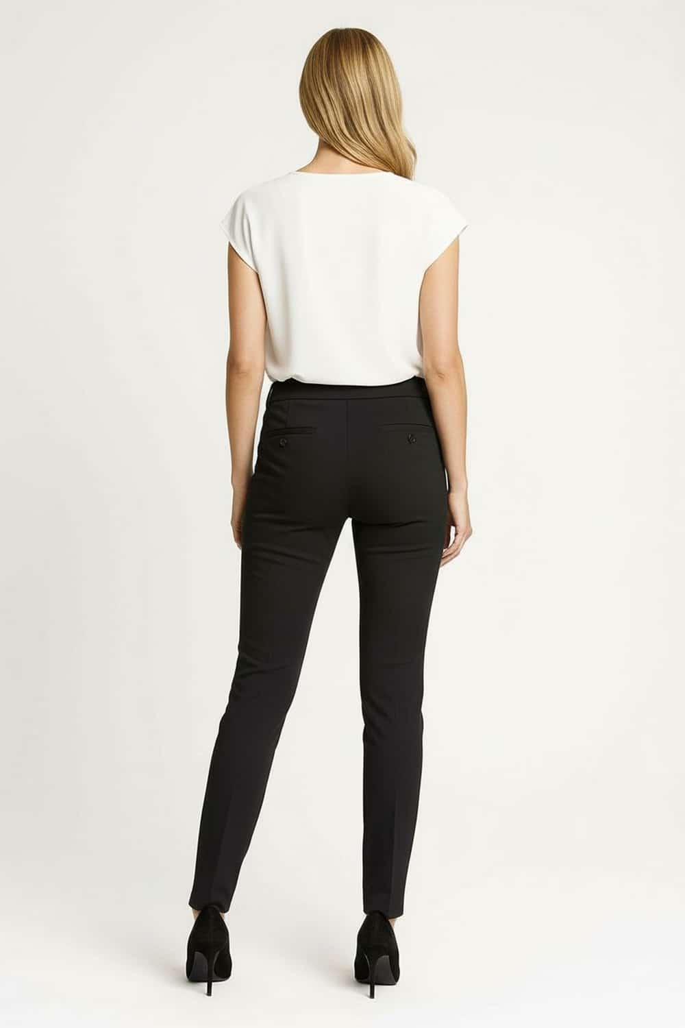 Pantalón de corte recto con pretina ancha y doble botón frontal, cierre oculto que aporta acabado limpio, bolsillos traseros funcionales, silueta entallada en cadera con pierna estilizada, confección estructurada que mantiene la forma durante el uso