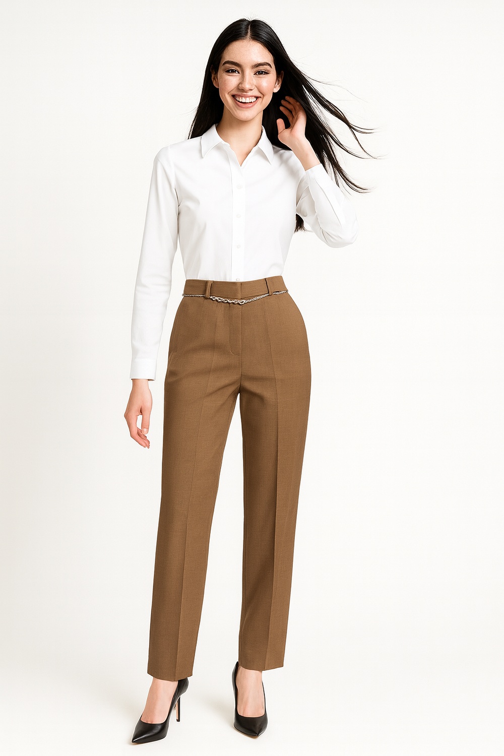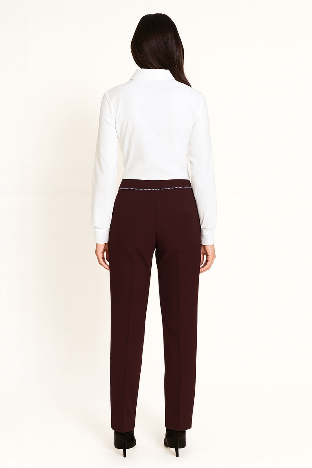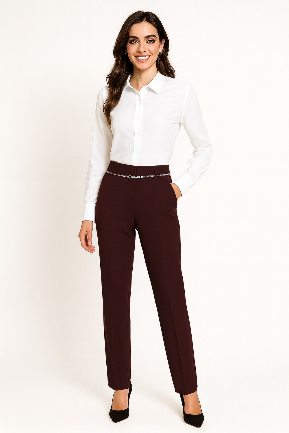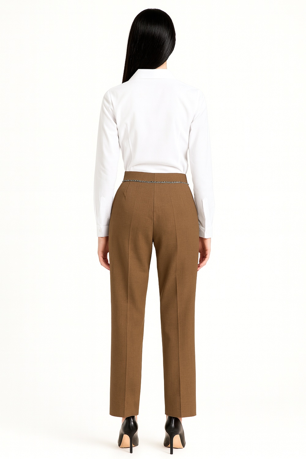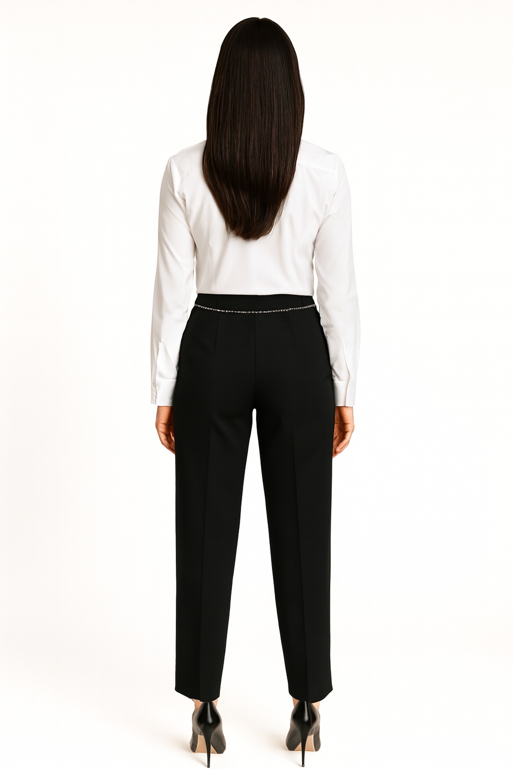 Pantalón de corte formal con pretina estructurada y cadena decorativa con perlas que aporta estilo refinado, pinzas delanteras que estilizan la silueta, cierre oculto y bolsillos funcionales, confección en tejido firme con tacto suave