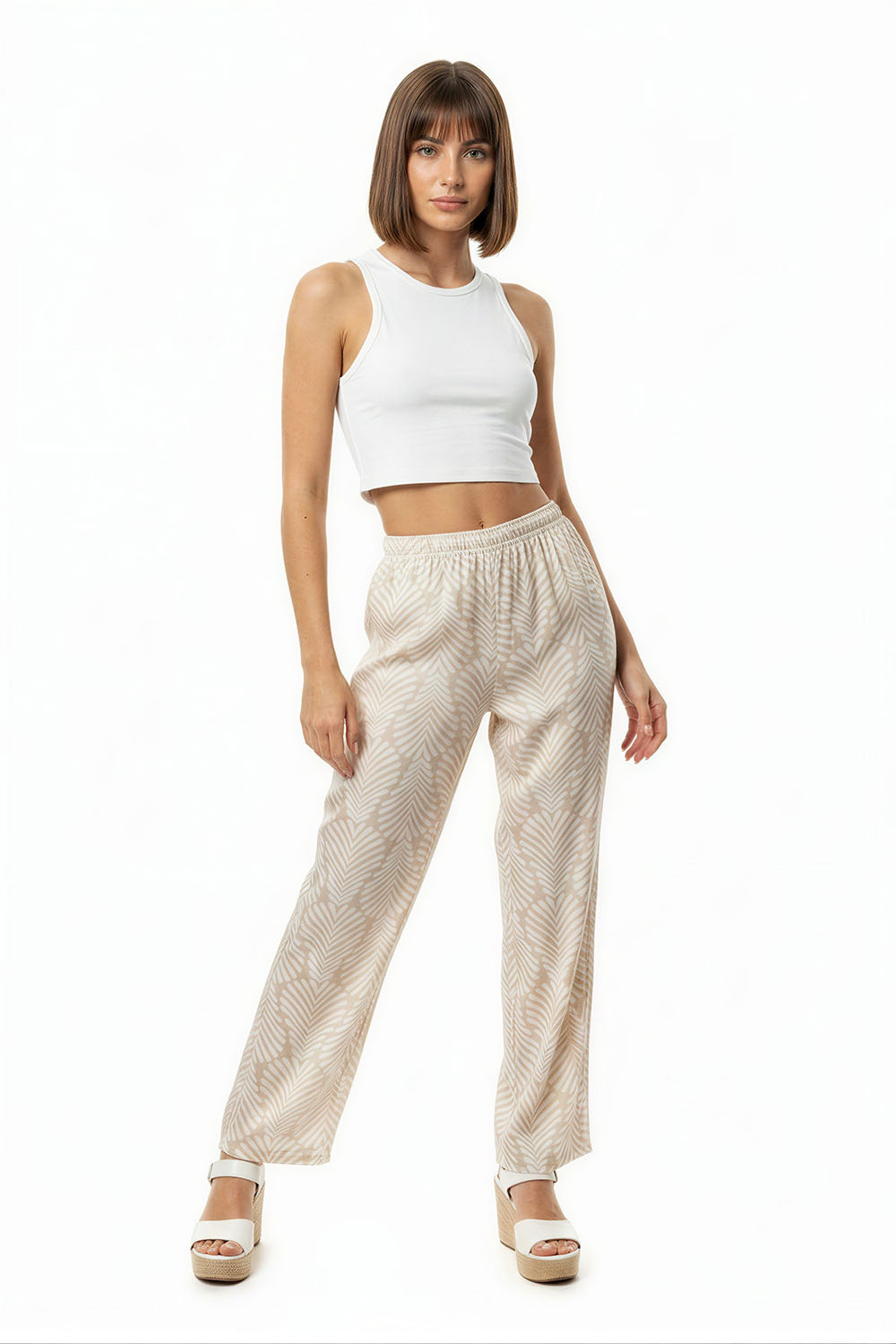 Pantalón de tiro medio con pretina elástica y jareta ajustable que ofrece mayor confort, corte amplio con caída fluida que estiliza las piernas y permite movilidad, confección ligera que aporta frescura en cada uso, terminado limpio en bastilla para un acabado pulido y versátil