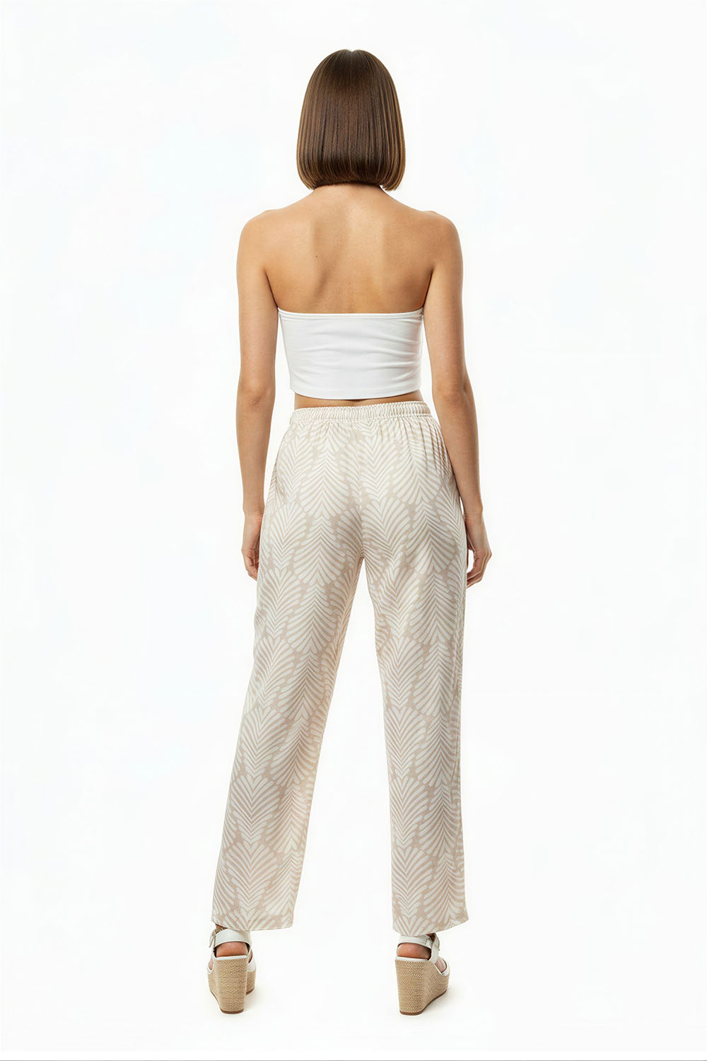 Pantalón de corte recto con jareta ajustable en cintura que proporciona sujeción personalizada, diseño de pierna ligeramente entallada hacia el tobillo, confección en tejido suave de caída ligera, largo al tobillo que aporta practicidad