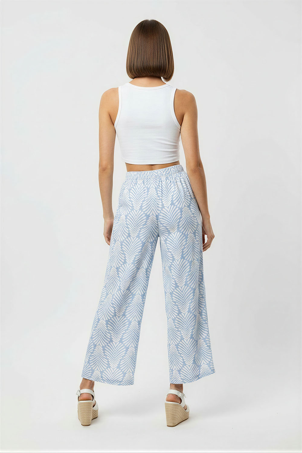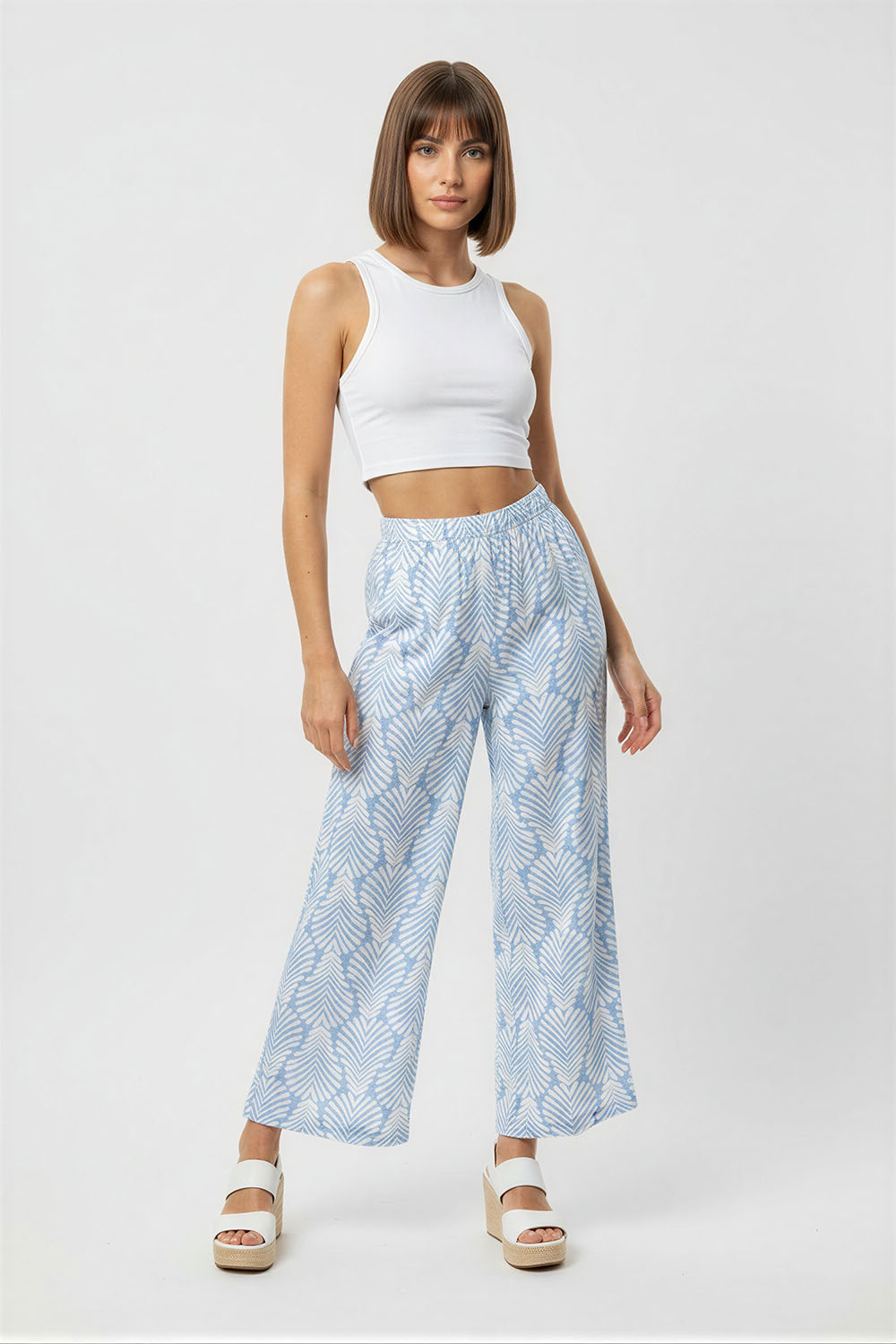 Pantalón tipo capri de corte amplio con largo debajo de la rodilla, pretina lisa que brinda ajuste firme, tiro medio que equilibra la silueta, diseño con caída fluida que aporta comodidad, confección ligera que facilita el movimiento
