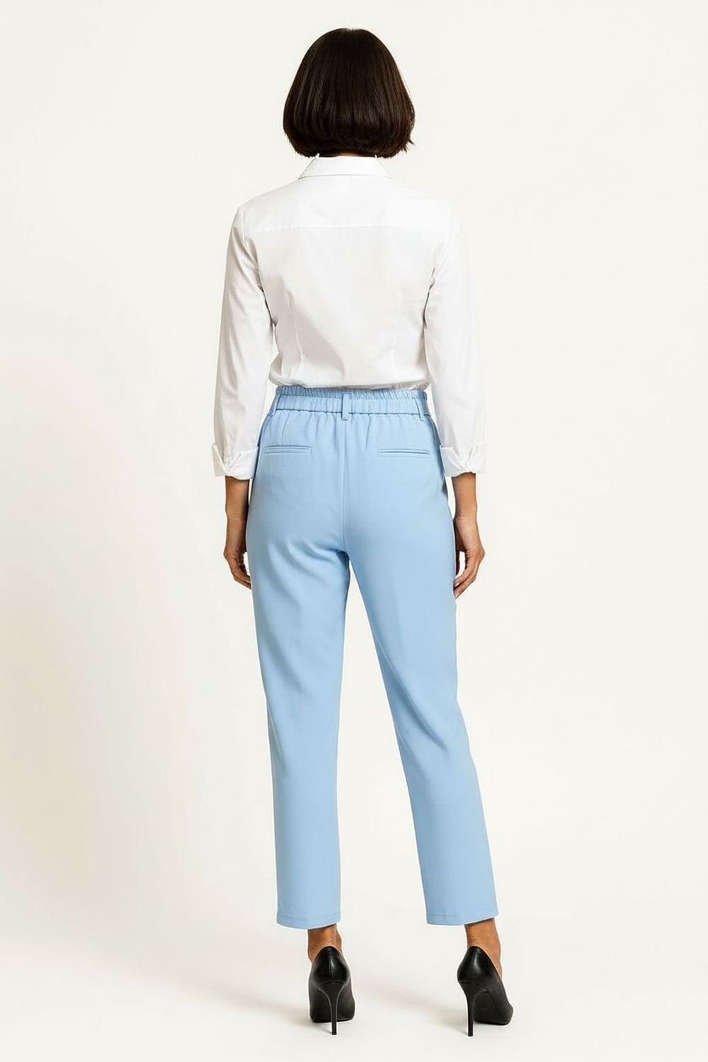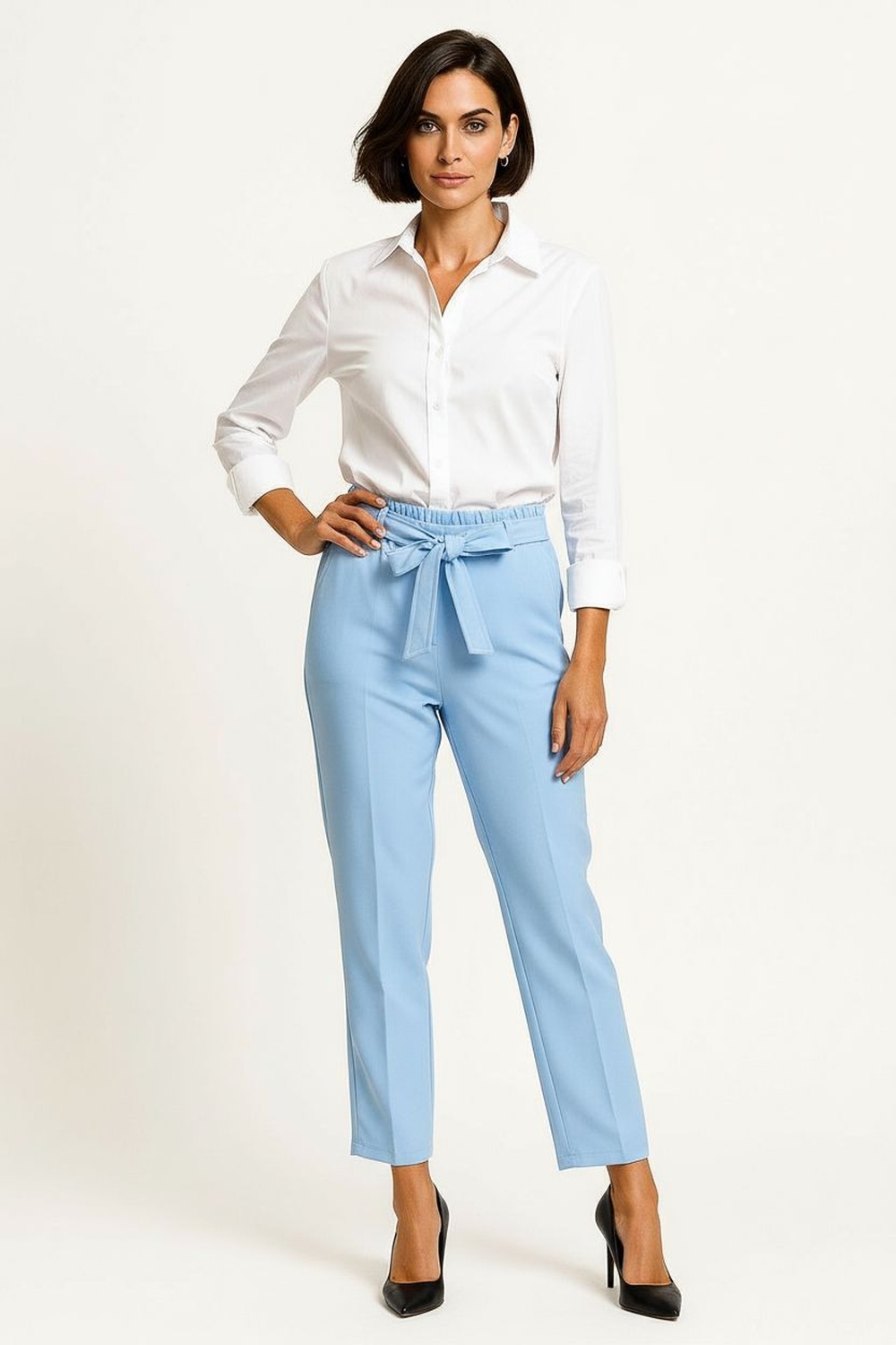 Pantalón de tiro alto con pretina ancha y cierre frontal con botón, confección en tejido estructurado que proporciona firmeza y comodidad, corte recto que estiliza las piernas, bolsillos laterales funcionales y pinzas posteriores que favorecen el ajuste en la cintura