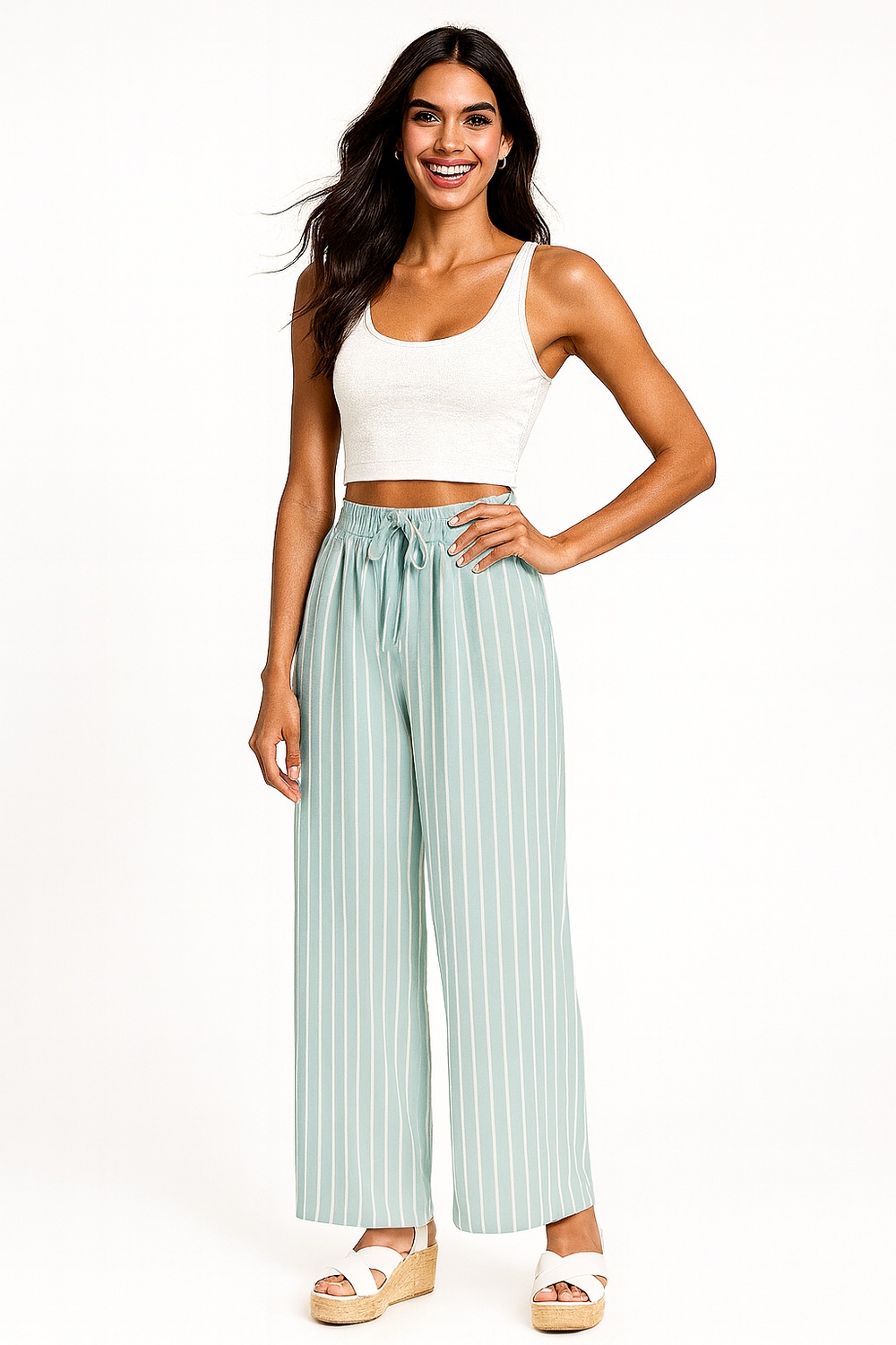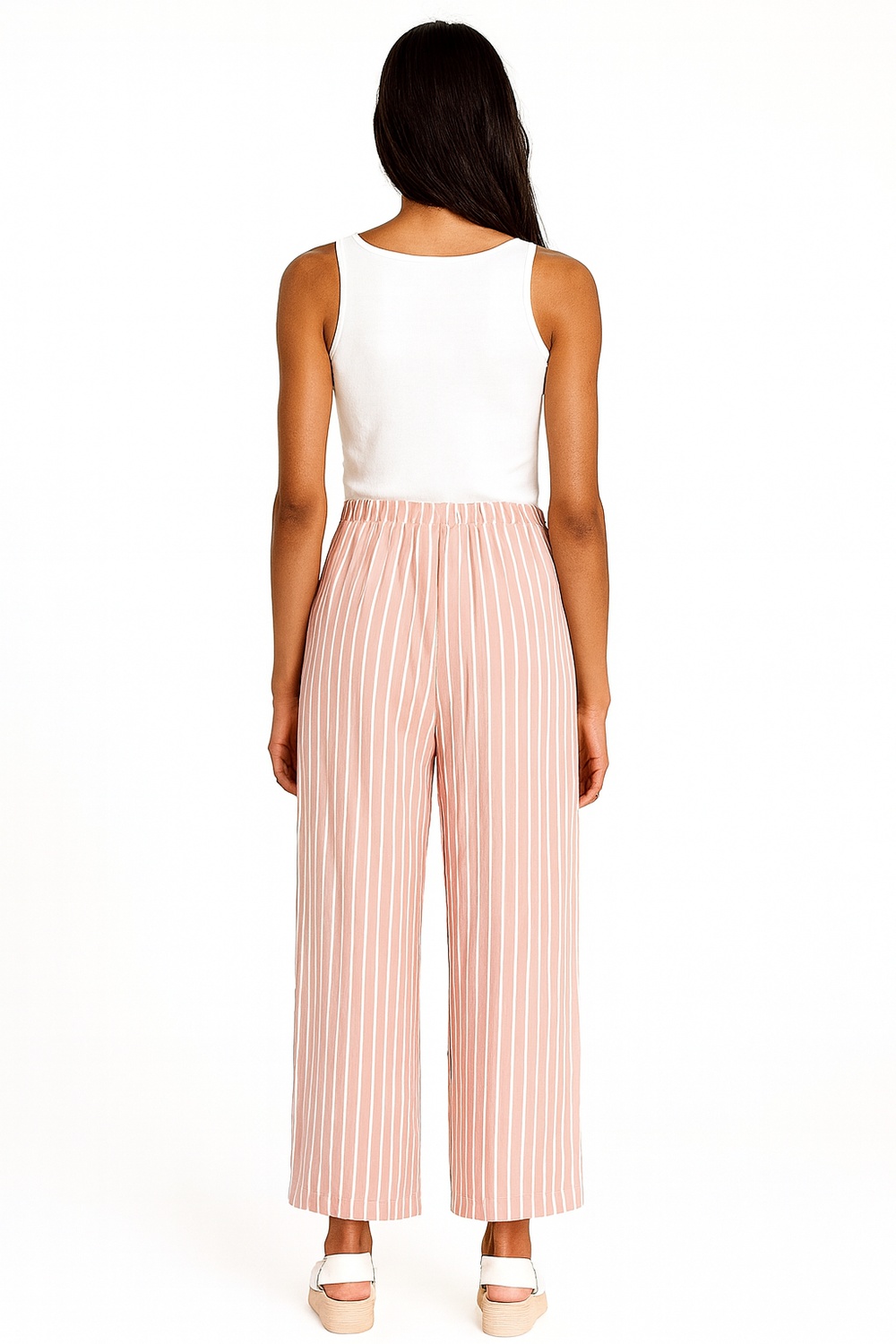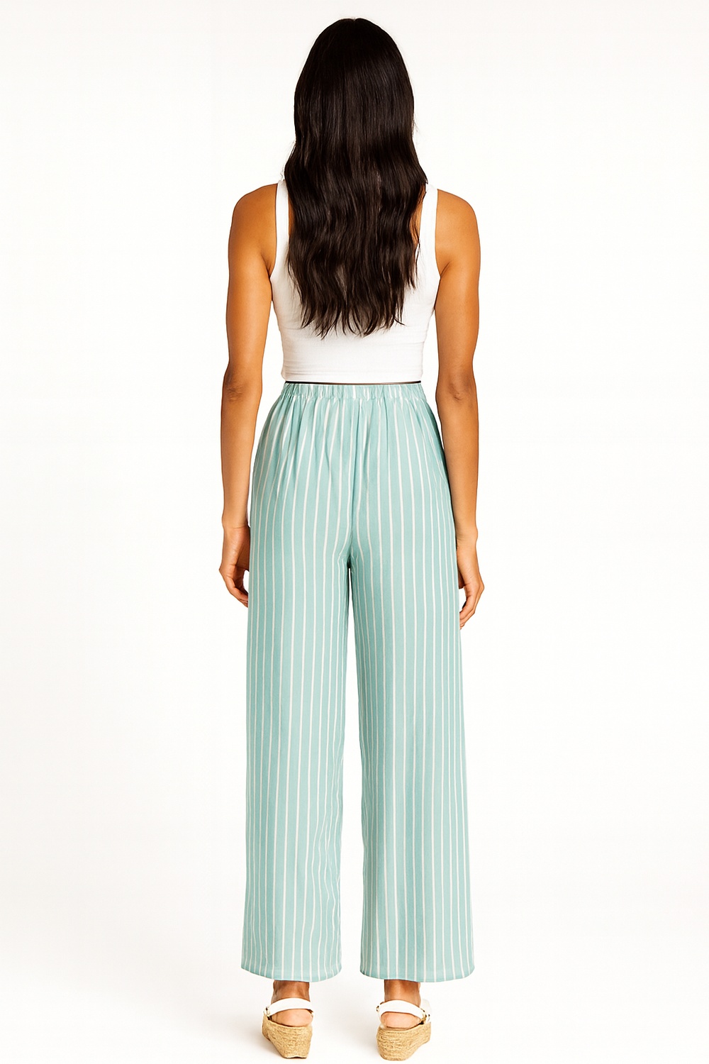 Pantalón de pierna amplia con caída fluida que alarga visualmente la figura, pretina elástica de ajuste cómodo que se adapta a la cintura, tiro medio que equilibra proporciones, corte recto desde cadera hasta bajo que aporta soltura, confección en tejido ligero de textura suave que brinda frescura y libertad de movimiento en cada paso