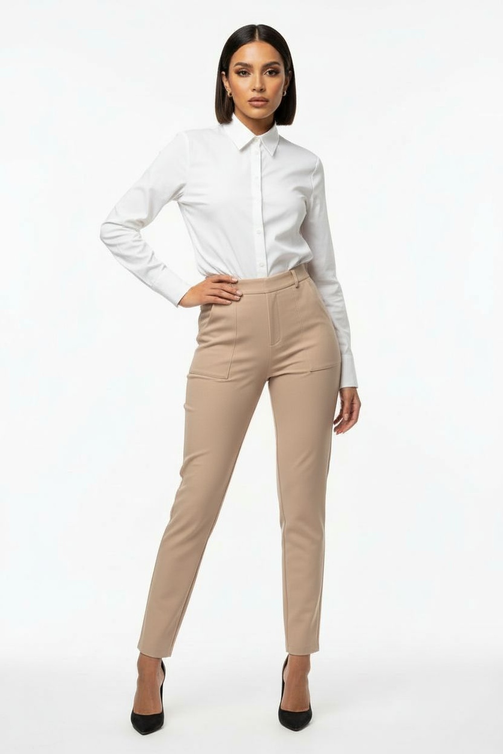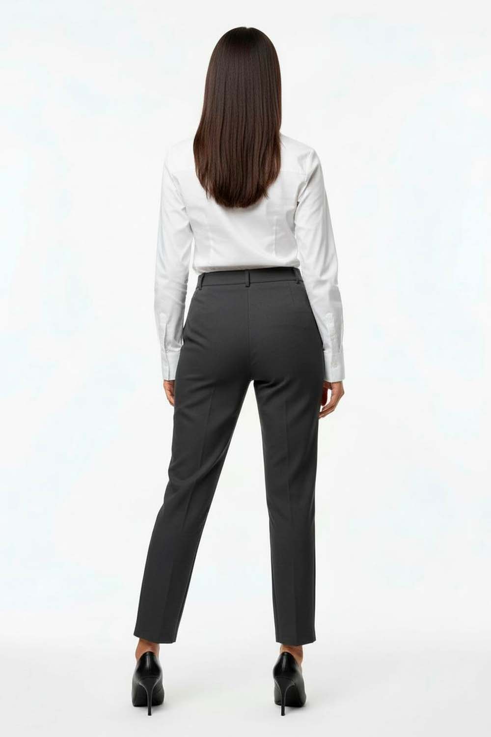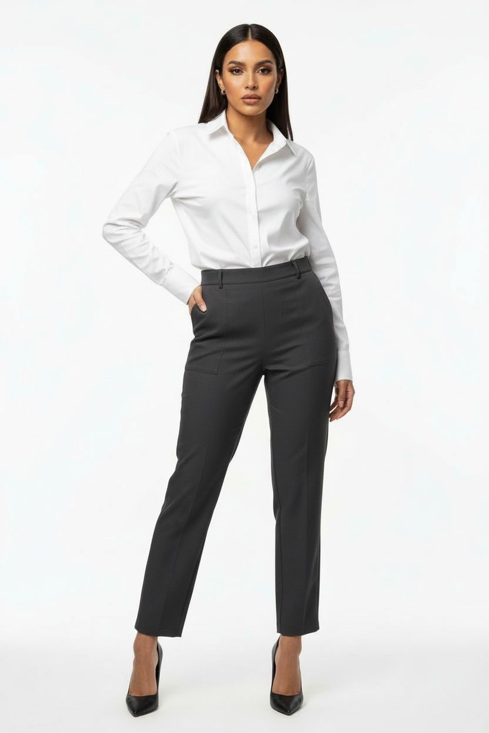 Pantalón de tiro medio con silueta recta que estiliza la figura, diseño con bolsillos funcionales y detalle metálico decorativo en pretina que aporta estructura al ajuste, confección en tejido resistente de caída limpia que mantiene la forma, pretina firme que brinda soporte y comodidad durante todo el día