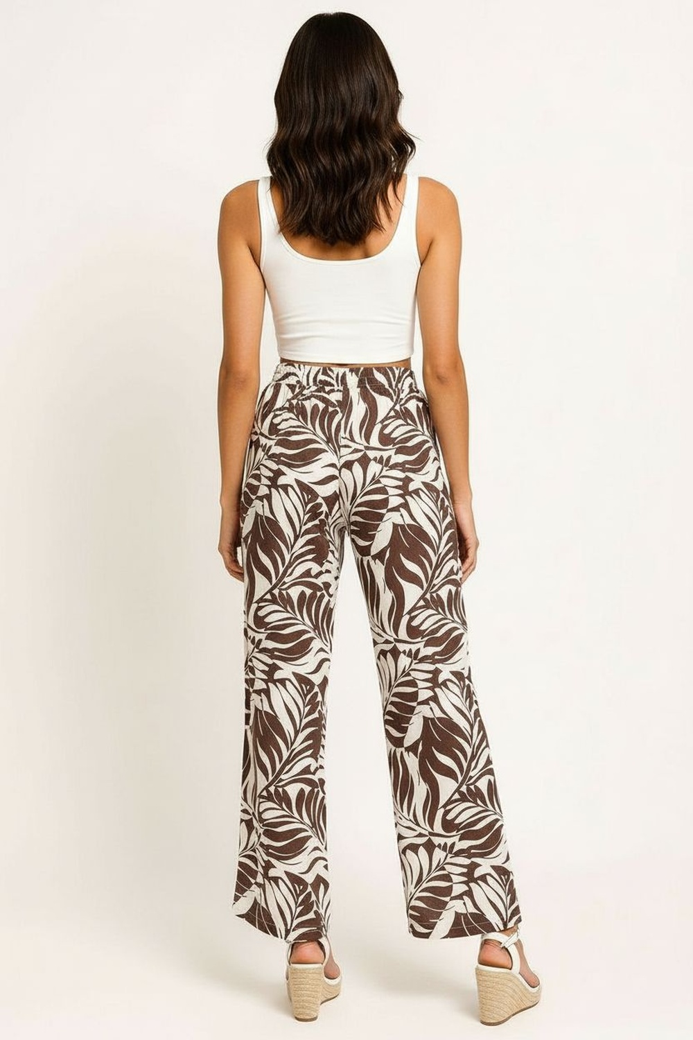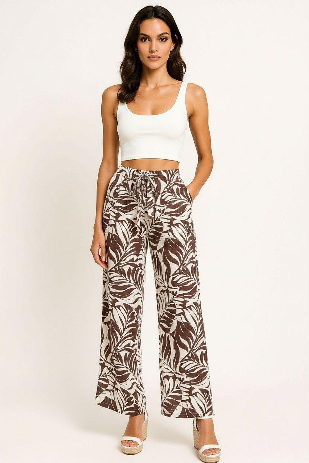 Capri de corte amplio con largo media pantorrilla que ofrece frescura, cintura alta con lazo ajustable que permite adaptación personalizada, bolsillos laterales funcionales que aportan practicidad, confección en tejido ligero con caída fluida que favorece el movimiento, terminado recto en bajo para apariencia equilibrada