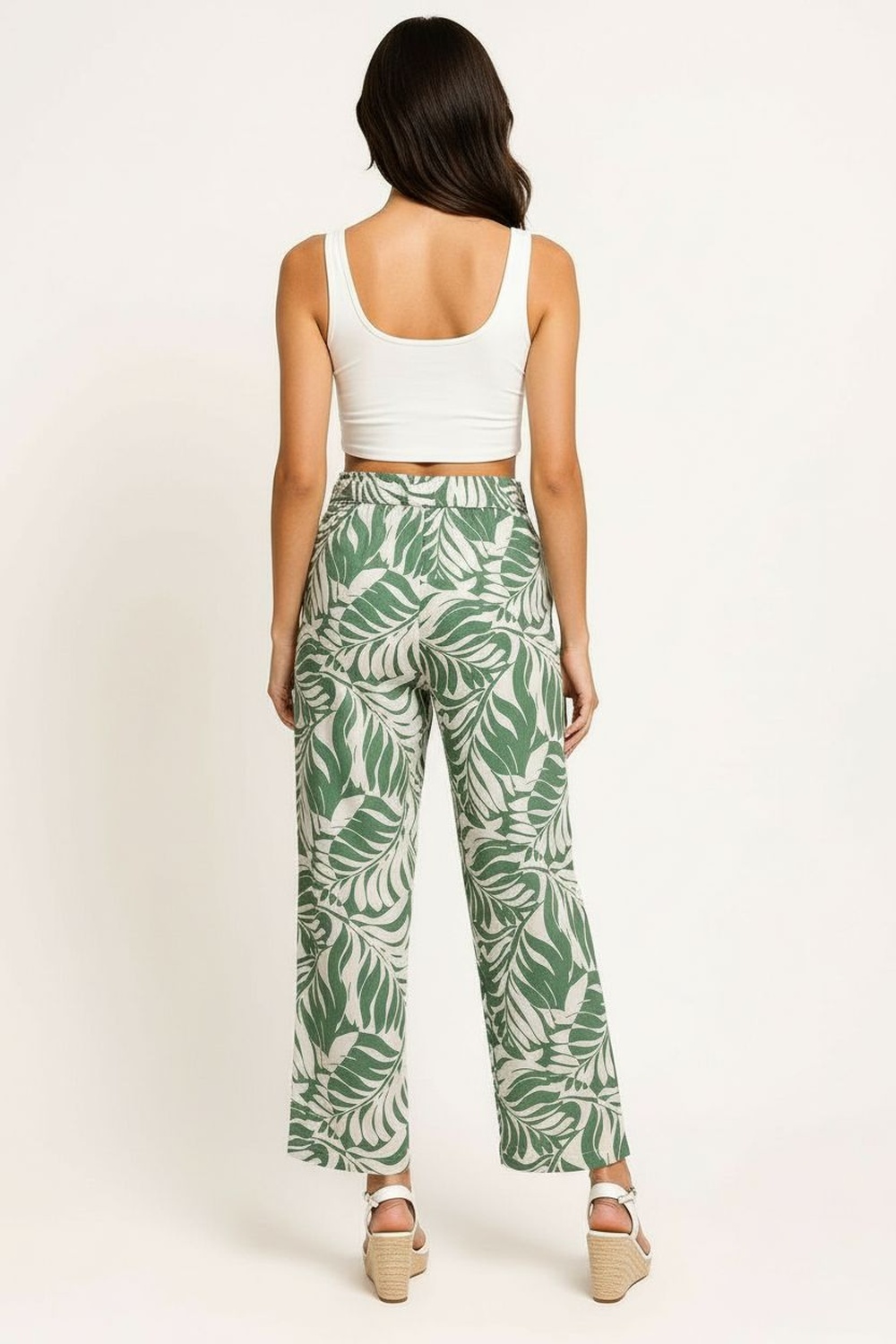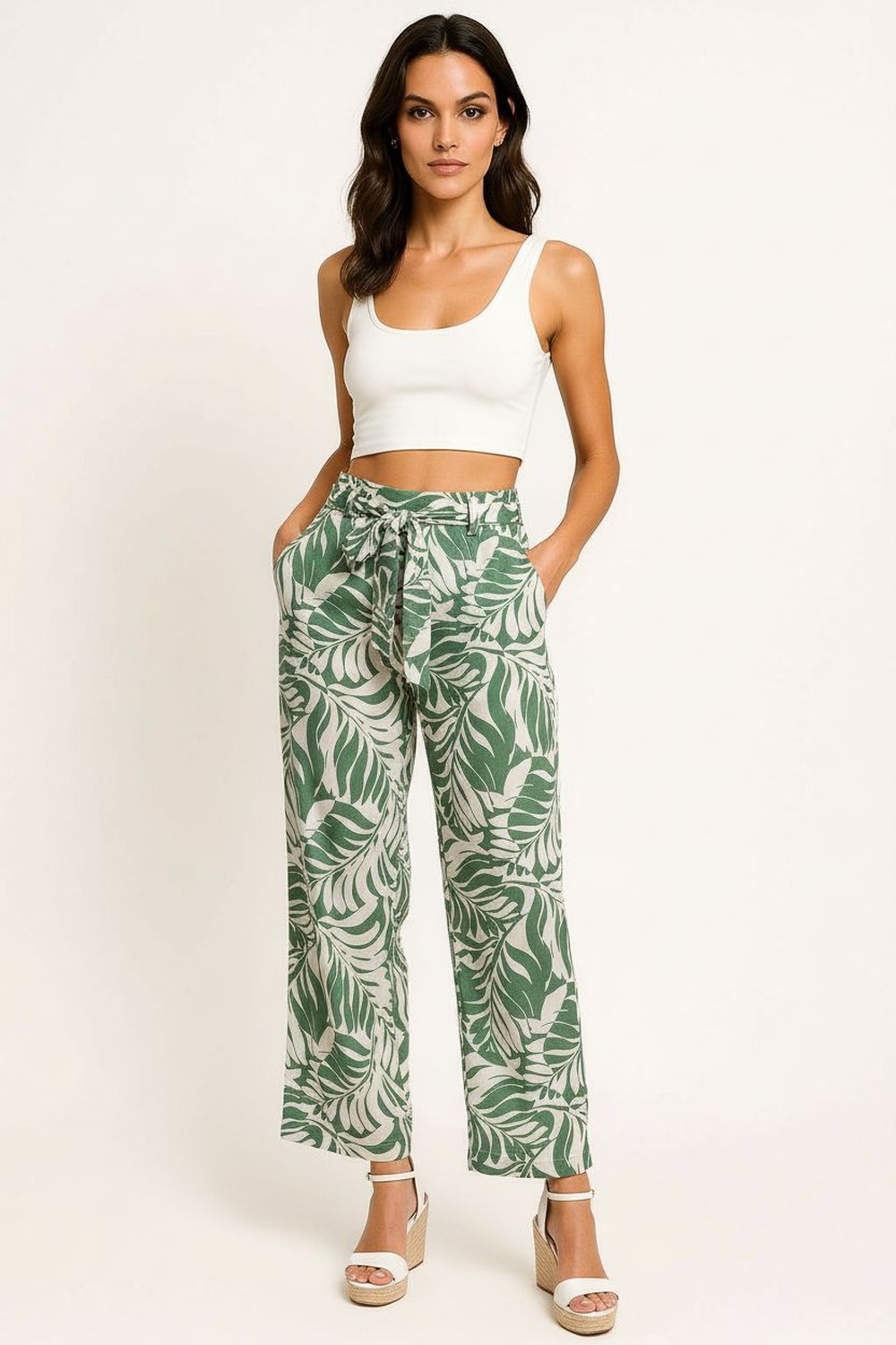Pantalón de tiro medio con pretina elástica y cinturón de cinta que permite un ajuste personalizado, corte recto que aporta comodidad y favorece la silueta, confección en tejido suave que brinda frescura y practicidad, ideal para outfits casuales y combinaciones modernas de temporada
