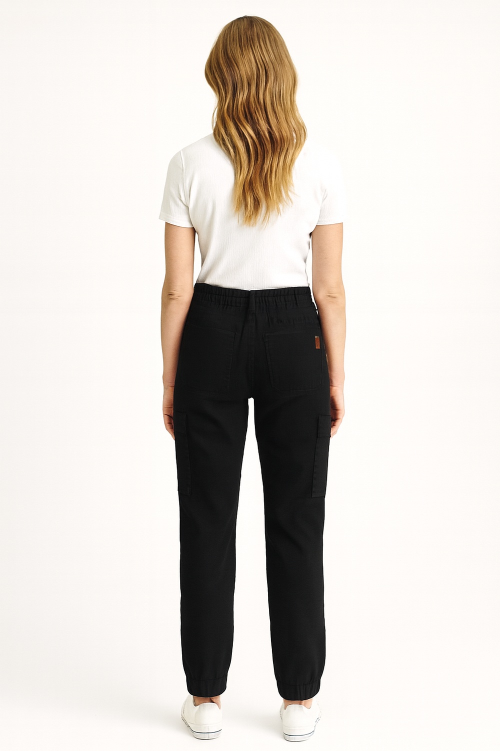 Pantalón tipo cargo confeccionado en mezclilla stretch, pretina con elástico posterior para mayor comodidad, bolsas laterales funcionales con tapa, corte ajustado que estiliza la figura, costuras decorativas que realzan su diseño moderno y urbano