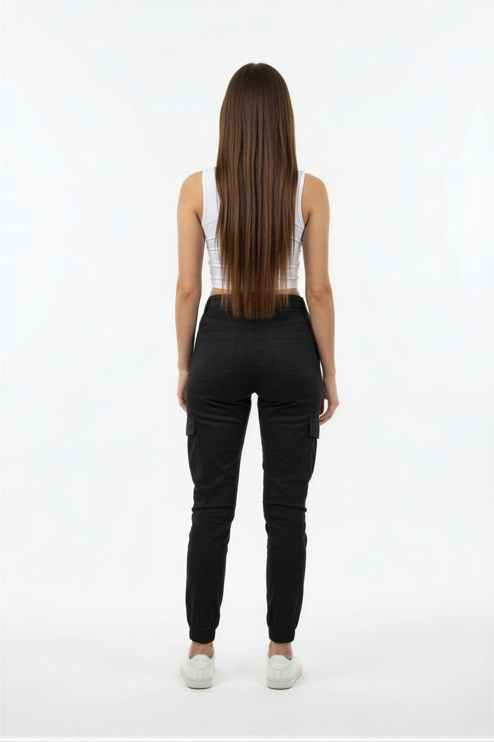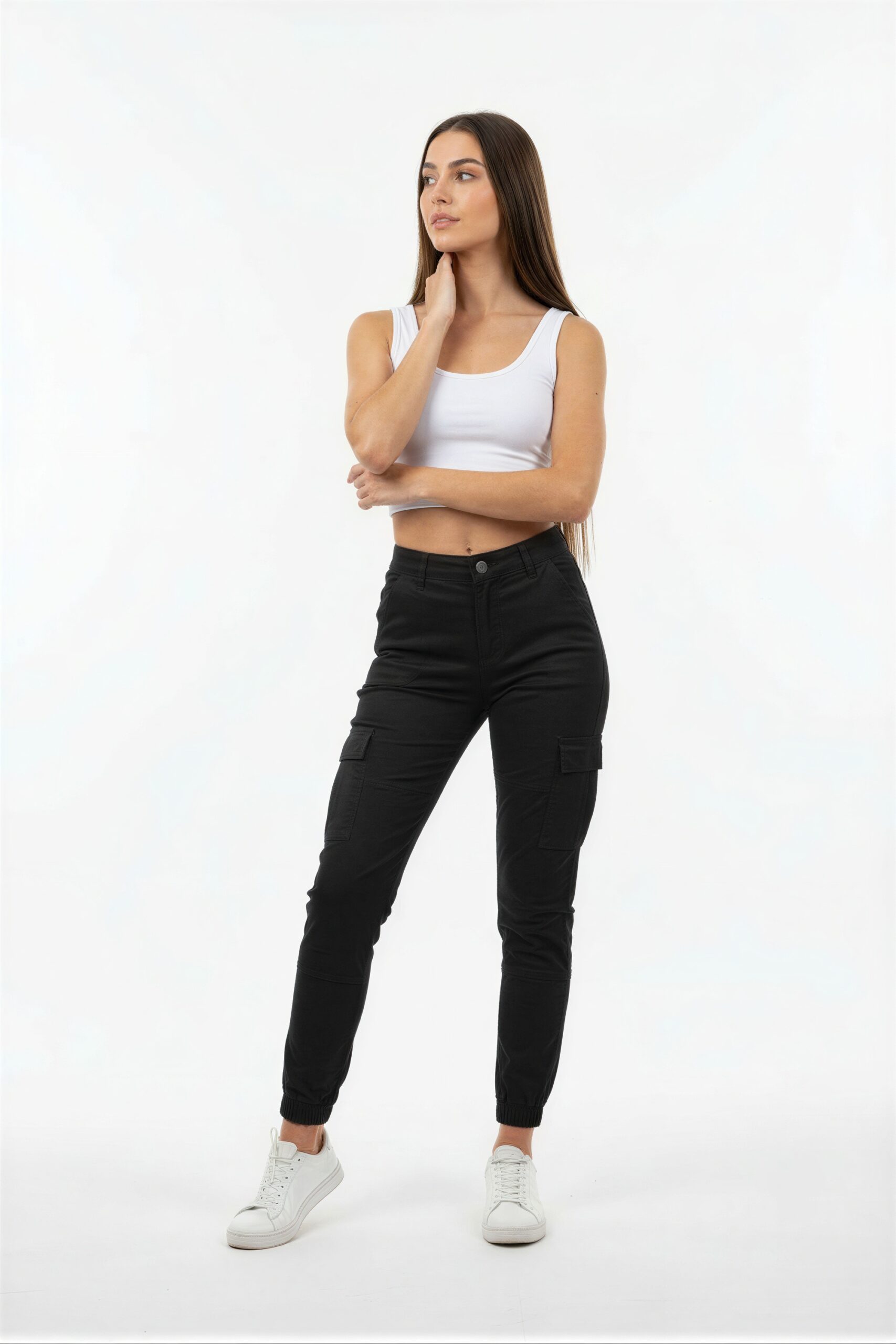 Pantalón con bolsillos cargo laterales, pretina con ajuste elástico, silueta entallada, bolsillos funcionales, estructura ligera, ajuste cómodo