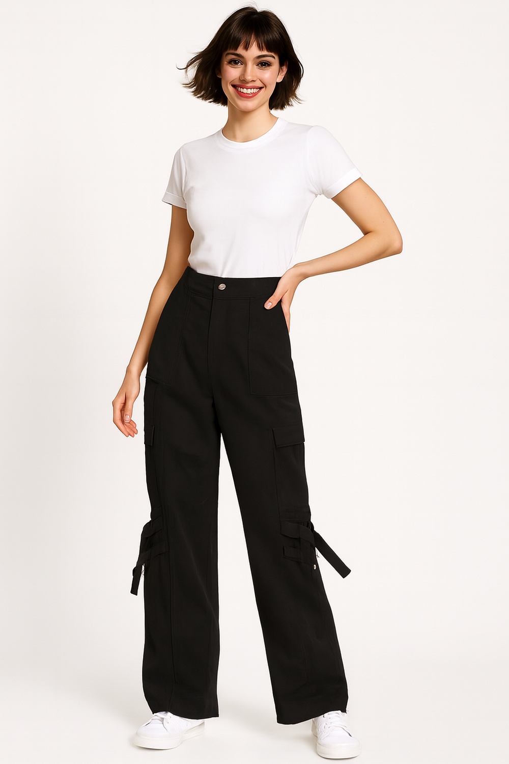 Pantalón de corte cargo con pretina a la cintura y bolsillos amplios al frente y laterales, detalle de lazos ajustables en pierna que añaden estilo y funcionalidad, cierre frontal con botón y cremallera, confección en tela rígida que mantiene su forma y resistencia