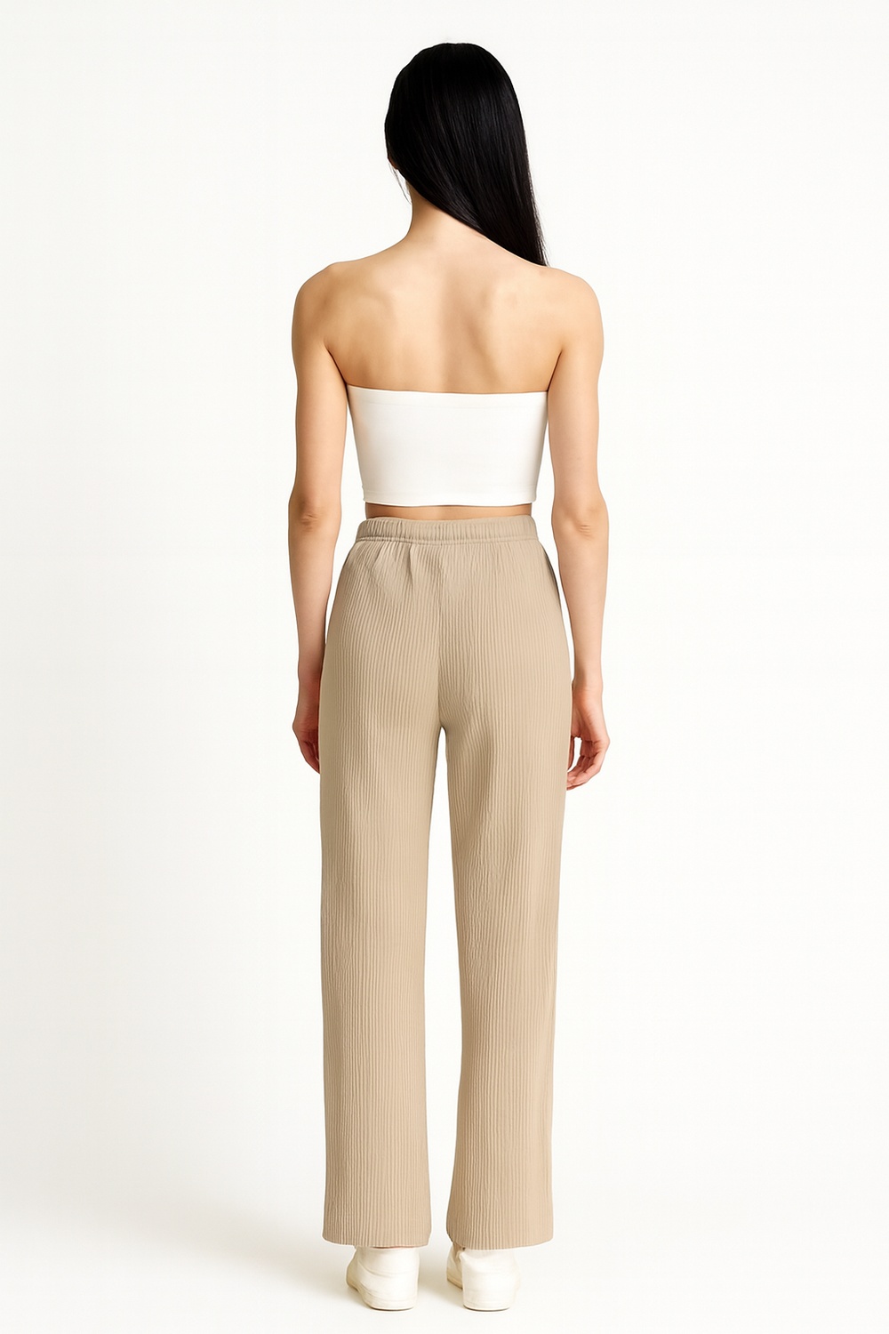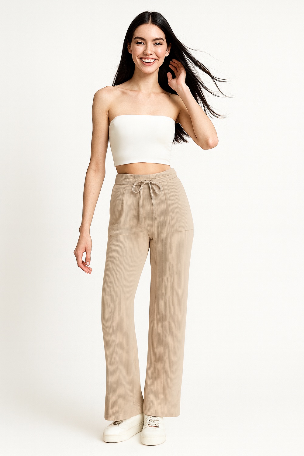 Pantalón de tiro alto con corte amplio y pinzas al frente que aportan estructura, pretina ancha con ajuste seguro, caída fluida y textura suave que brinda comodidad y elegancia casual