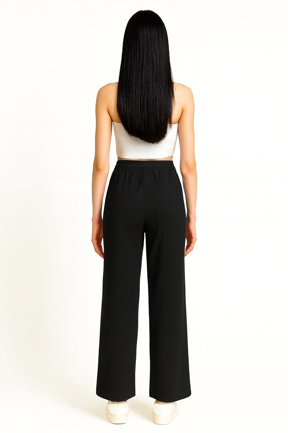 Pantalón largo de silueta acampanada, confeccionado en tejido tipo crepe de tacto suave, pretina lisa con ajuste cómodo, caída fluida que estiliza la forma y permite libertad de movimiento