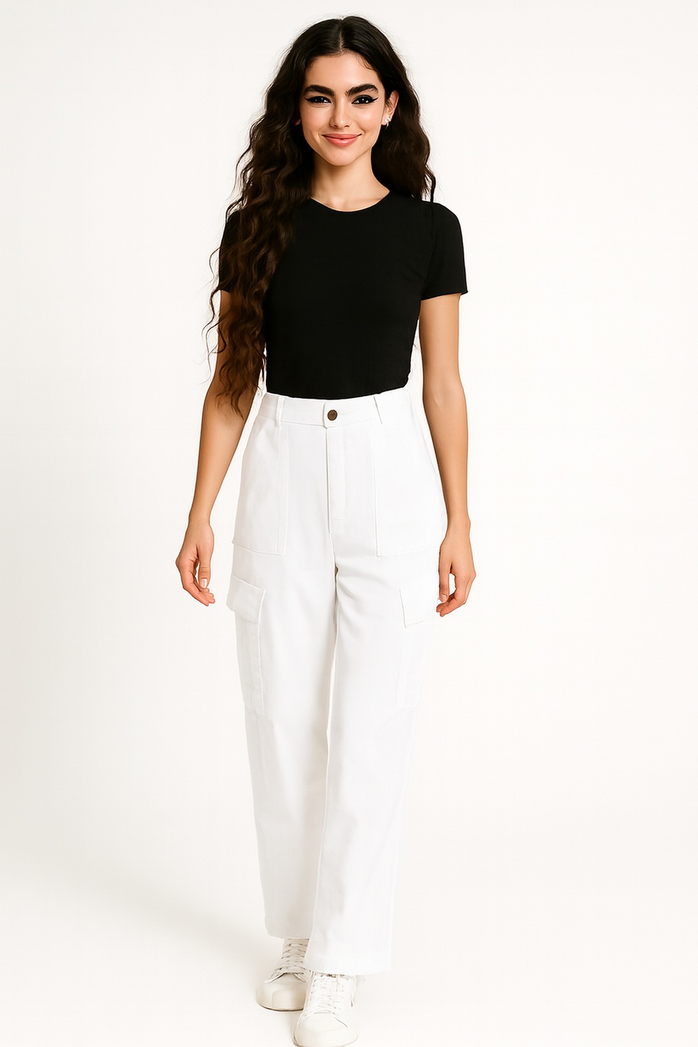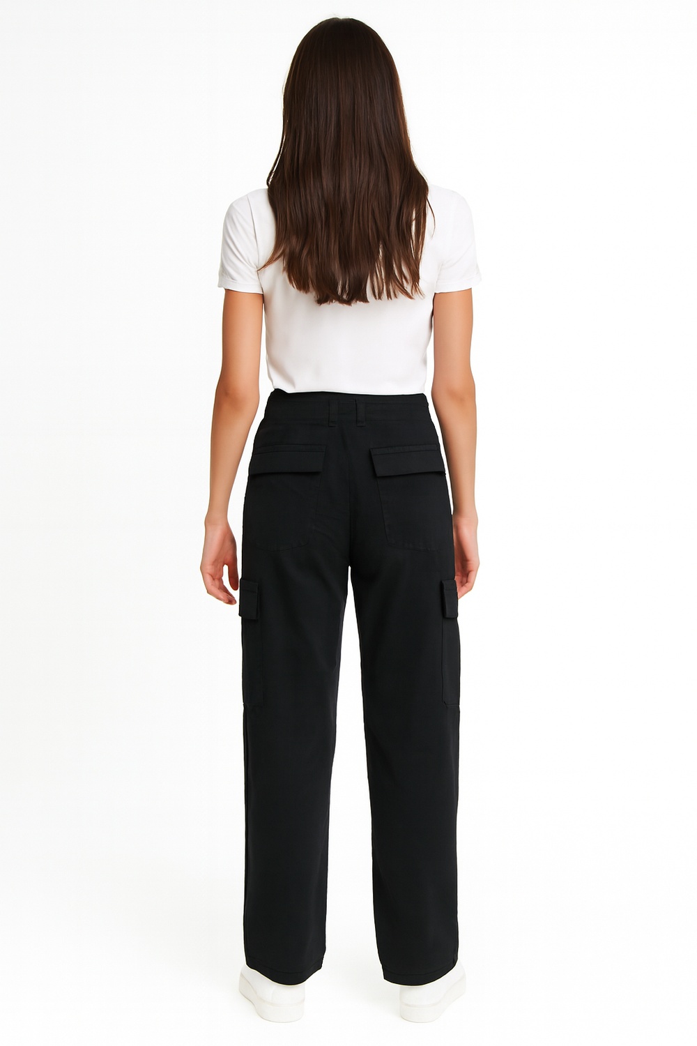 Pantalón de confección resistente con estructura firme, tiro medio con pretina fija y cierre frontal que aporta ajuste seguro, pierna recta con caída uniforme, bolsillos tipo cargo funcionales que añaden practicidad, terminación al tobillo con acabado limpio que mantiene la forma