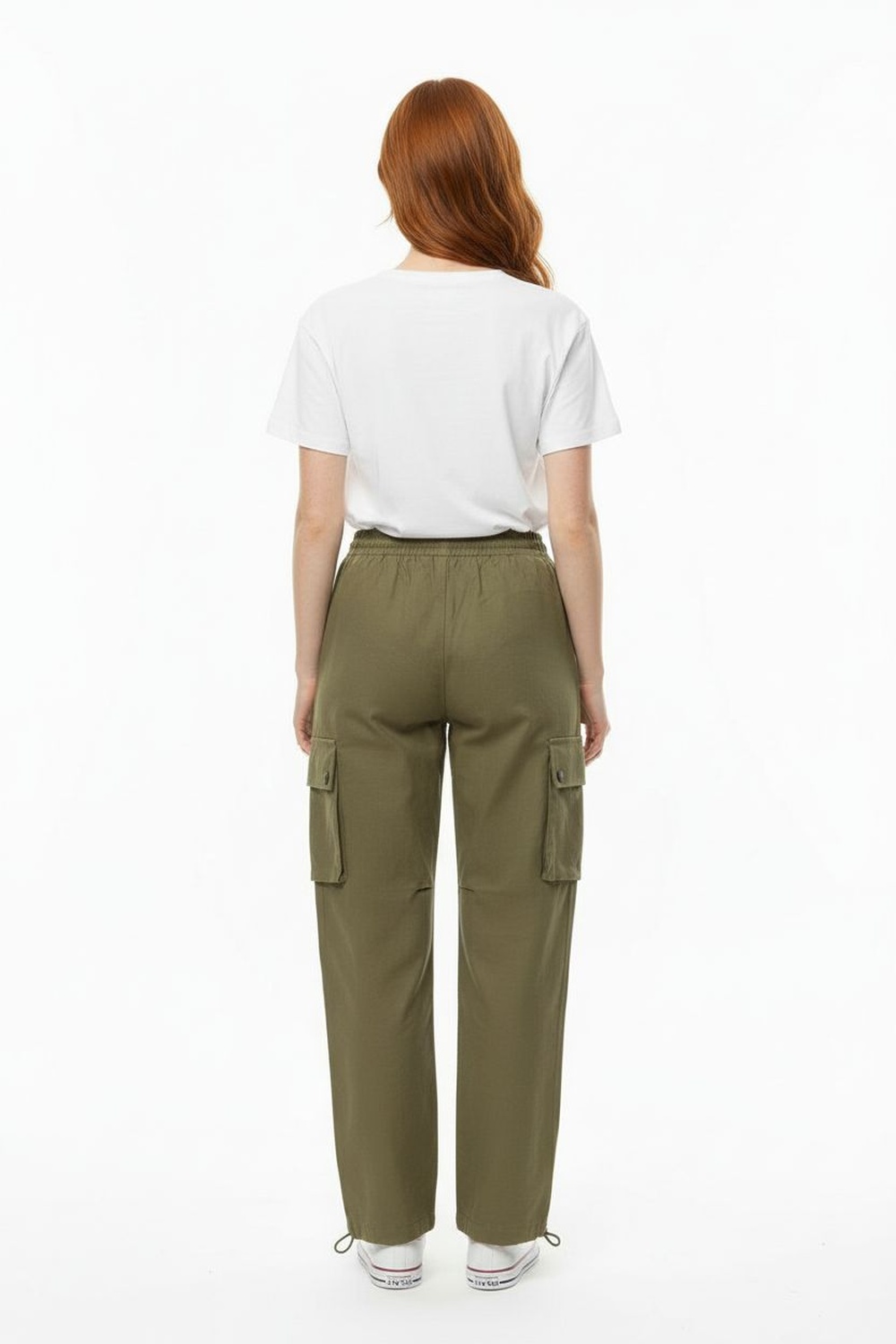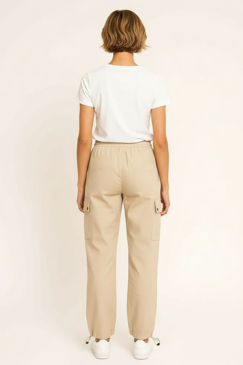 Pantalón tipo cargo con pretina elástica y cordón ajustable, bolsillos laterales funcionales y corte recto
