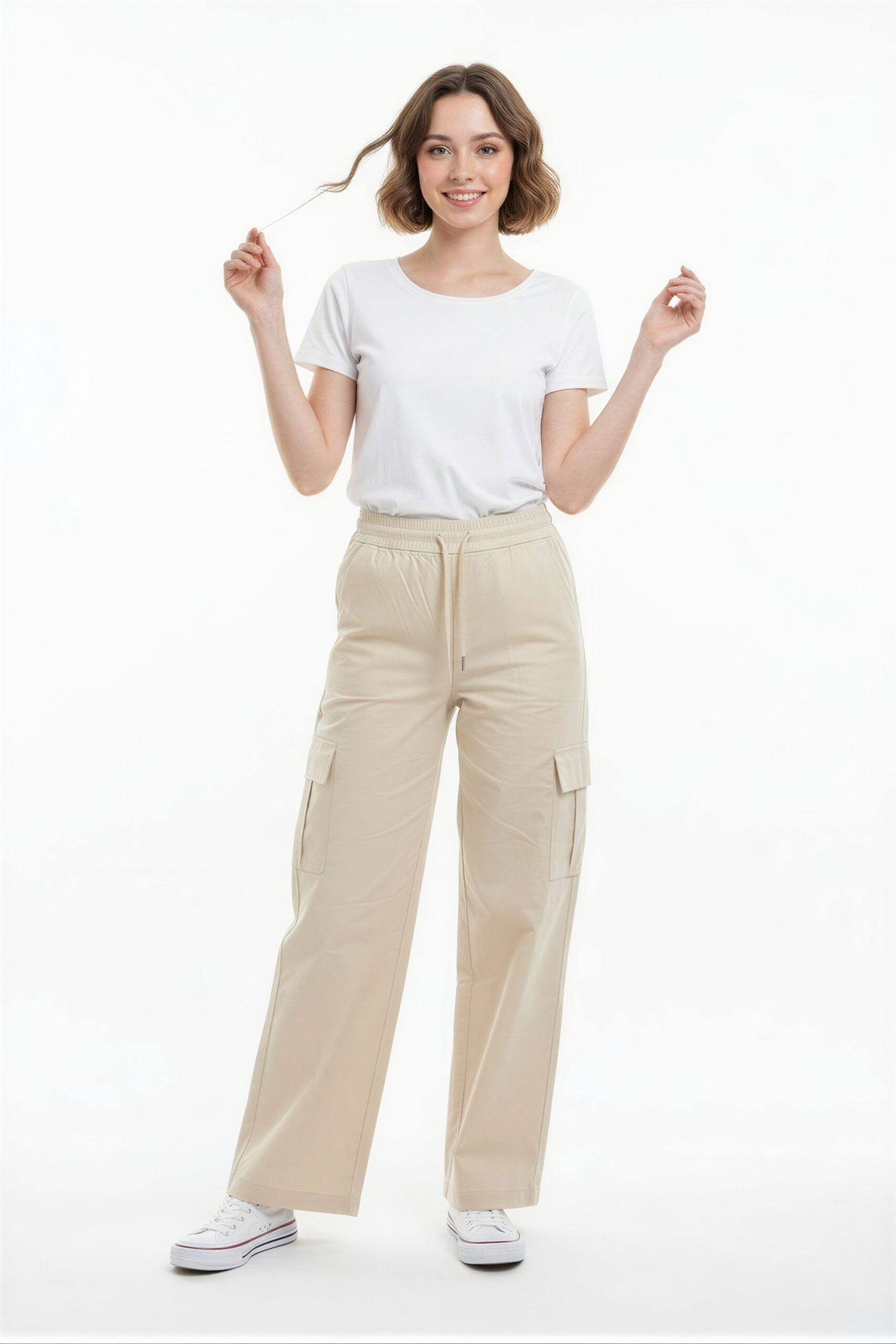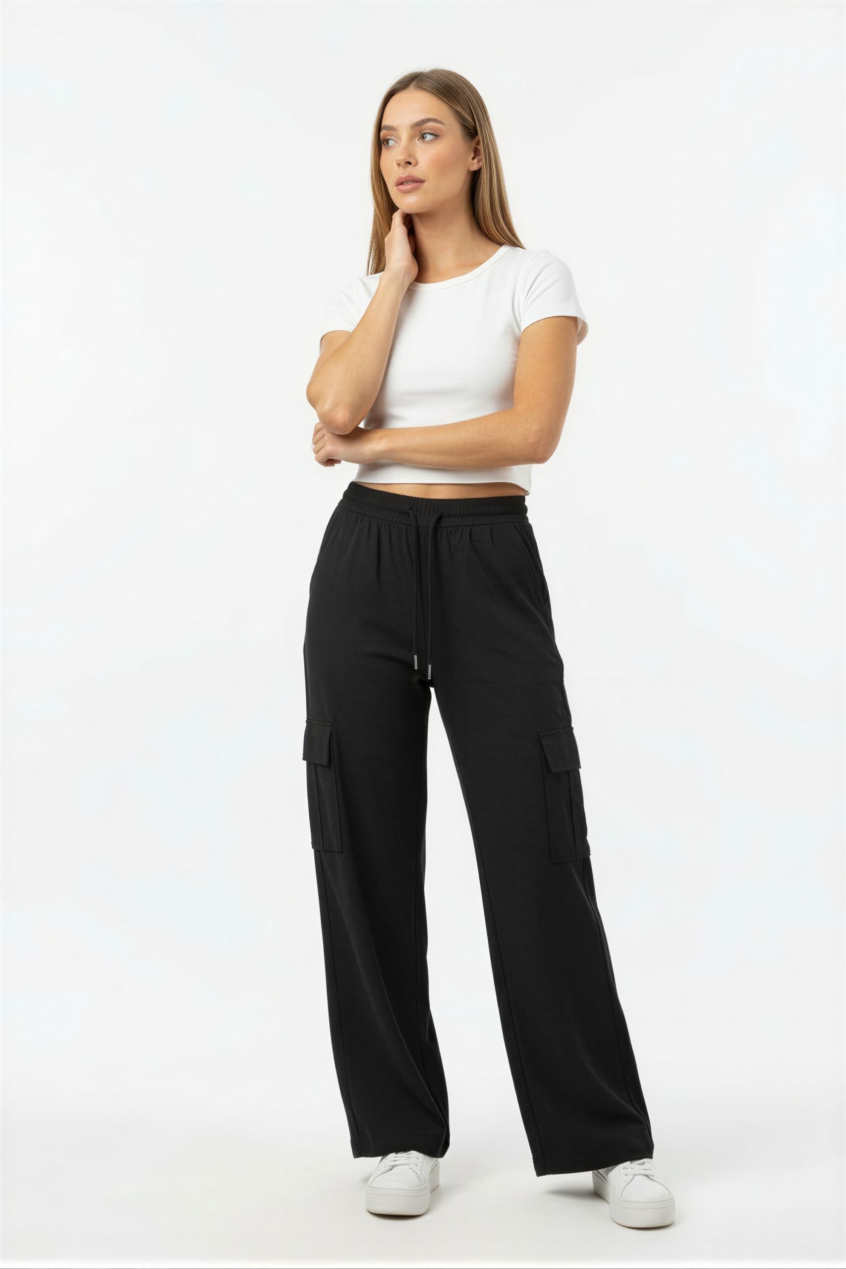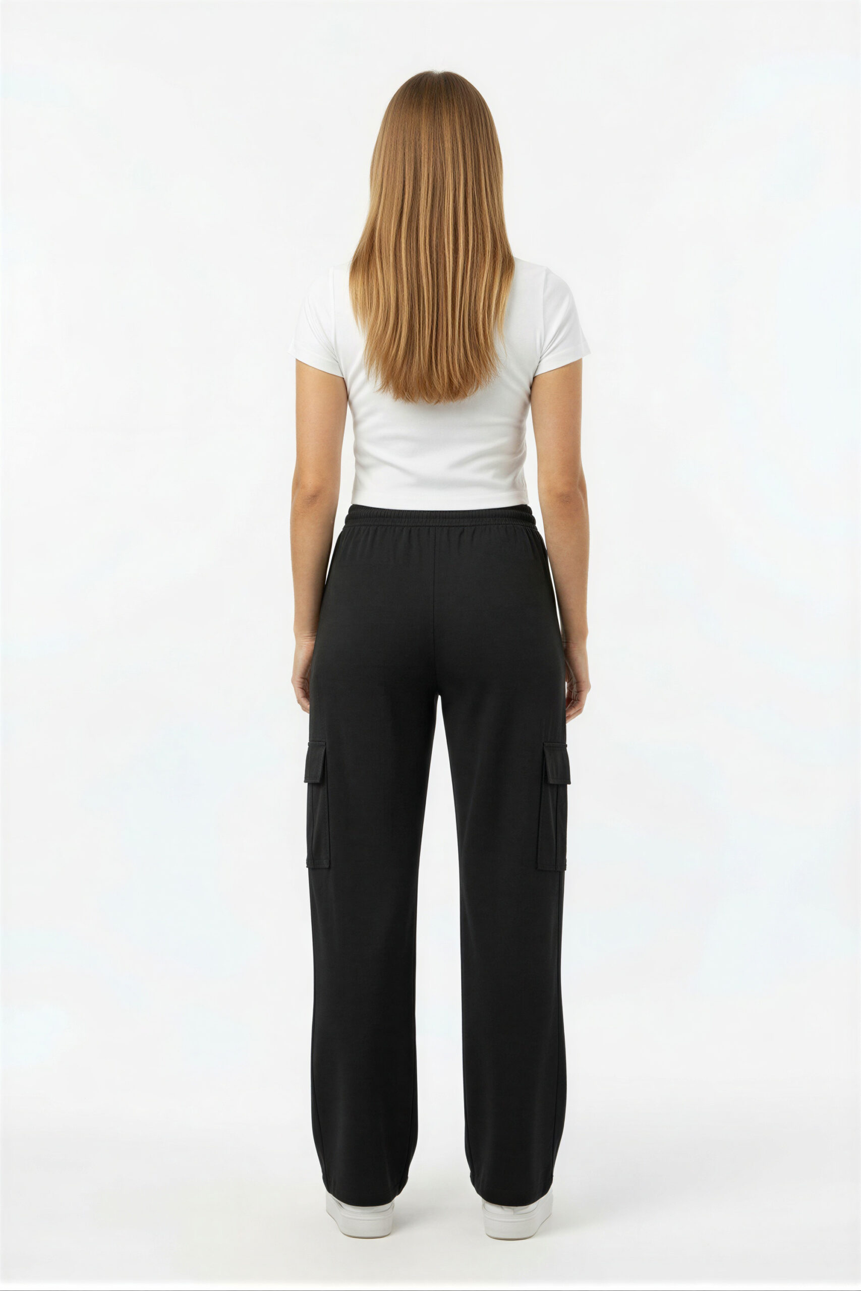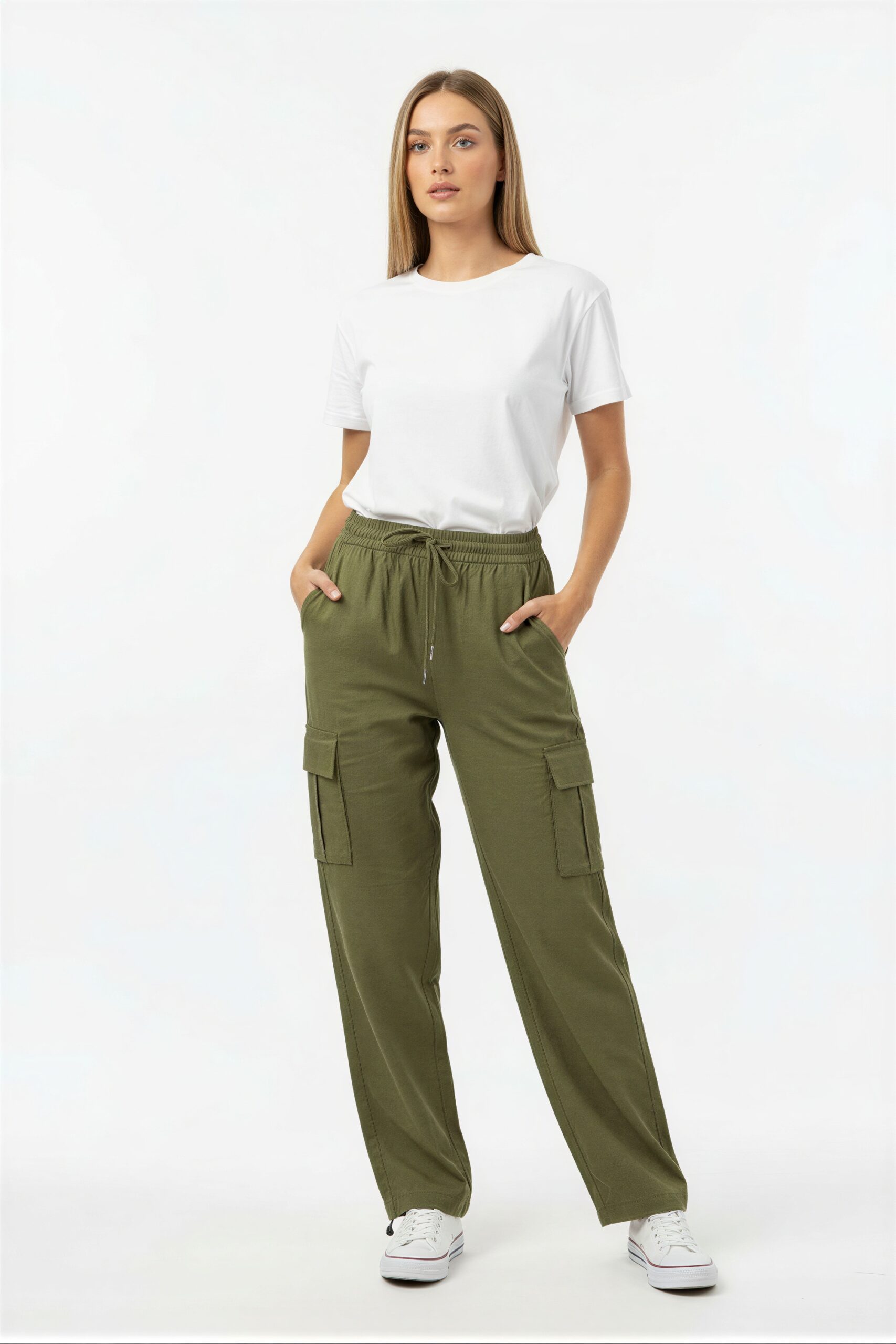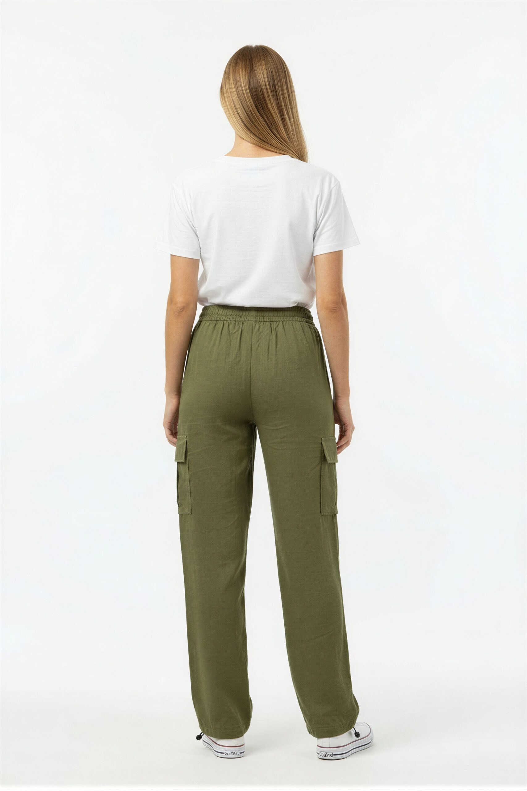 Pantalón con pretina elástica, ajuste con jareta, bolsillos laterales tipo cargo, corte recto, estructura funcional, terminaciones con ajuste inferior