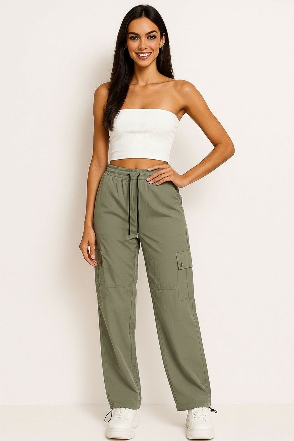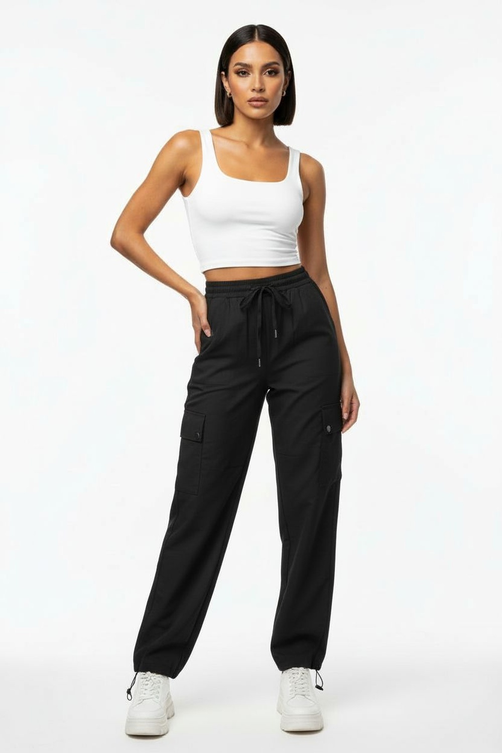 Pantalón cargo con pretina elástica, ajuste con jareta, bolsas laterales tipo cargo, corte recto, largo al tobillo, terminados resistentes