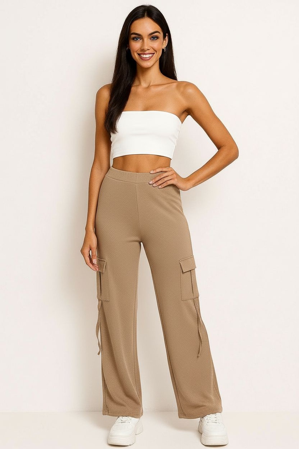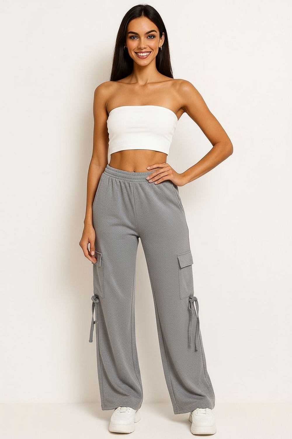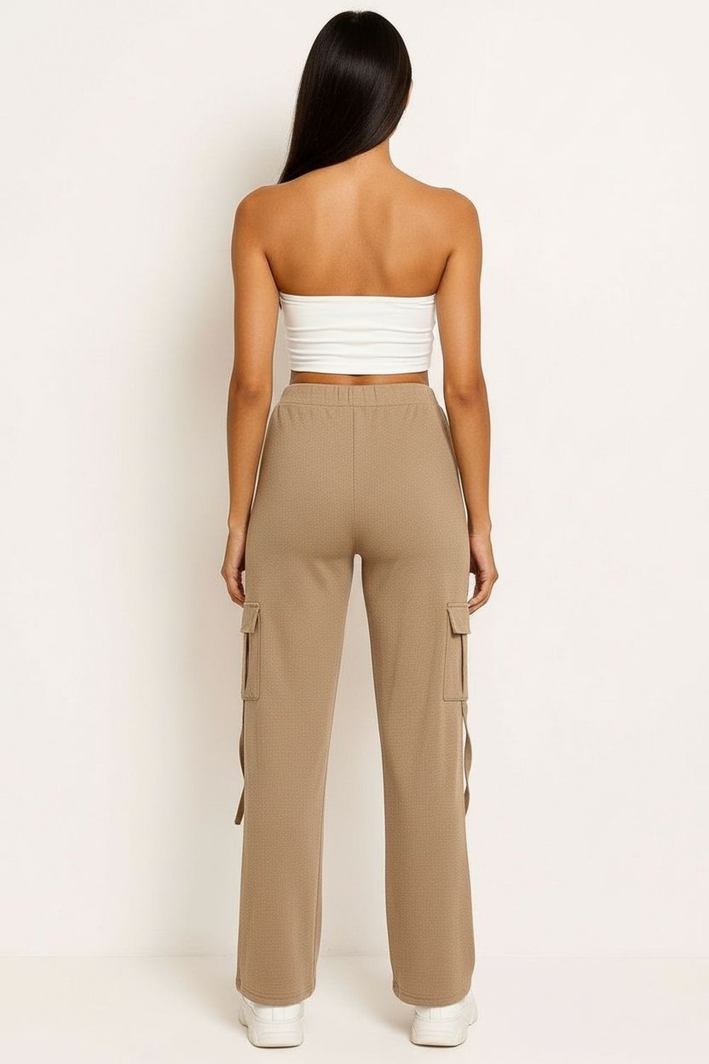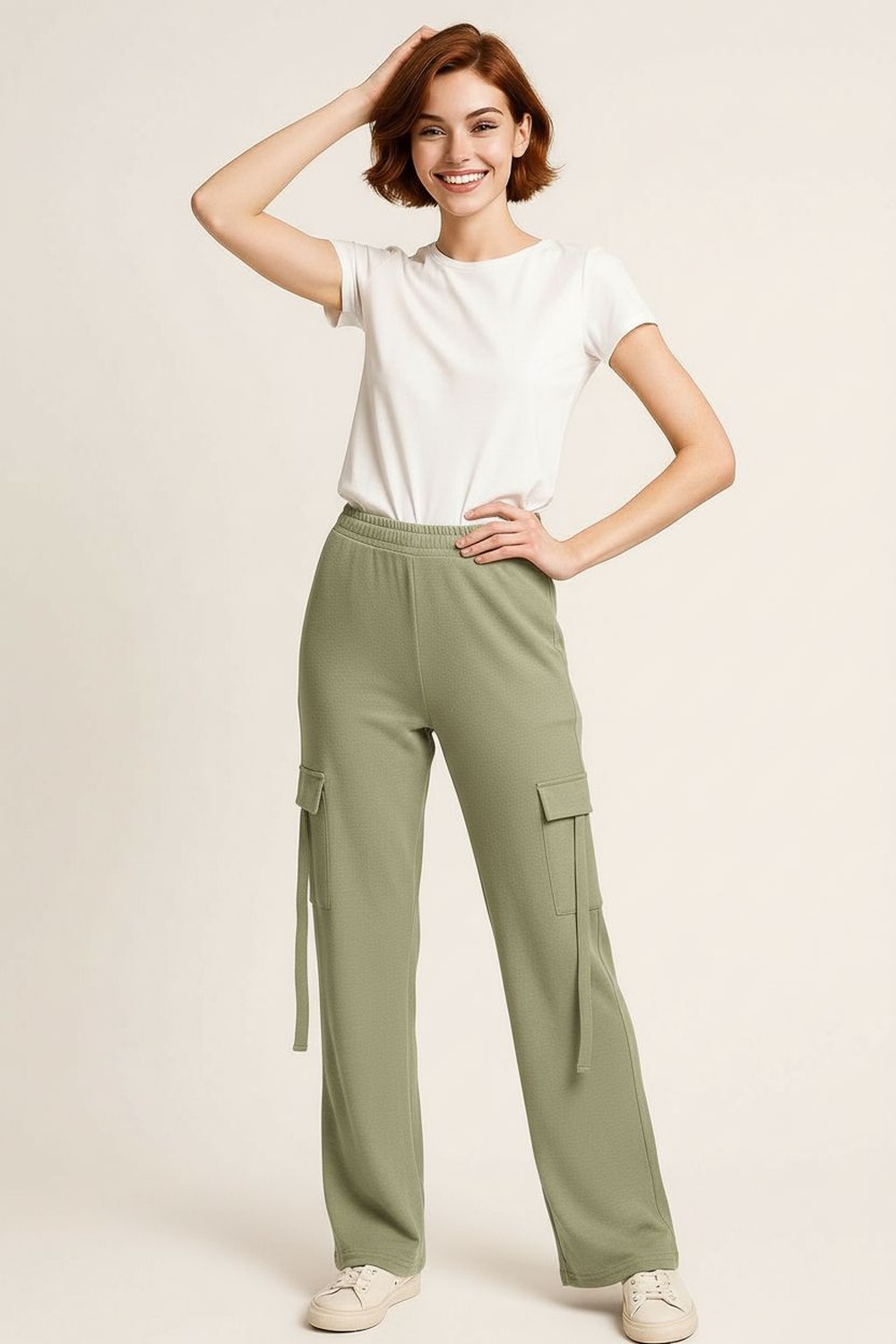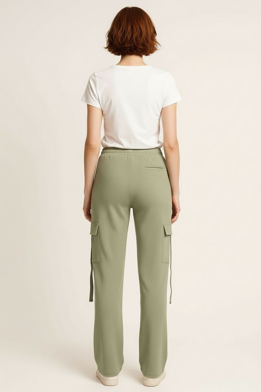 Pantalón tipo cargo con pretina elástica y bolsas laterales funcionales, ajuste relajado con pierna recta, tela con textura ligera que brinda comodidad y libertad de movimiento, terminados prácticos para uso diario