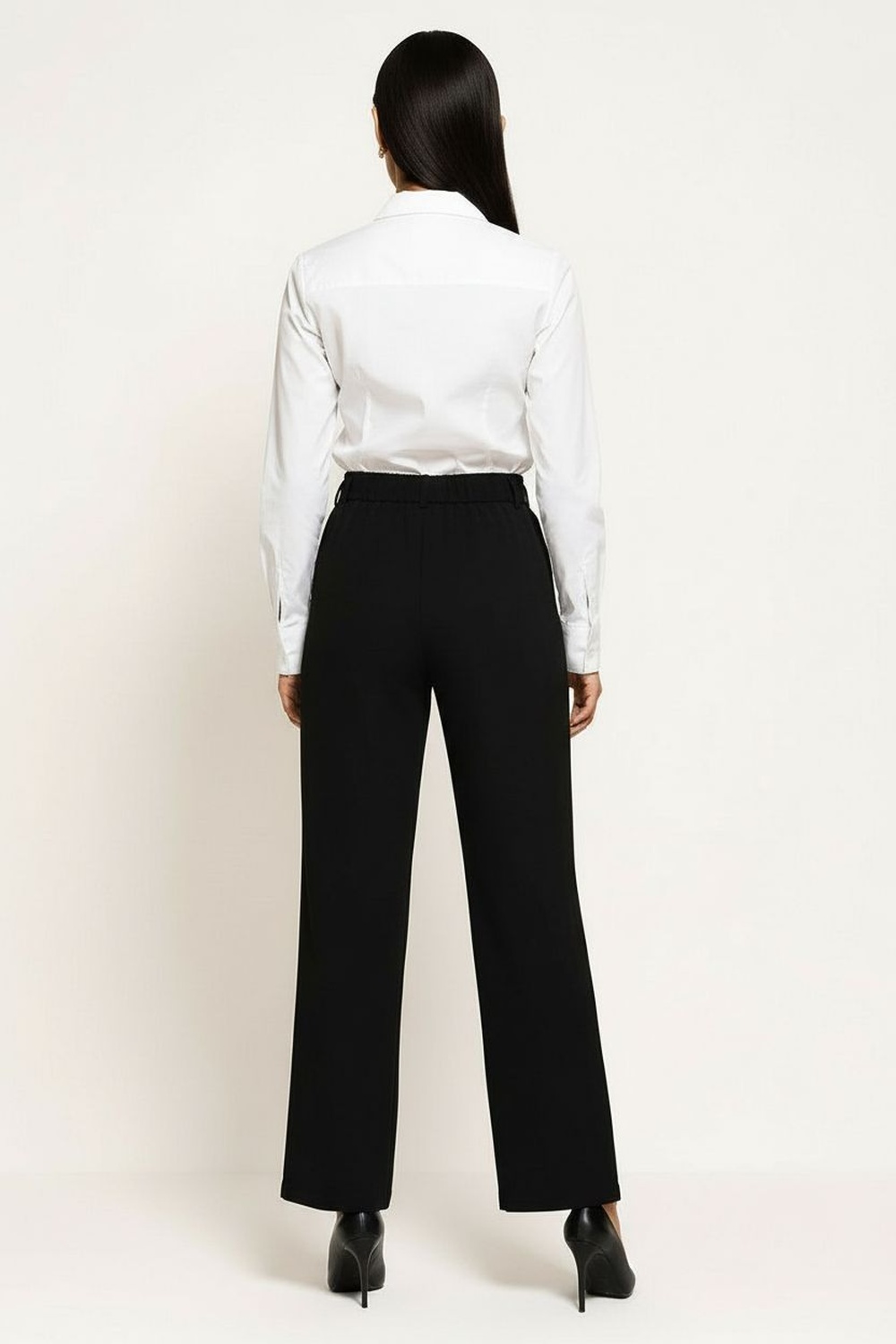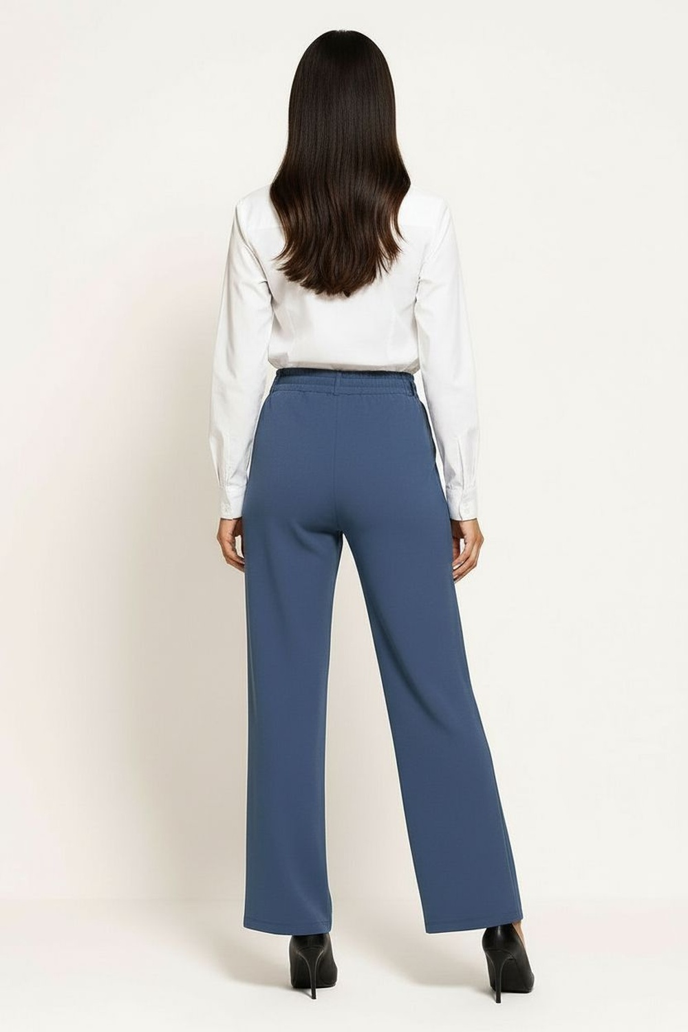Pantalón de corte recto con cintura alta y resorte posterior que brinda ajuste cómodo, cinta frontal funcional que permite adaptar la prenda al contorno, pernera recta que aporta equilibrio visual, confección en tejido ligero de estructura firme que favorece el uso diario, largo completo con caída limpia