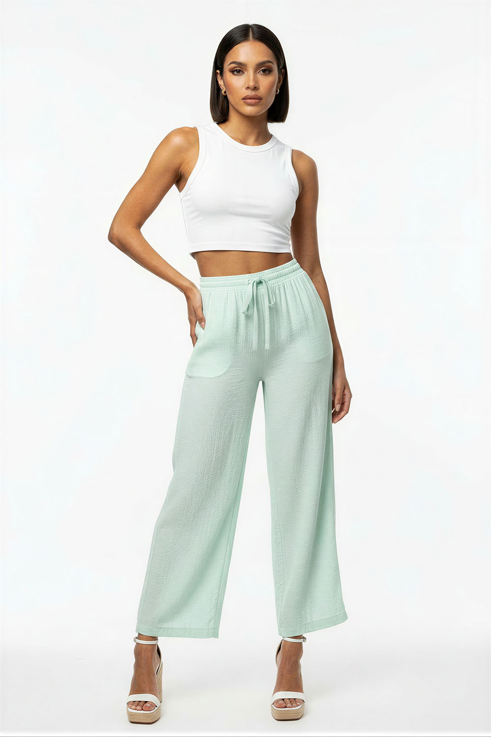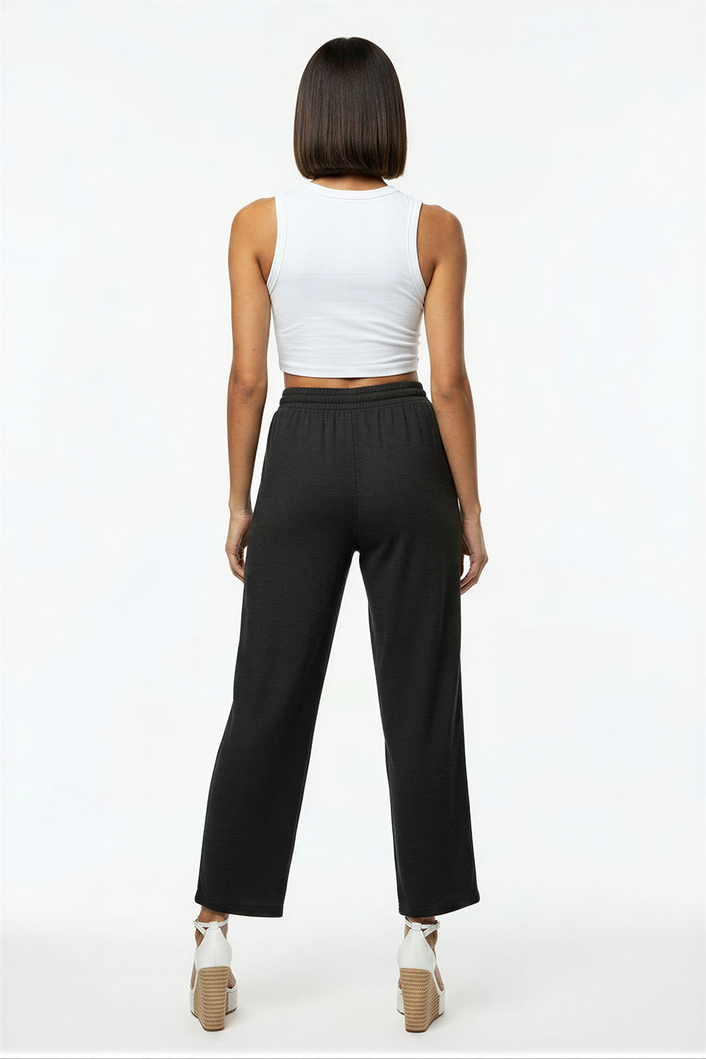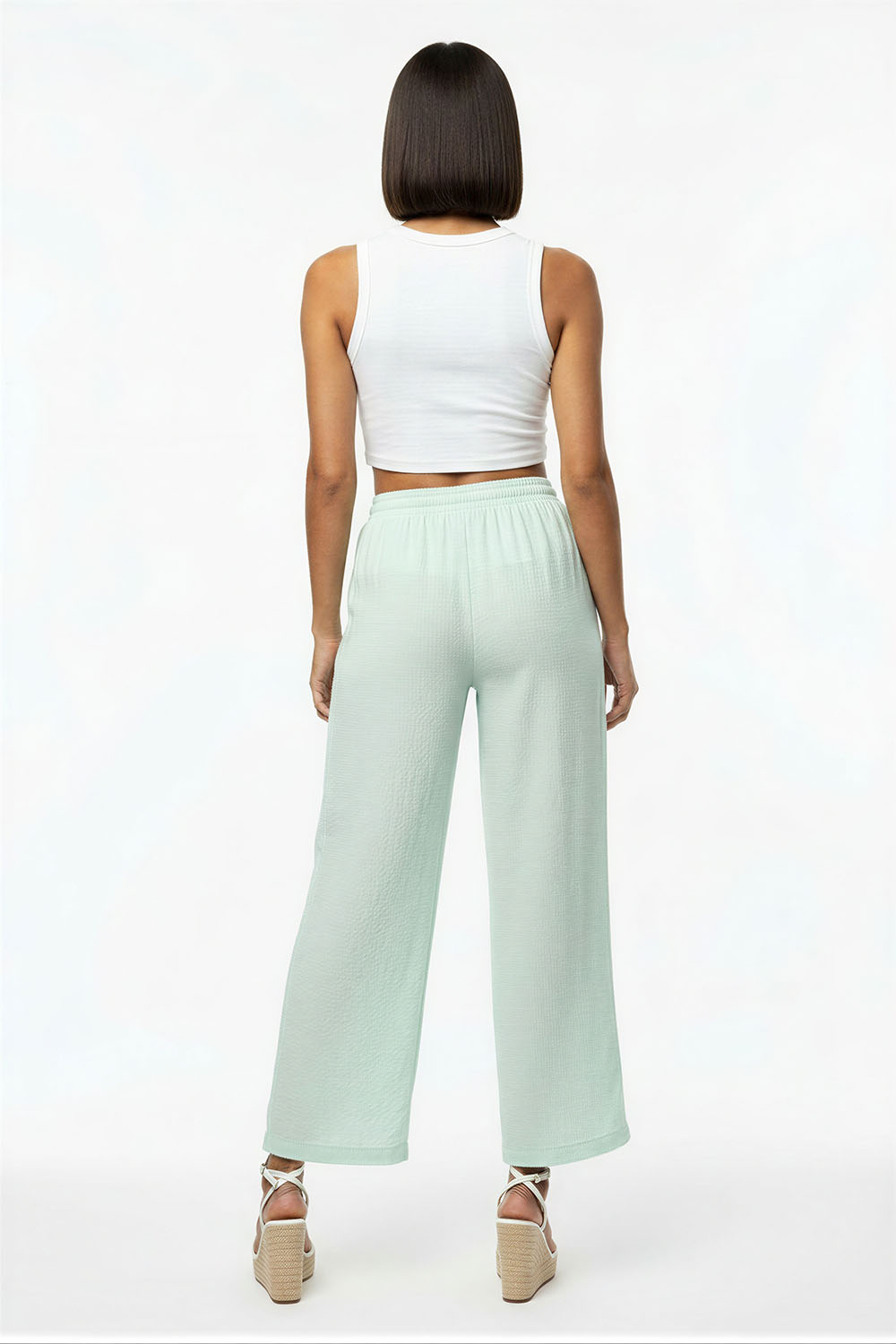 Pantalón de corte amplio con silueta recta que brinda libertad de movimiento, pretina elástica que se adapta cómodamente a la cintura, diseño con bolsillos funcionales que aportan practicidad, confección en tejido con textura que eleva el acabado y proporciona confort durante todo el día