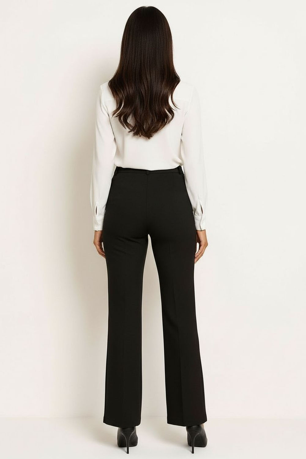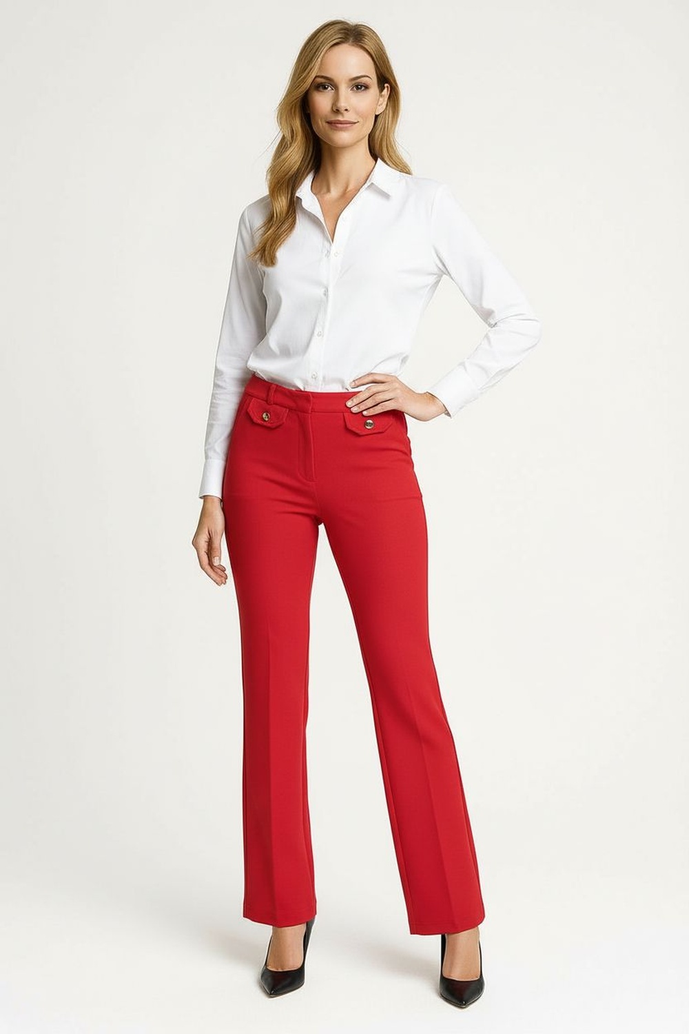 Pantalón de tiro medio, pretina con botón y cierre, bolsas frontales con tapas, corte recto, estructura firme, largo al tobillo