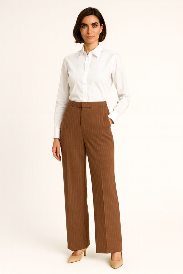 Pantalón de corte recto en tela estructurada con cierre frontal y broche metálico, pretina con trabillas para cinturón que ofrecen ajuste seguro, bolsas laterales funcionales para uso cotidiano, caída fluida con apariencia pulida