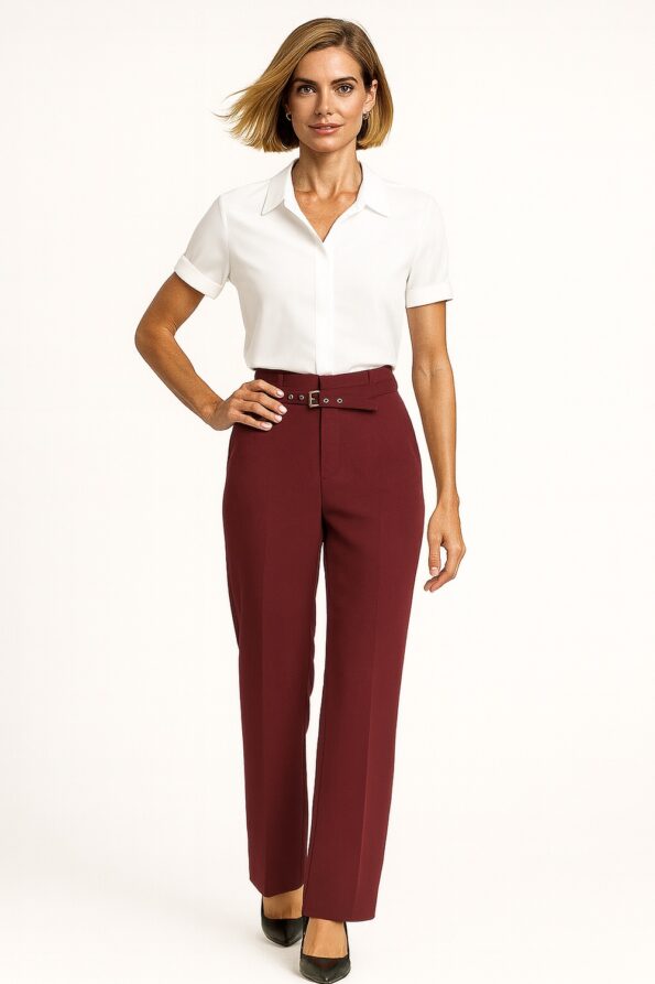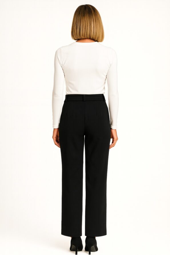 Pantalón de tiro alto con corte recto que aporta una silueta estilizada, pretina con trabillas y cinturón delgado que permite ajustar la cintura, confeccionado en tejido suave con estructura firme que brinda comodidad y elegancia