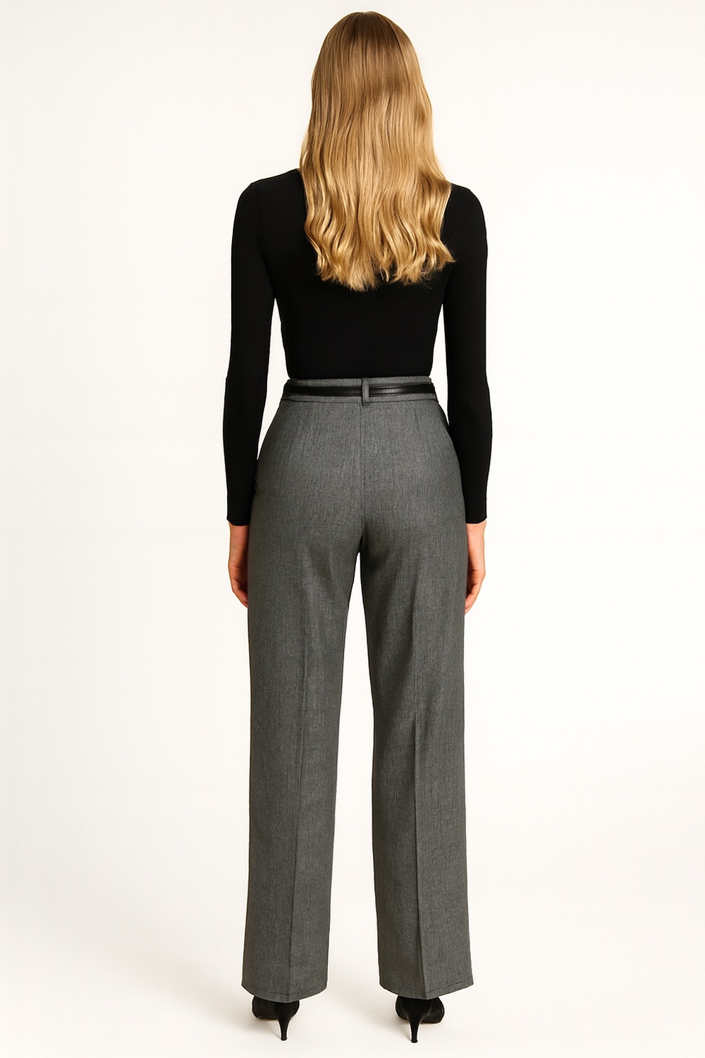 Pantalón de tiro alto con corte recto que estiliza la figura, cinturón delgado con hebilla metálica que realza la cintura y aporta un detalle moderno, bolsas laterales funcionales que brindan practicidad, confección en tela estructurada que ofrece comodidad y durabilidad para un look versátil