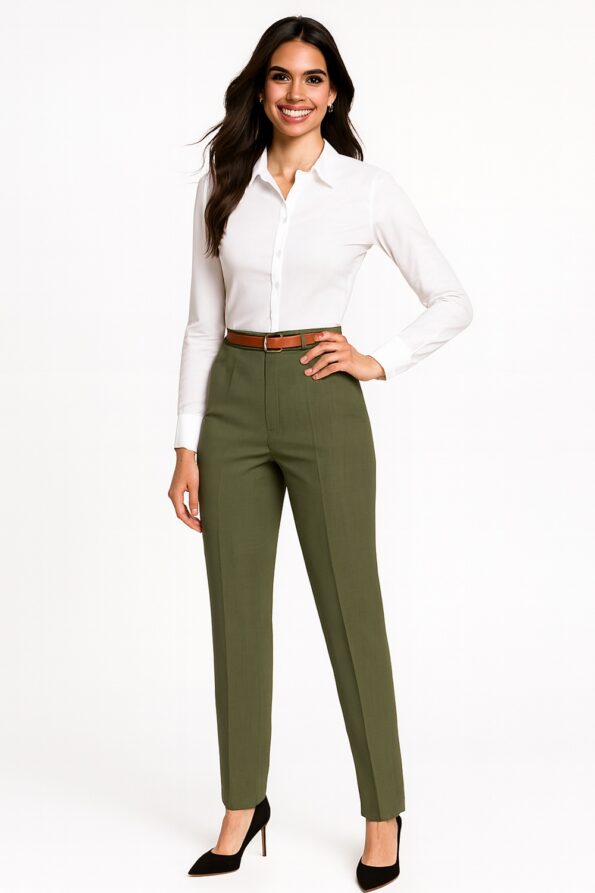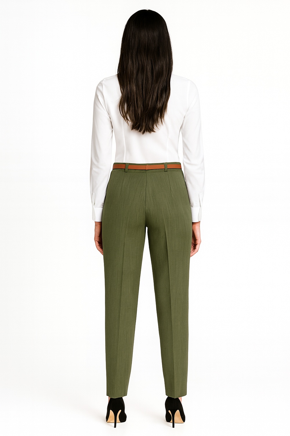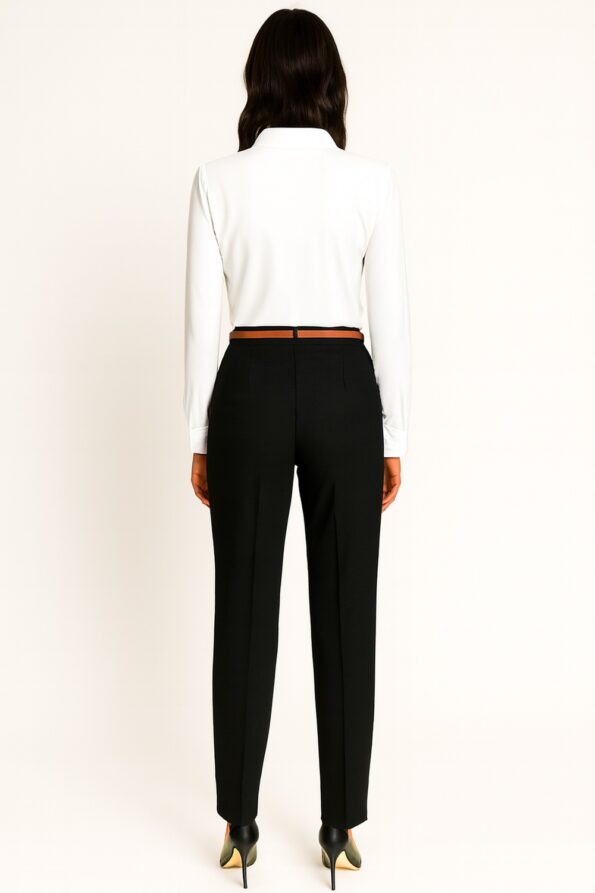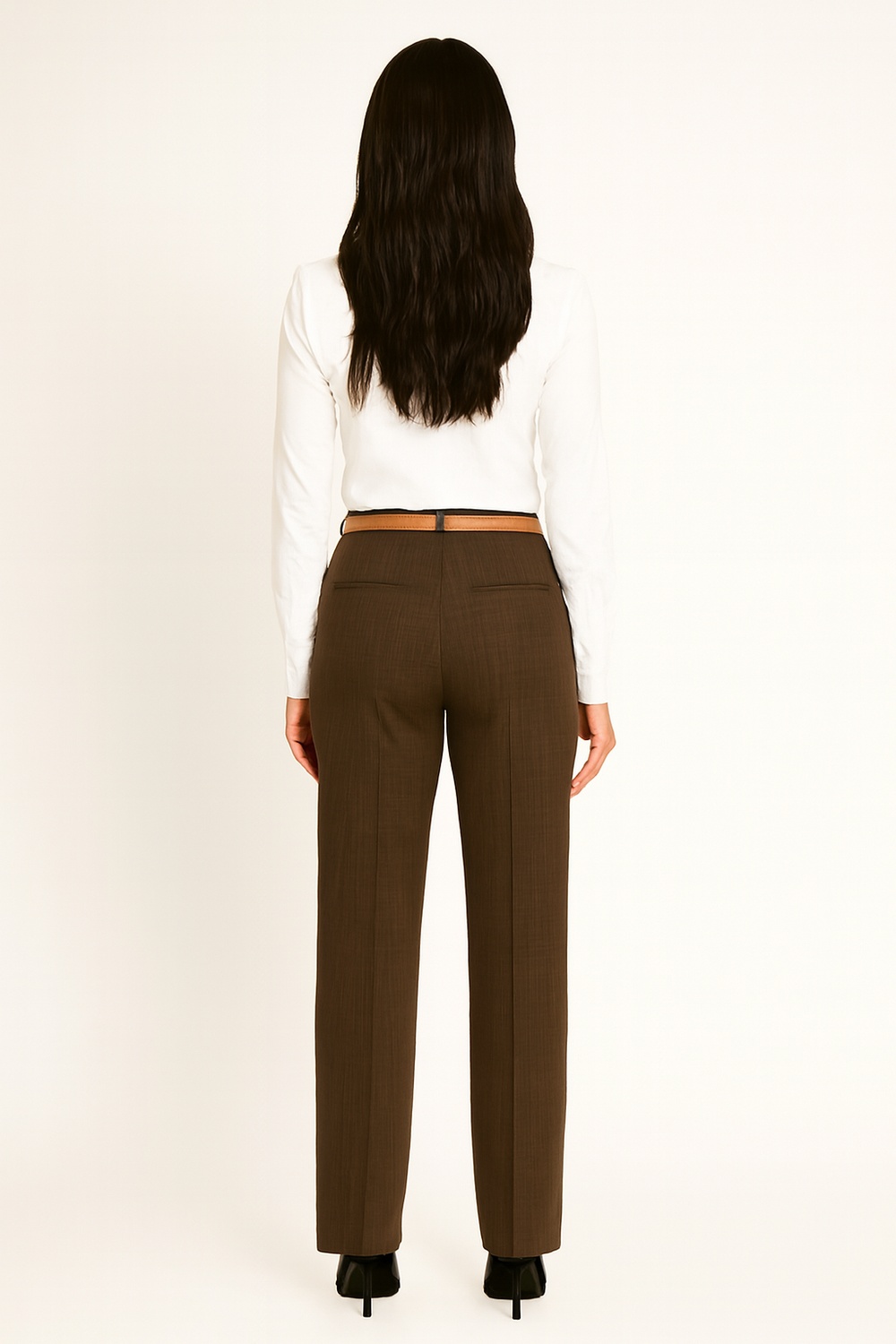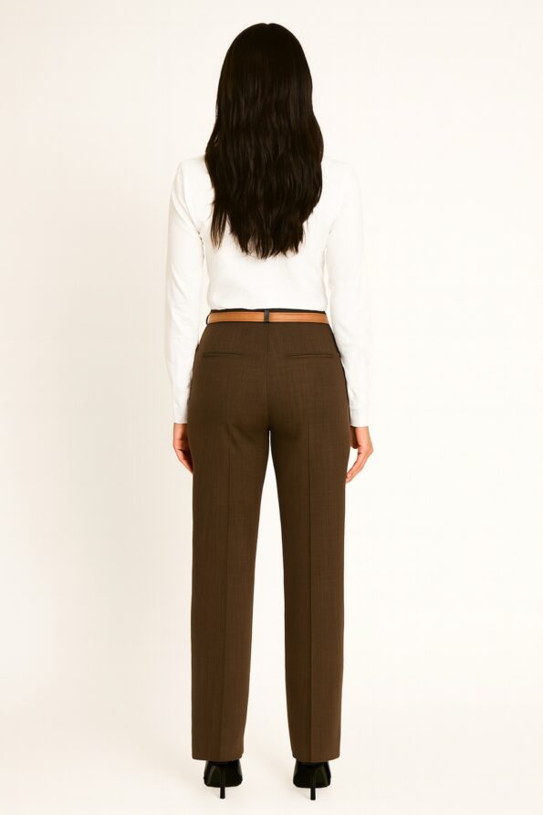 Pantalón de tiro medio con corte recto que aporta una silueta moderna y equilibrada, incluye cinturón desmontable con hebilla cuadrada metálica que realza el diseño, pinzas frontales que estructuran la forma y brindan ajuste cómodo, bolsillos laterales funcionales, confeccionado en tejido firme con textura suave que mantiene su forma y ofrece movilidad durante el día