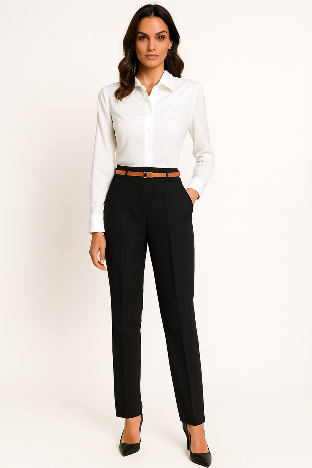 Pantalón formal con tela stretch de textura lisa que se ajusta al cuerpo de forma cómoda con pretina ancha de estructura firme que incluye doble botón metálico al frente con cierre oculto que aporta seguridad al vestir con trabillas visibles que sostienen cinturón delgado con hebilla metálica incluida con costuras al frente que estilizan visualmente, para quienes buscan un look formal