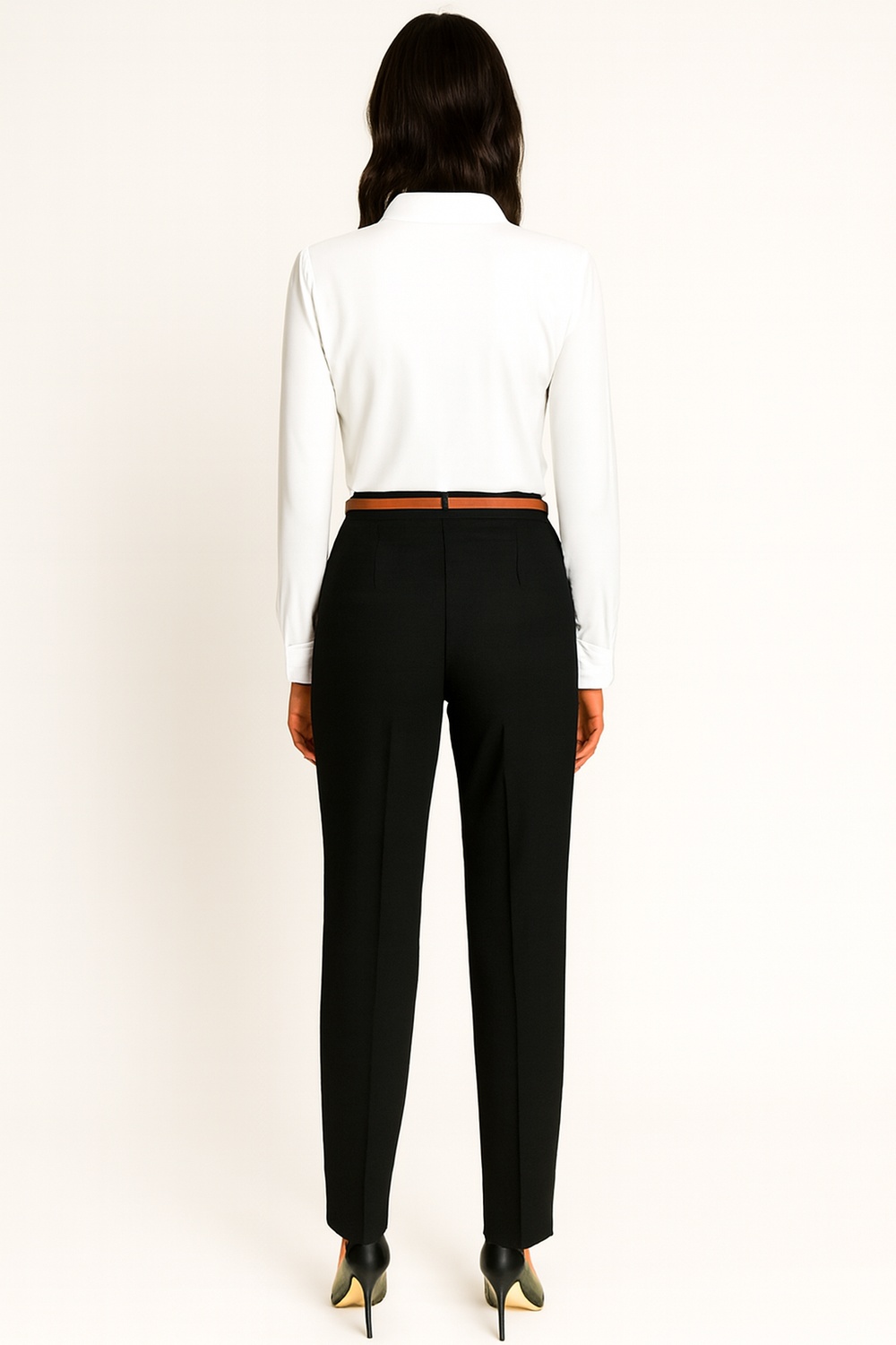 Pantalón con estructura slim fit y diseño de cintura alta, cinturilla con detalle decorativo que simula cinto metálico, bolsillos laterales y posteriores falsos que aportan estilo sin volumen, pretina elástica para mayor ajuste y confort, tela suave y ligeramente stretch en tono negro ideal para looks de oficina
