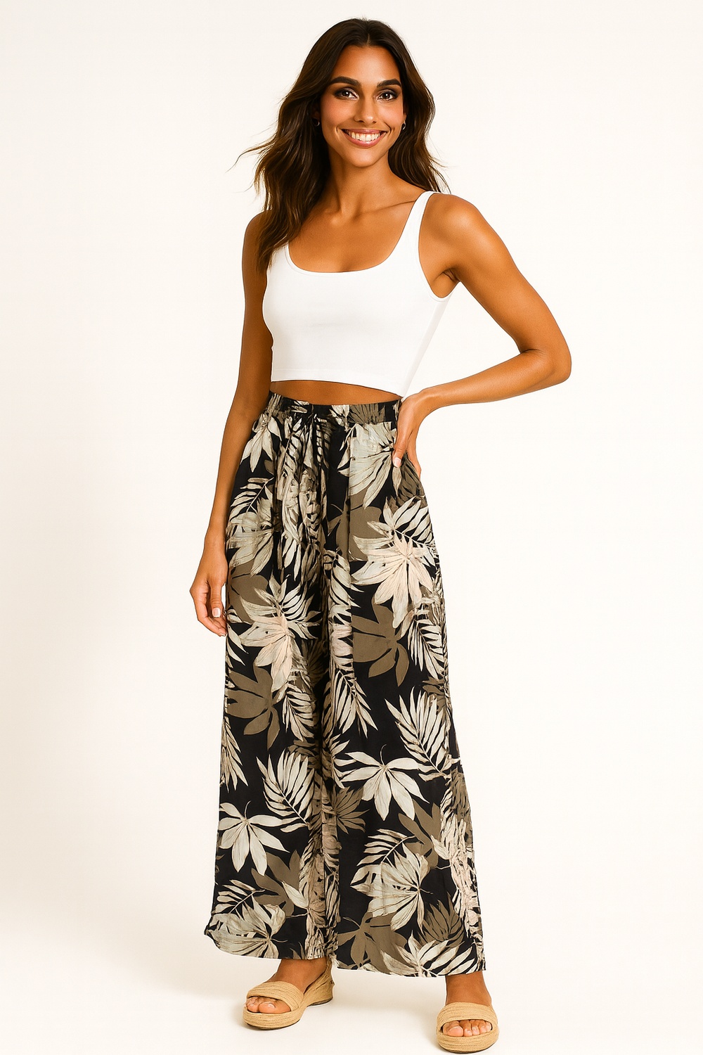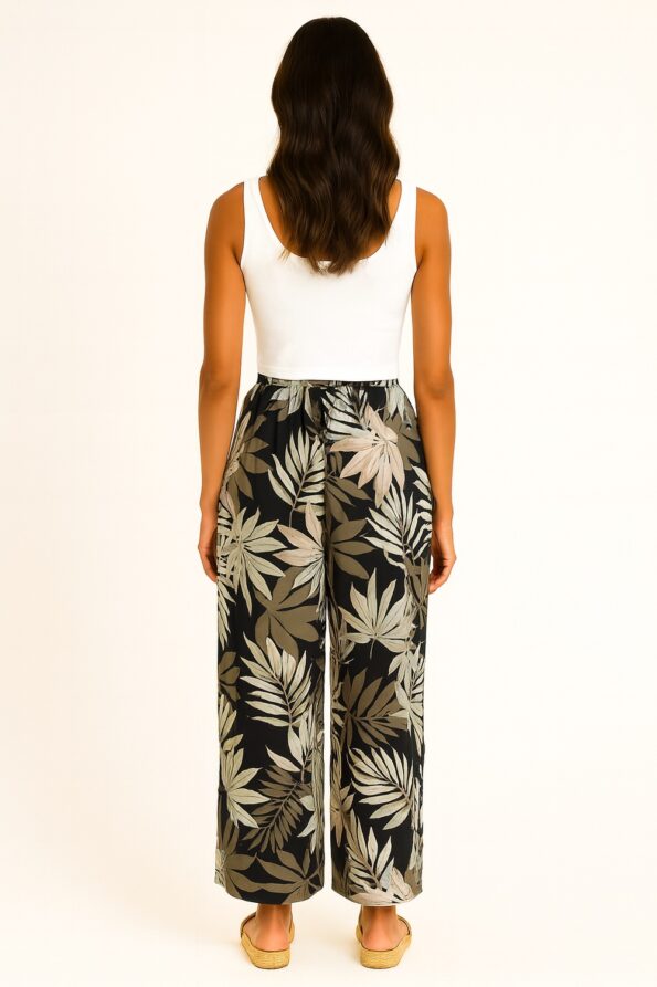 Pantalón de corte amplio con pretina elástica posterior que brinda comodidad, cinta delantera para anudar que permite un ajuste personalizado, confección en tejido ligero con caída fluida que favorece la movilidad, largo completo que estiliza la silueta y terminados prolijos que aportan un acabado moderno y versátil