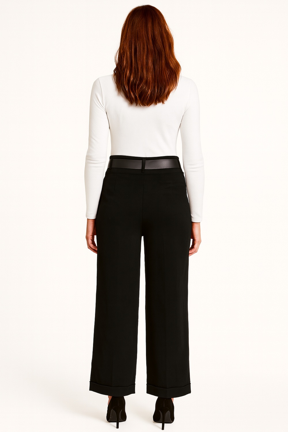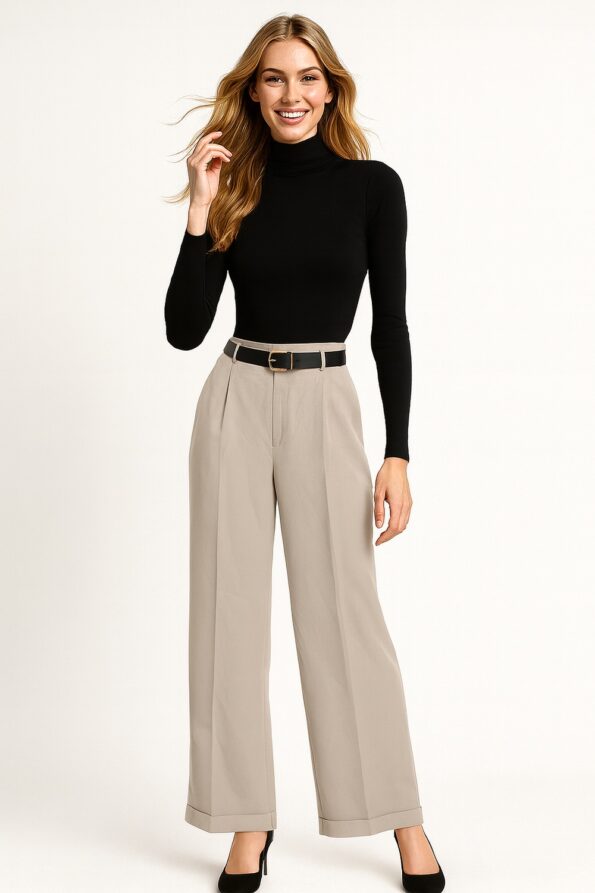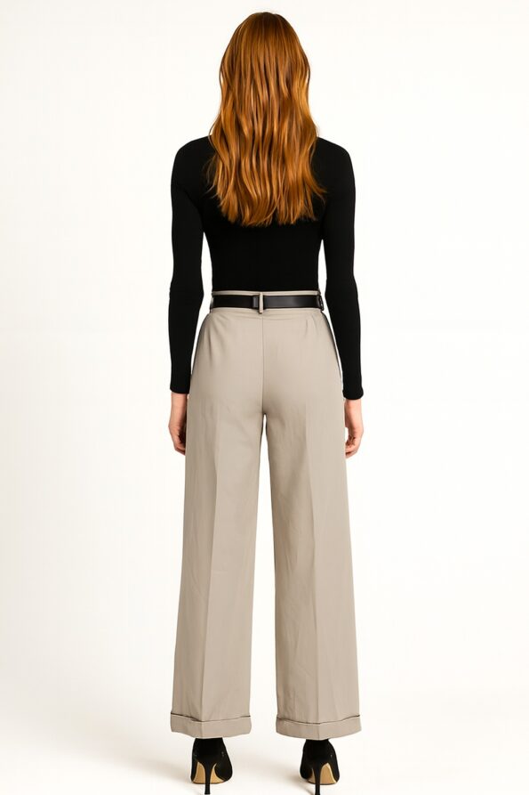 Pantalón de tiro alto con pinzas frontales que aportan estructura, pretina con trabillas y cinturón incluido que define la cintura, corte amplio de pierna recta que brinda comodidad, confección en tejido firme con caída fluida que conserva la forma, ideal para un look moderno y versátil