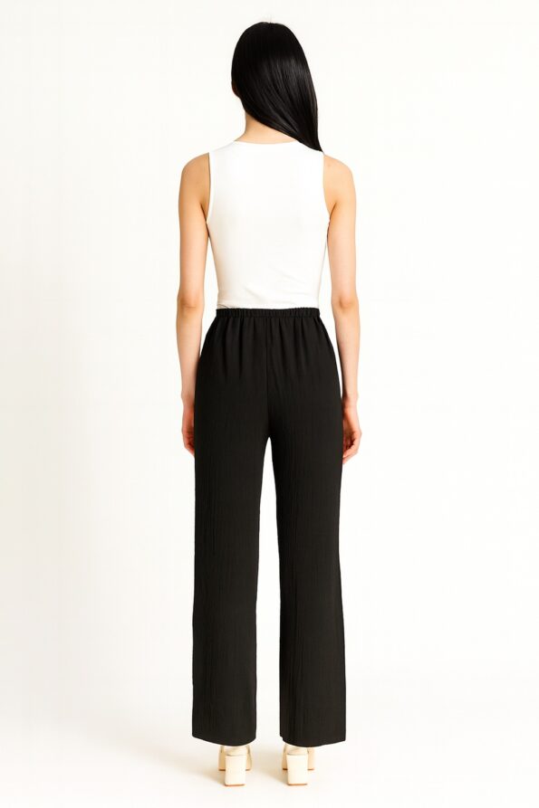 Pantalón de corte recto con pretina elástica que brinda ajuste cómodo, jareta frontal con cordón para adaptar la cintura, silueta relajada que favorece la movilidad, confección en tejido ligero de textura suave que proporciona frescura durante el día, terminado con costuras limpias que aportan un acabado moderno y casual