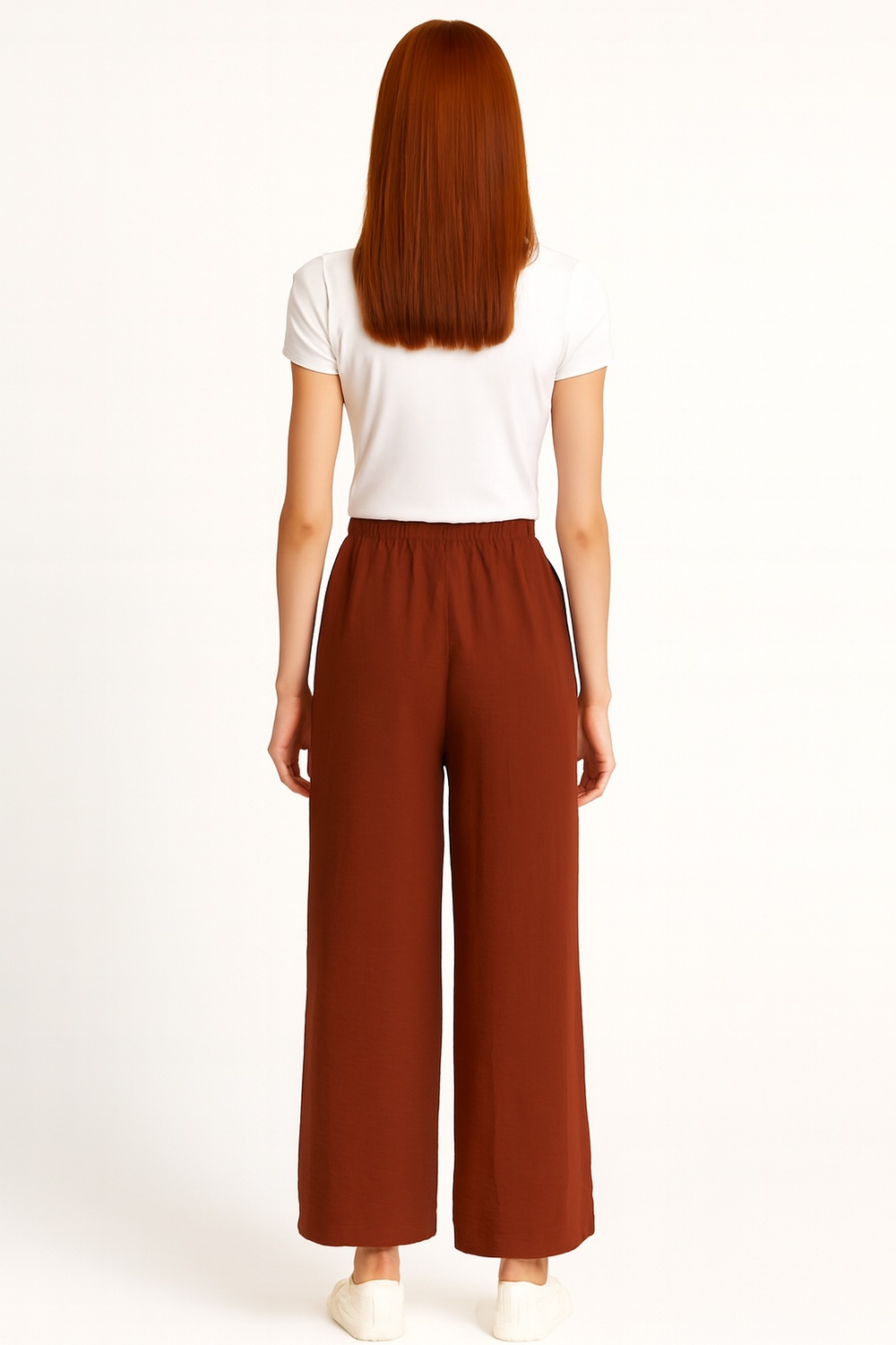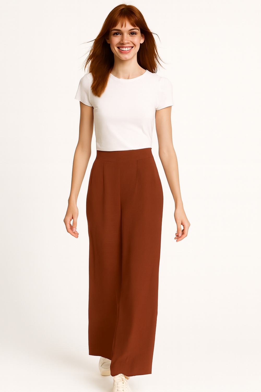 Pantalón de tiro alto con corte amplio y pinzas al frente que aportan estructura, pretina ancha con ajuste seguro, caída fluida y textura suave que brinda comodidad y elegancia casual