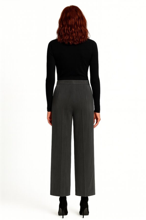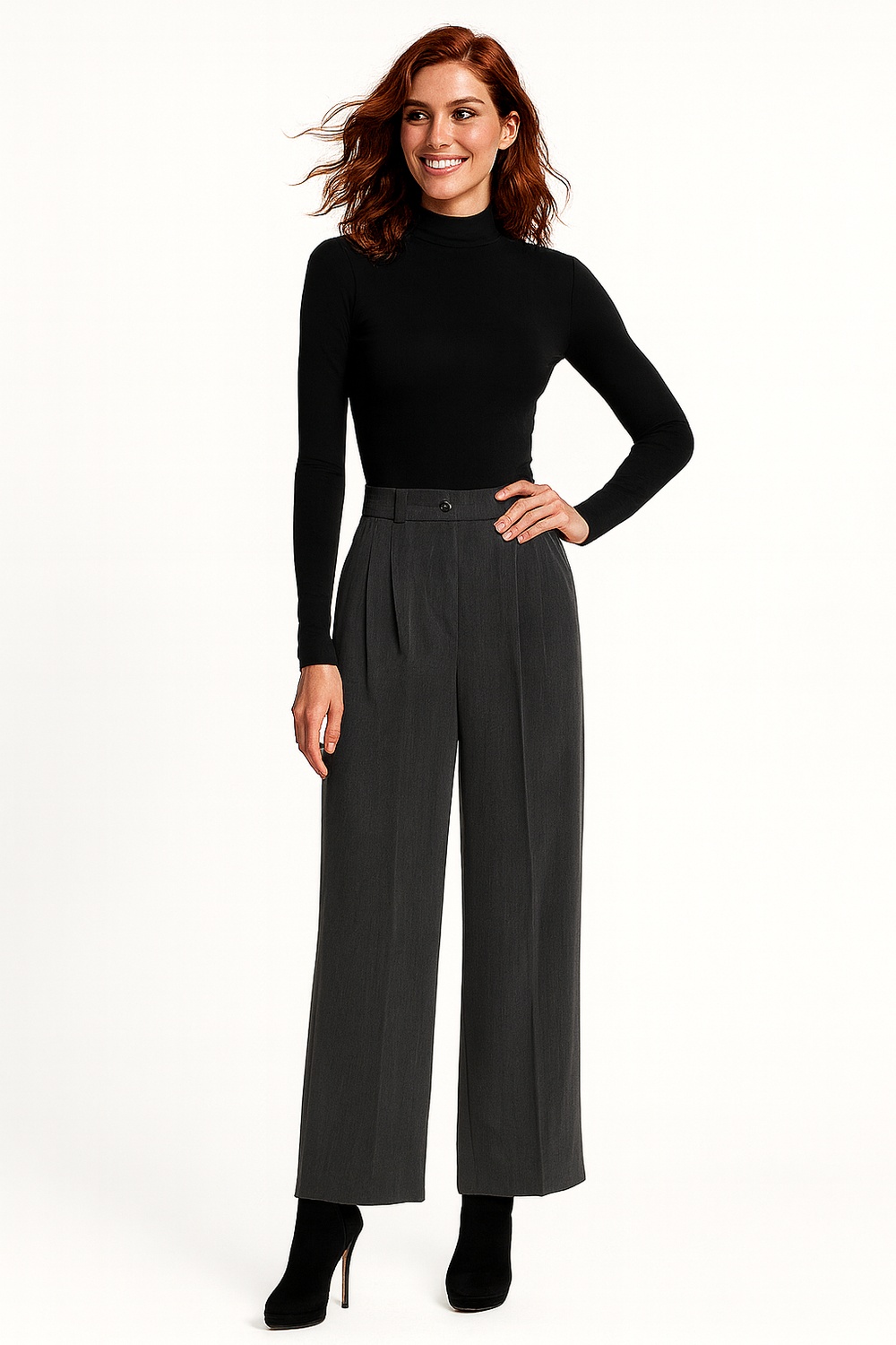 Pantalón de tiro alto con pinzas frontales que aportan estructura y elegancia, pretina con trabillas y cierre frontal con botón que aseguran un ajuste firme, bolsillos laterales funcionales que añaden practicidad, corte amplio que ofrece comodidad y libertad de movimiento, confeccionado en tejido suave con caída natural ideal para looks casuales o formales