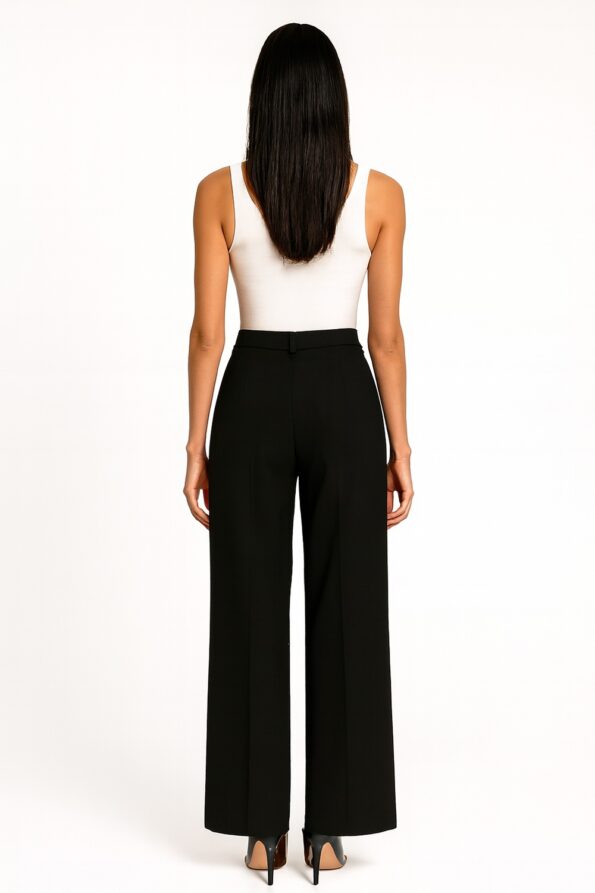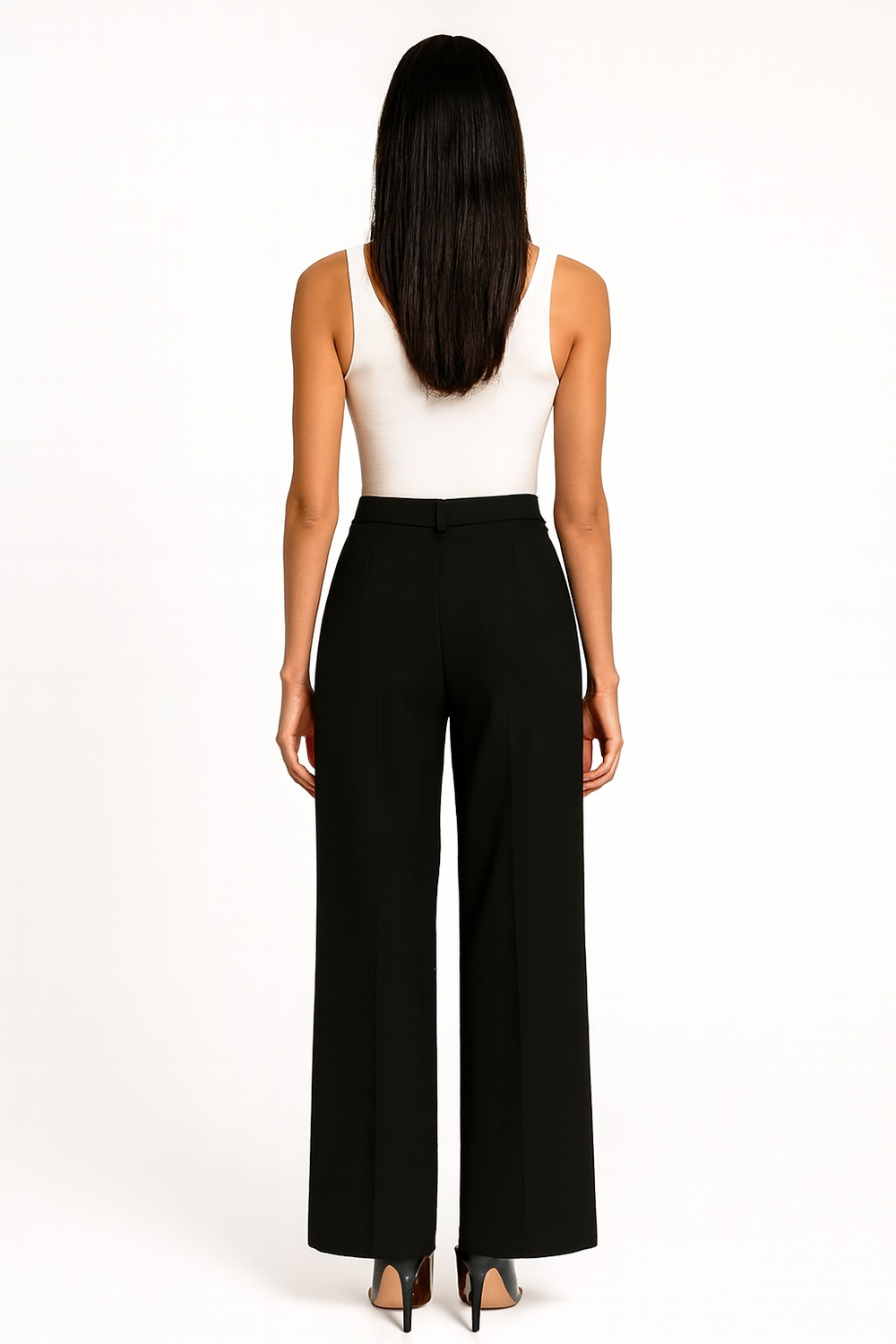 Pantalón tiro alto con pinzas frontales redefine el look formal con una silueta afilada que alarga la figura mientras su triple botón en la pretina aporta un acento moderno y sofisticado su corte recto con caída estructurada, ideal para looks de oficina