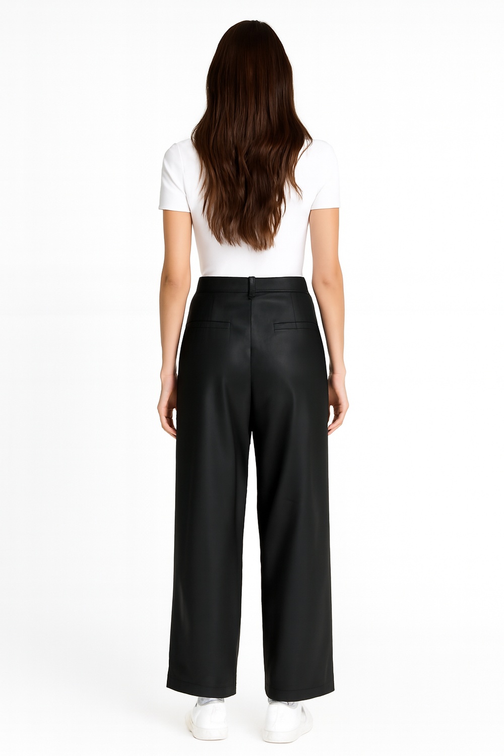 Pantalón de corte amplio confeccionado en material tipo PVC de textura suave, pretina con trabillas y cierre frontal con botón y cremallera, bolsillos funcionales laterales, estructura fluida que aporta comodidad al movimiento, acabado brillante con costuras reforzadas para un look moderno y audaz