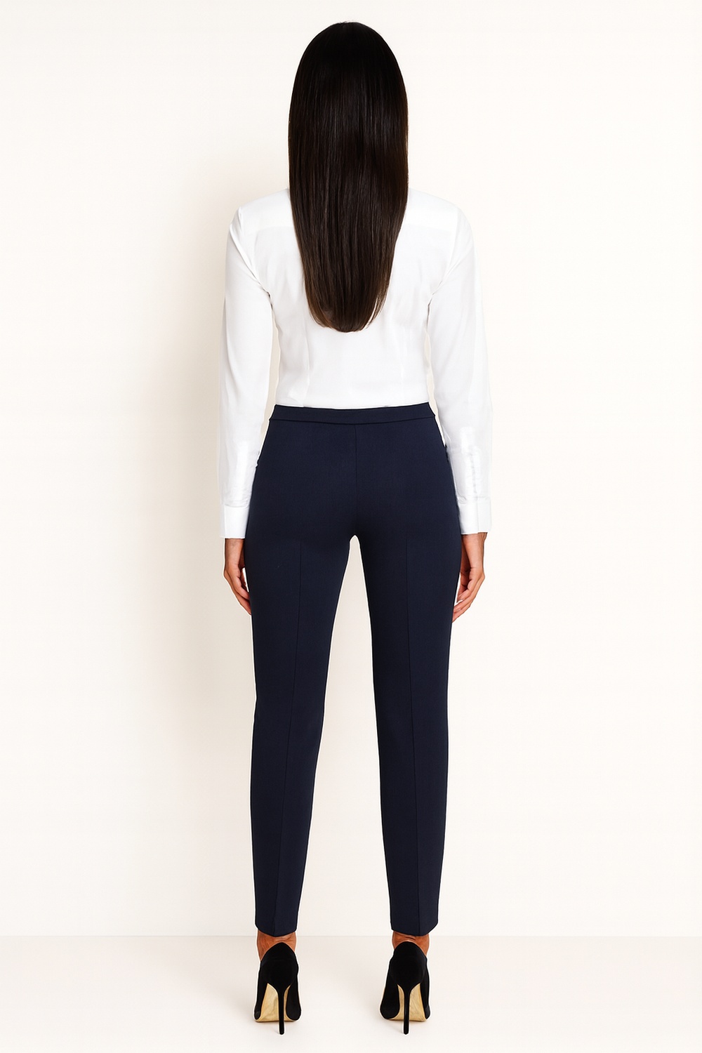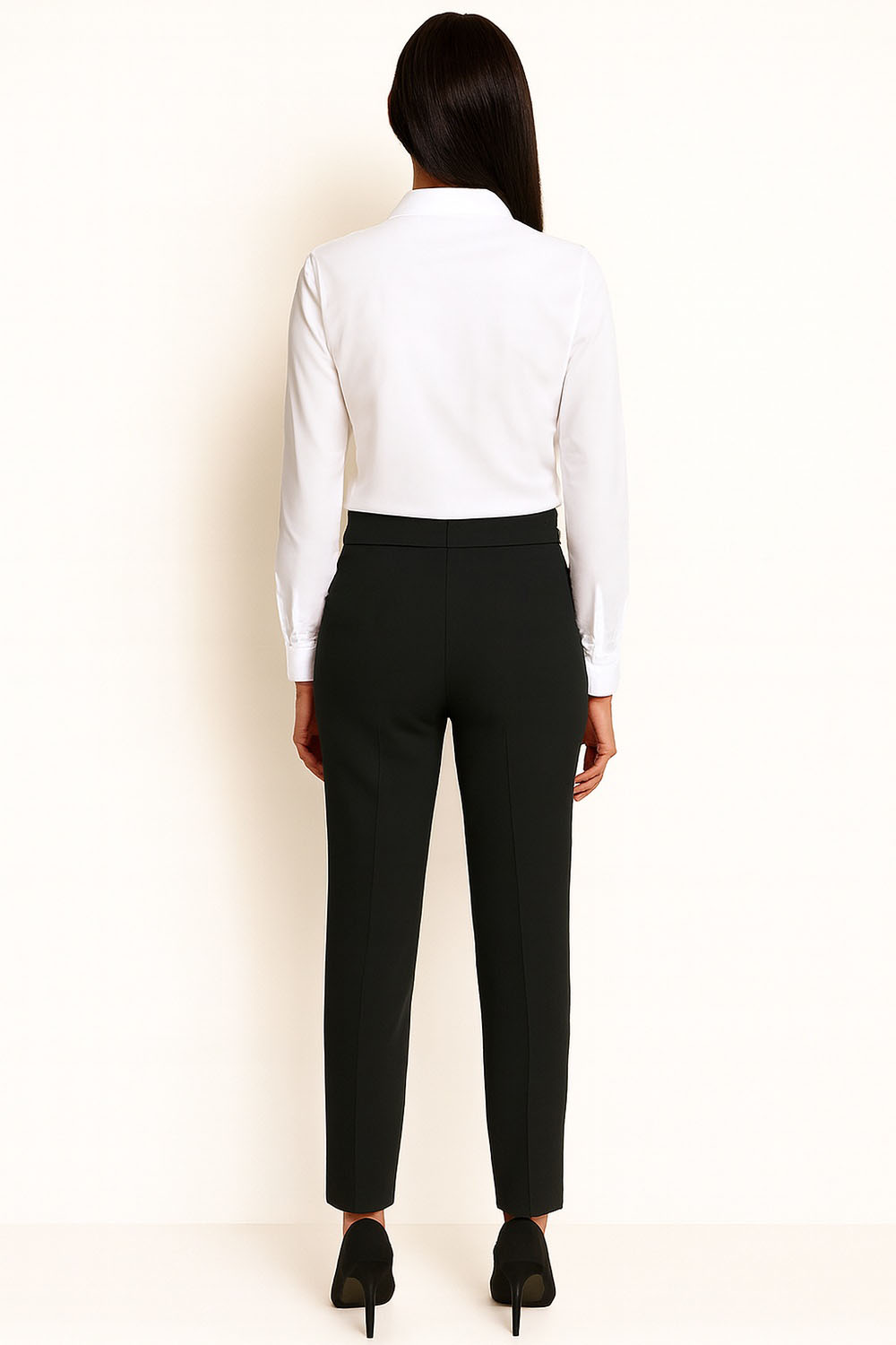 Pantalón de pretina dividida con doble trabilla que ofrece ajuste firme y mayor soporte, cierre frontal con botón metálico y cremallera oculta que aportan funcionalidad, bolsillos laterales discretos que brindan practicidad, corte recto con planchado marcado al frente que estiliza la silueta y alarga visualmente las piernas, confección en tela estructurada que conserva la forma y permite comodidad durante el uso diario o en ocasiones formales