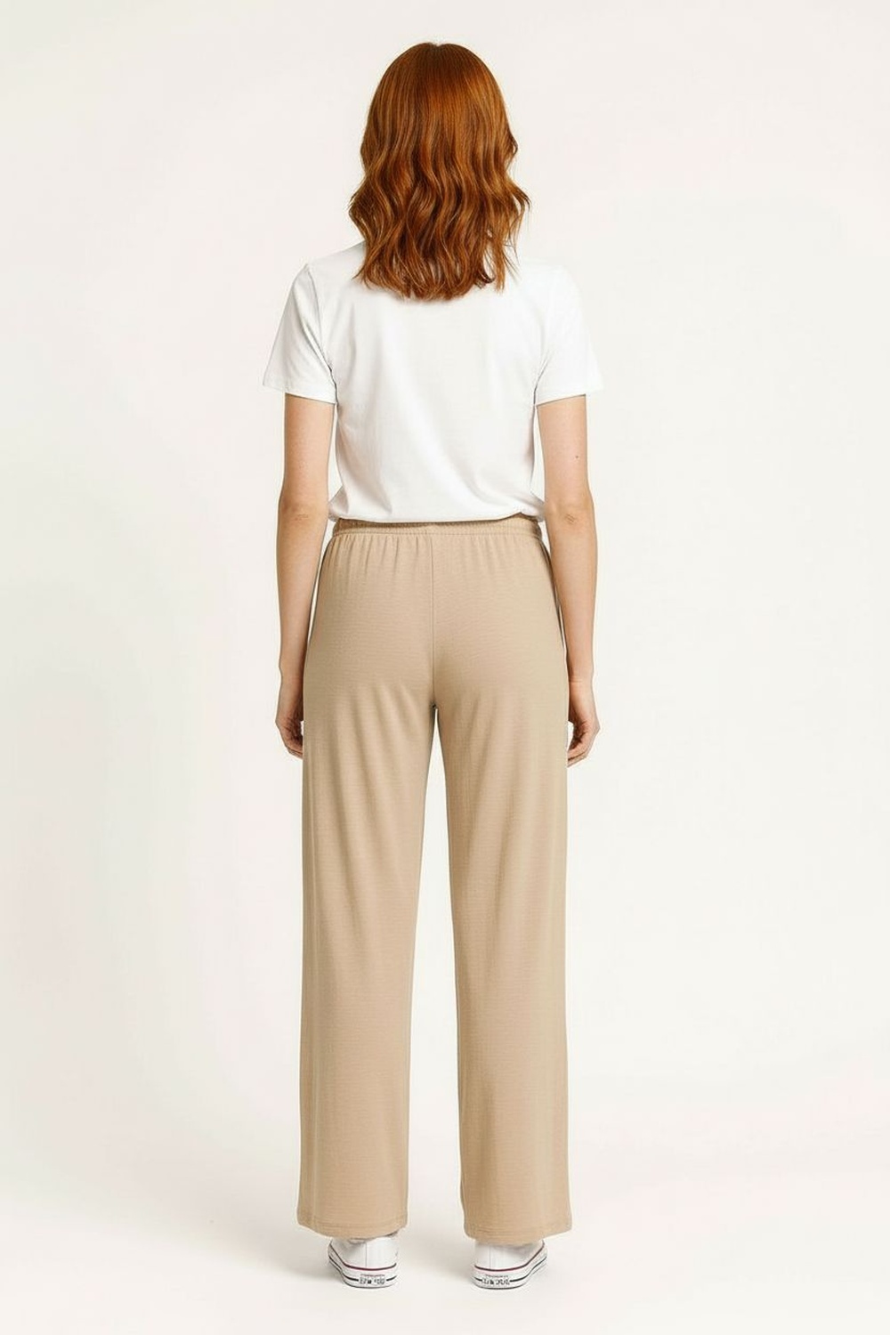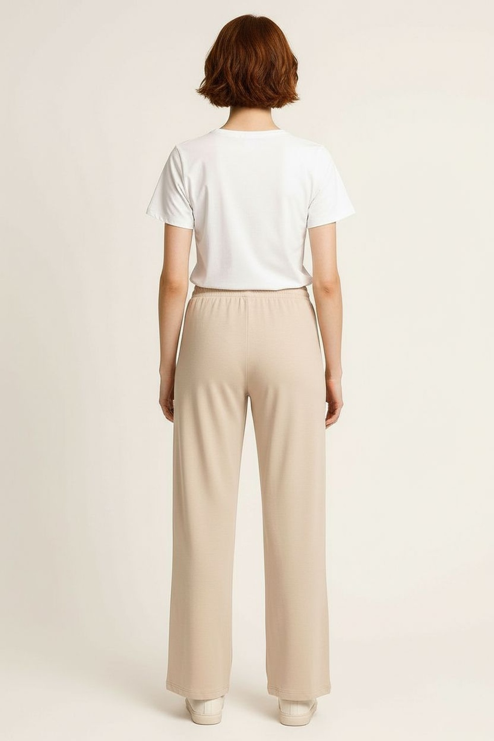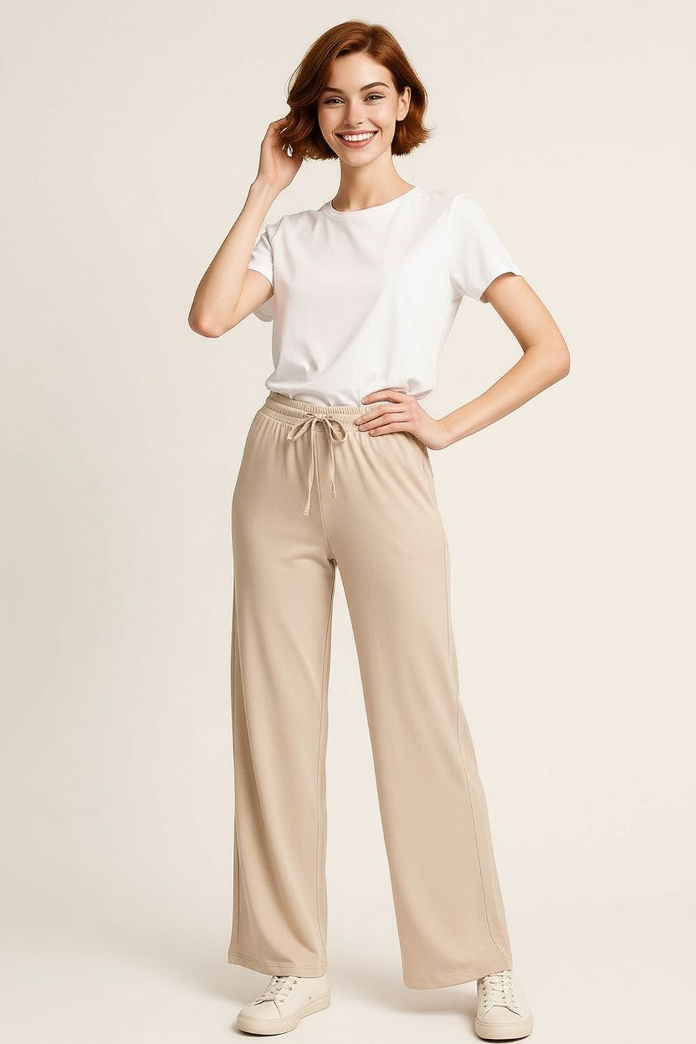 Pantalón de pierna amplia con caída fluida que alarga visualmente la figura, pretina elástica de ajuste cómodo que se adapta a la cintura, tiro medio que equilibra proporciones, corte recto desde cadera hasta bajo que aporta soltura, confección en tejido ligero de textura suave que brinda frescura y libertad de movimiento en cada paso