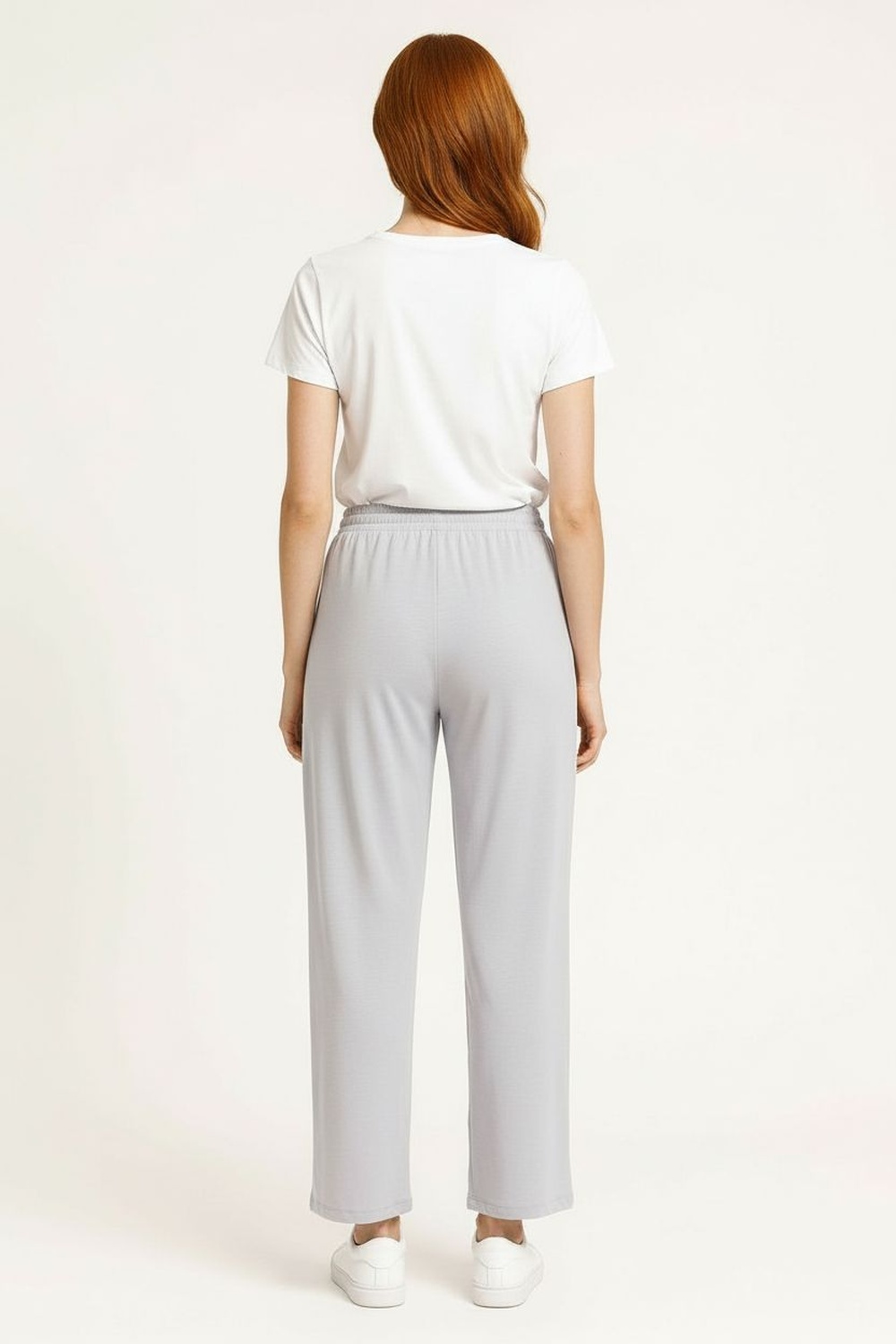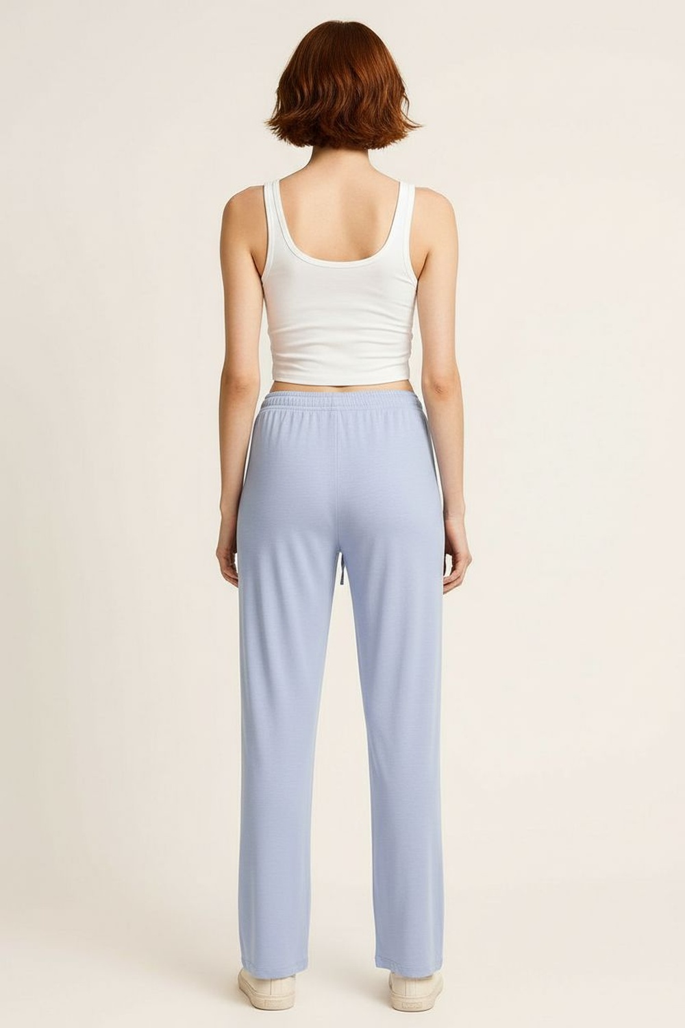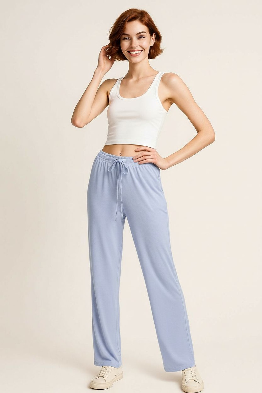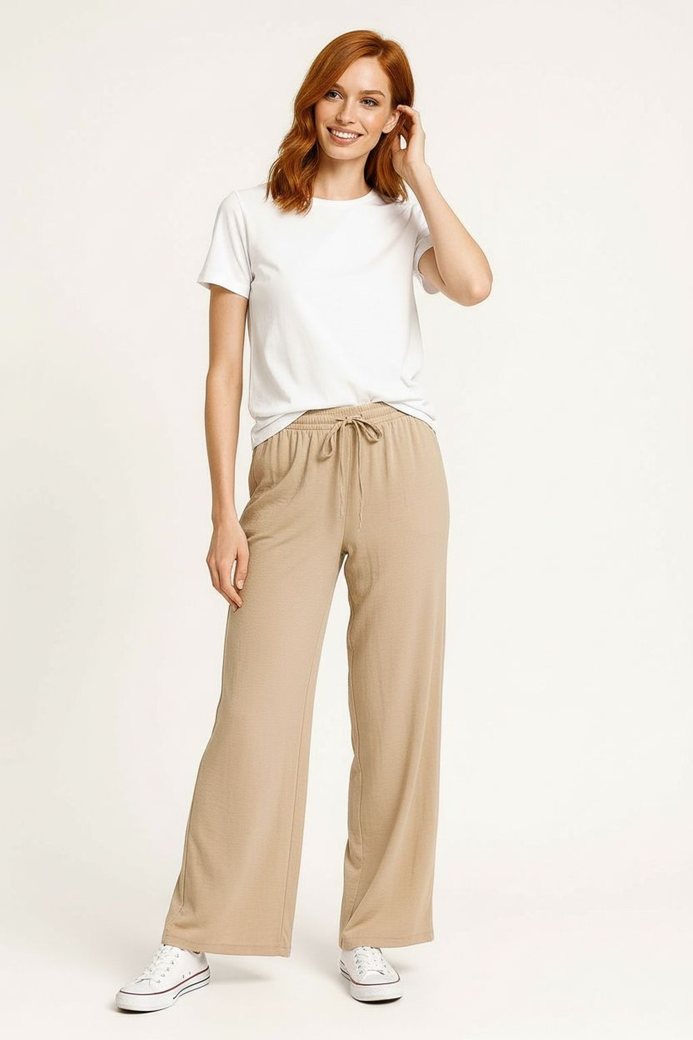 Pantalón de pierna amplia con caída fluida que alarga visualmente la figura, pretina elástica de ajuste cómodo que se adapta a la cintura, tiro medio que equilibra proporciones, corte recto desde cadera hasta bajo que aporta soltura, confección en tejido ligero de textura suave que brinda frescura y libertad de movimiento en cada paso