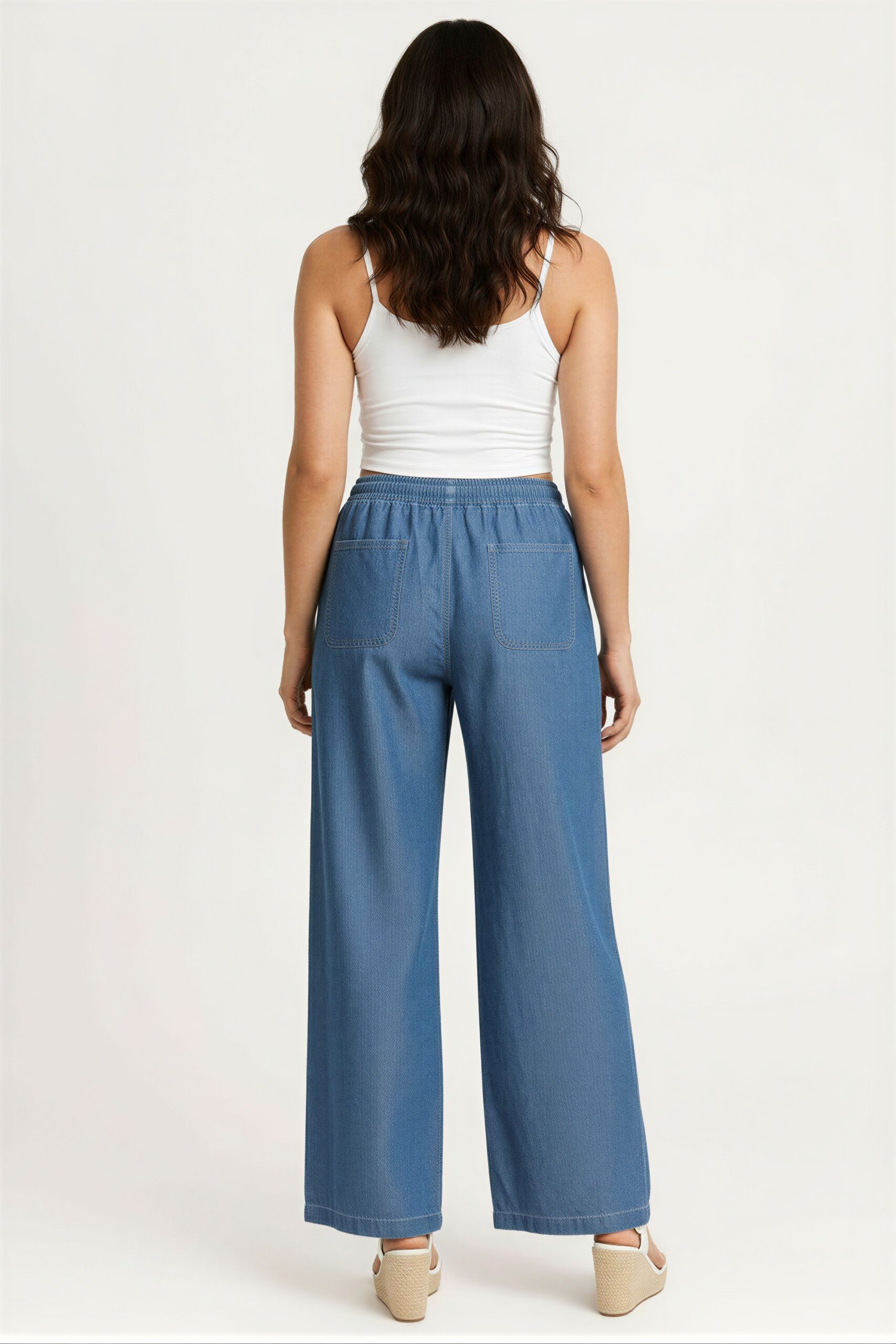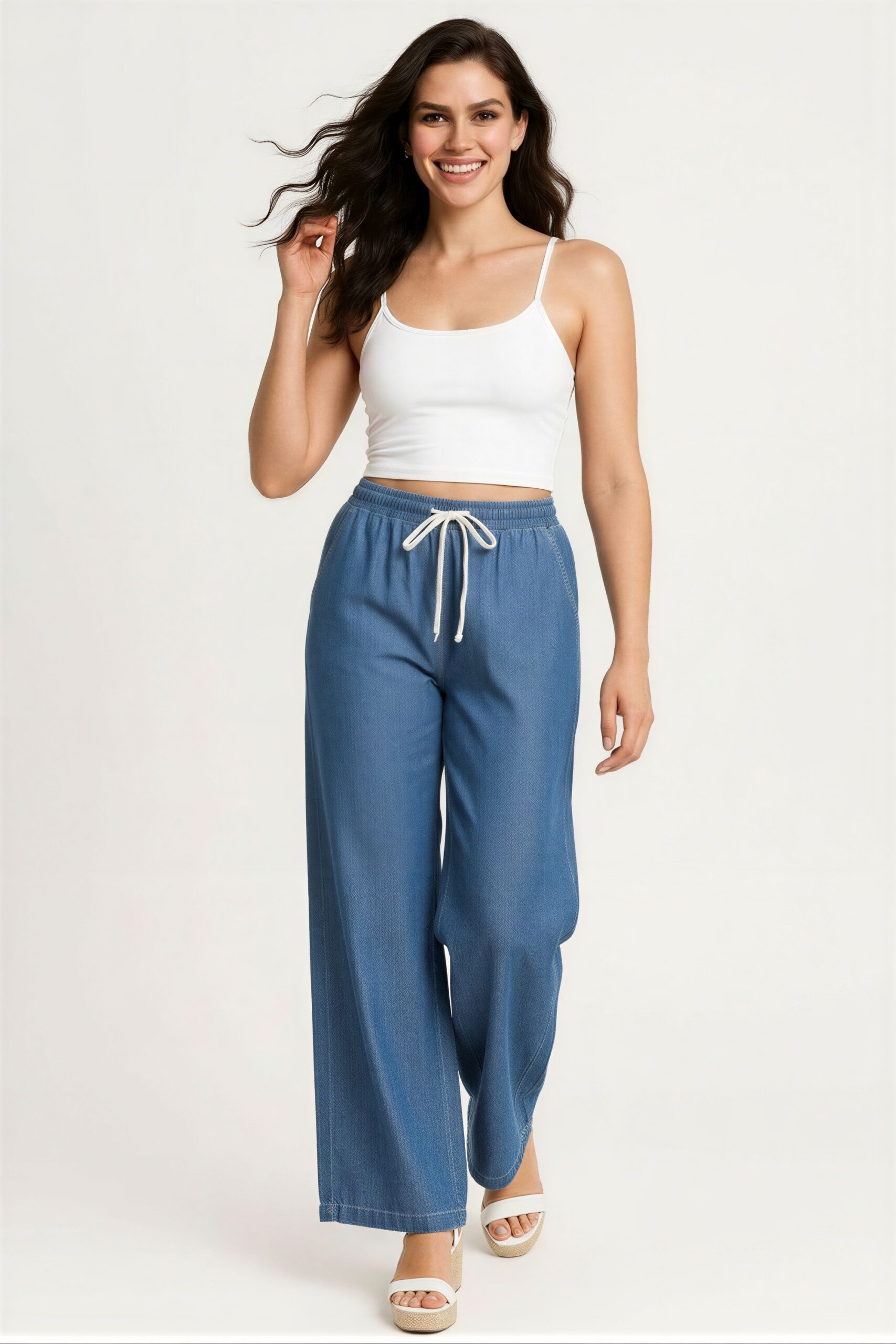 Pantalón de tiro medio con pretina elástica que brinda ajuste flexible, pierna recta de caída suave, largo al tobillo que estiliza visualmente, bolsillos funcionales delanteros y posteriores, confección en lyocell con textura ligera y sensación fresca al contacto con la piel