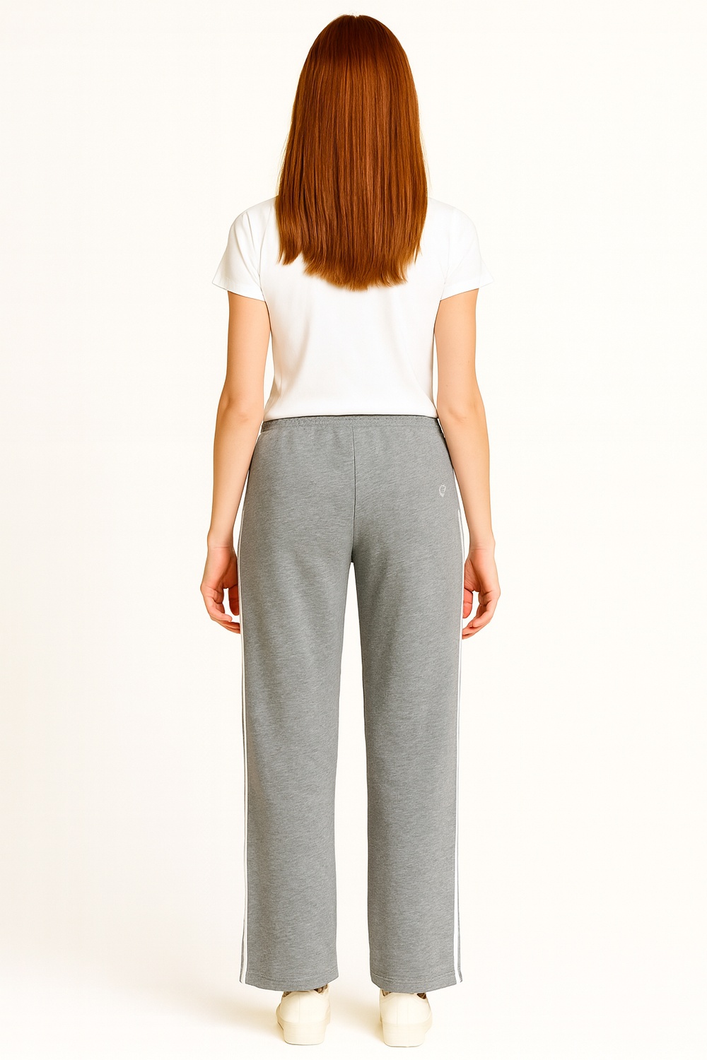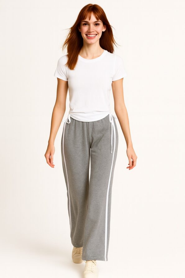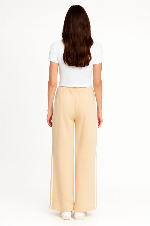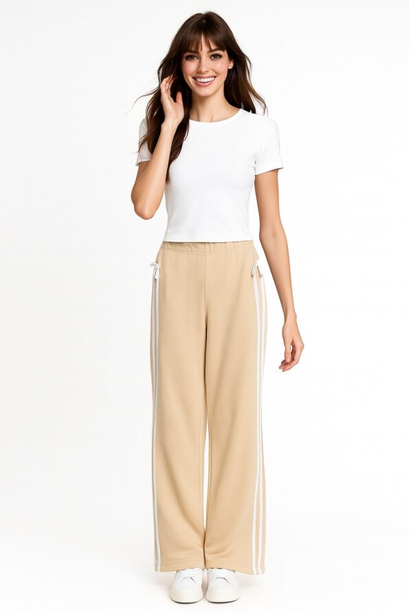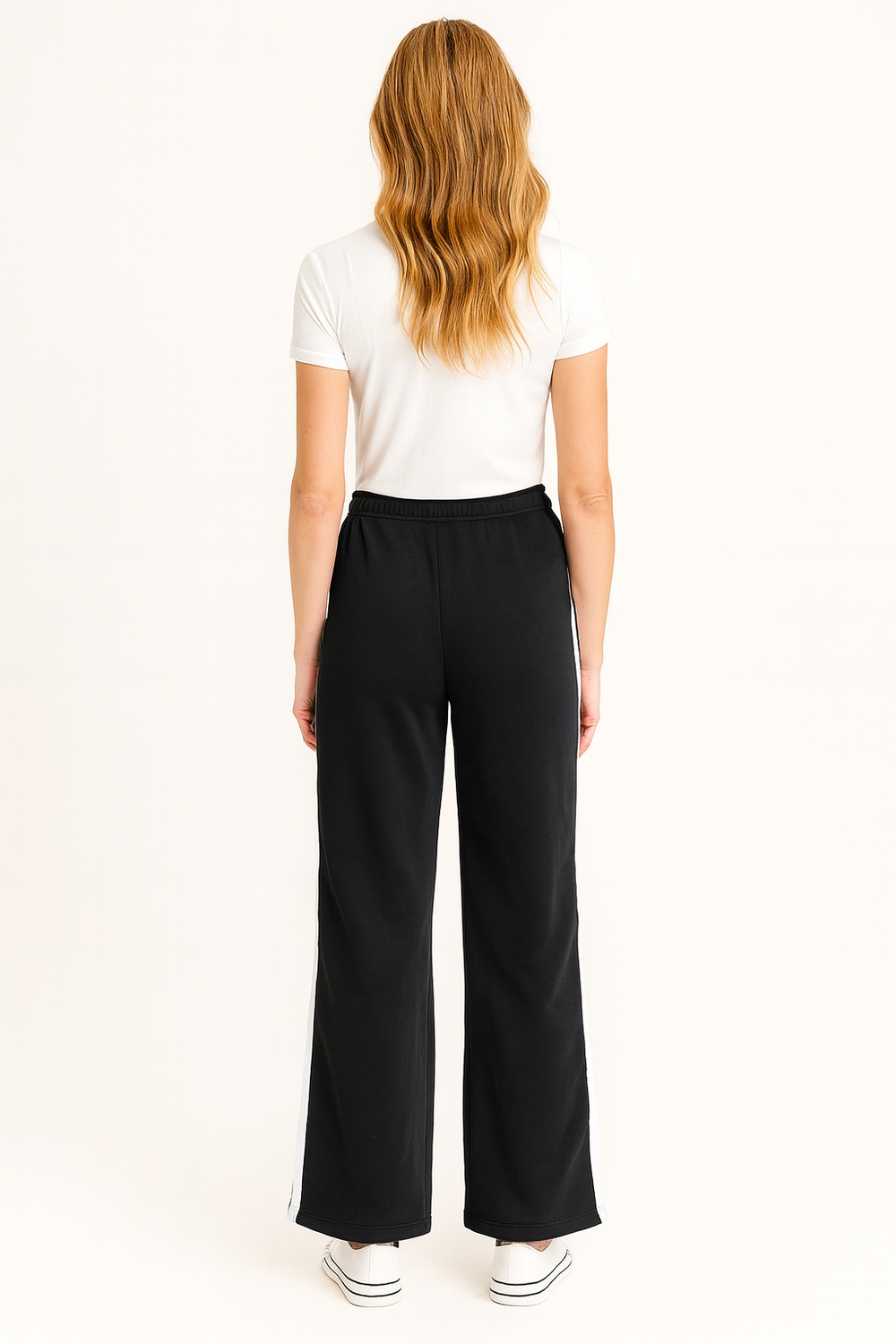 Pantalón deportivo en tejido french terry con corte amplio y caída recta, pretina ancha de tiro medio que brinda ajuste cómodo sin apretar, detalle de bies en contraste a lo largo de los costados que alarga visualmente la silueta y añade un toque sporty, ideal para looks relajados, outfits deportivos